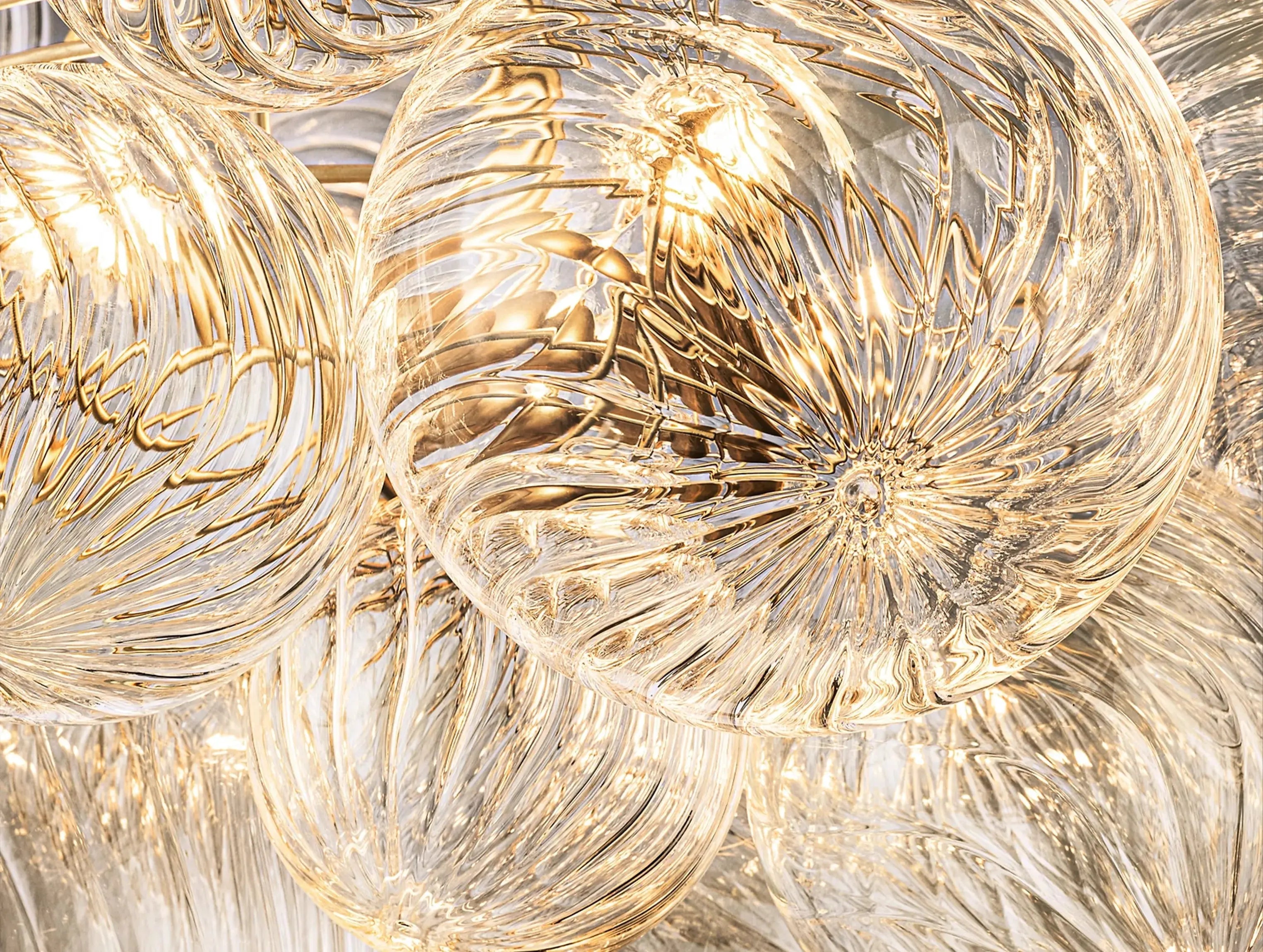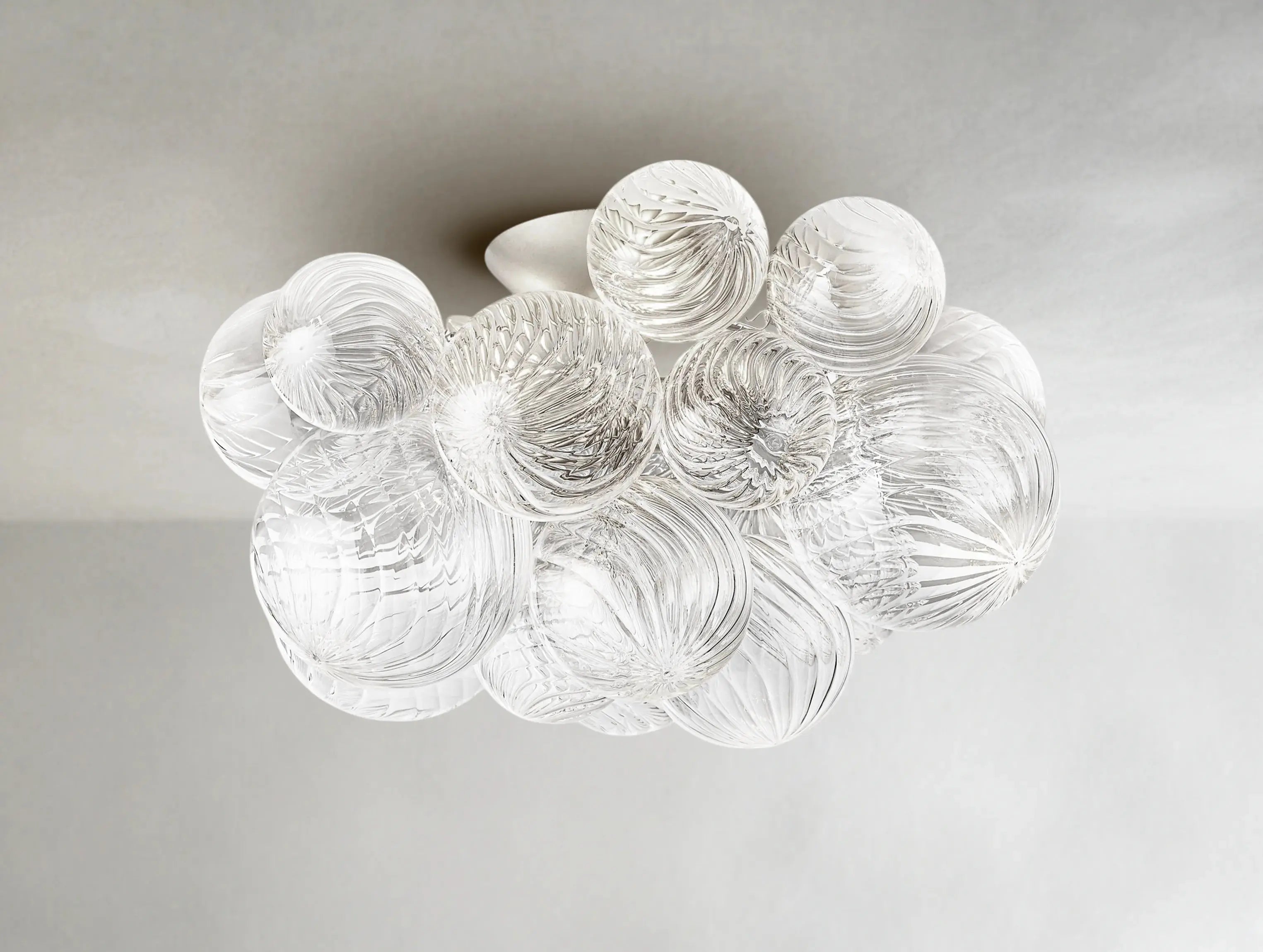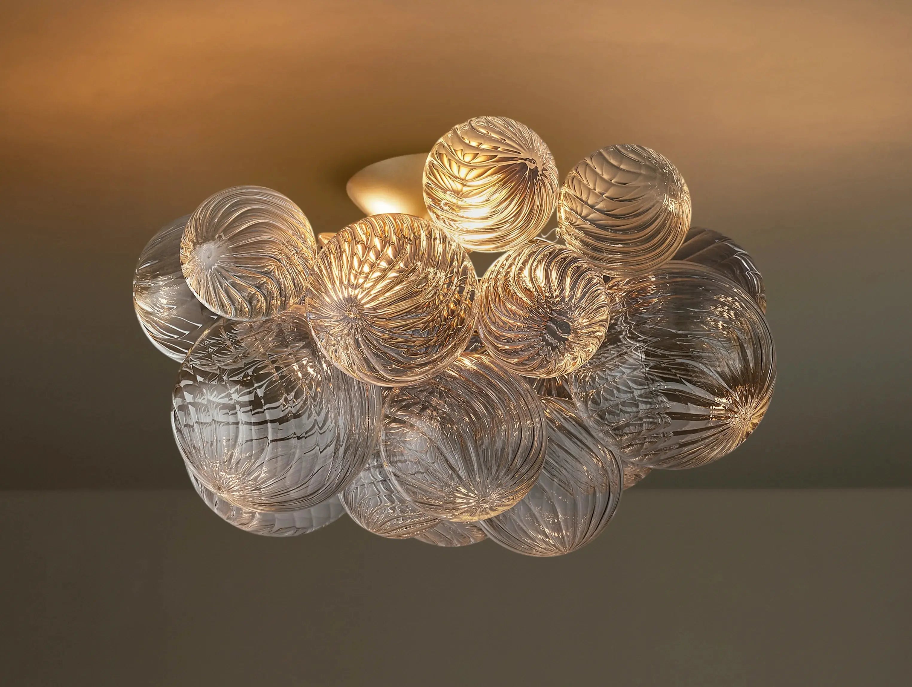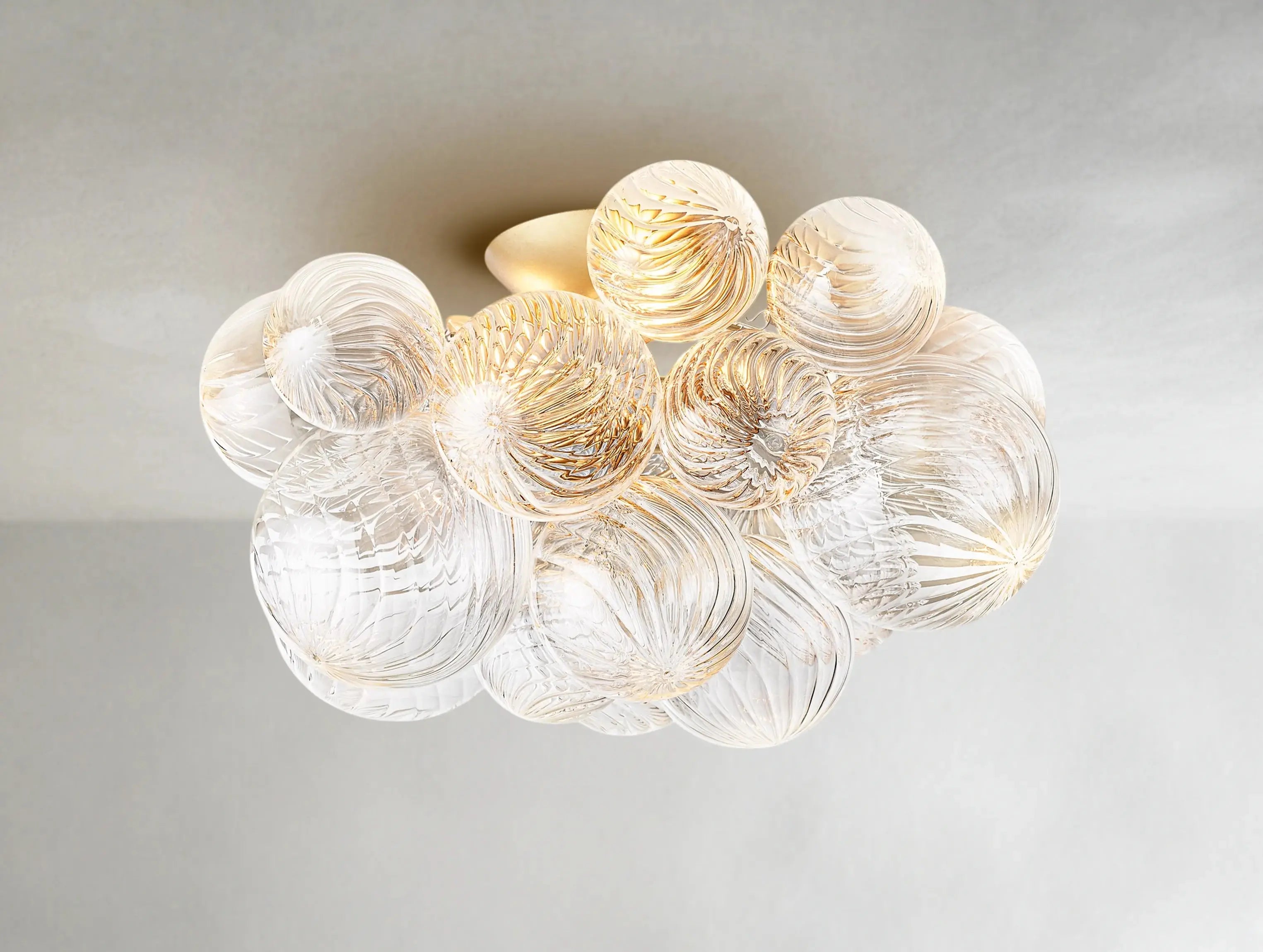 A low-profile centerpiece that doesn’t compromise on elegance. The Tolia Flushmount features a cluster of hand-blown swirled-glass orbs, arranged like floating bubbles around a sleek metal base. Each orb shimmers with rich texture, casting gentle ripples of light across the ceiling and walls. Designed by Ardenel, this flushmount reimagines the classic globe fixture into a sculptural form that’s both modern and timeless.