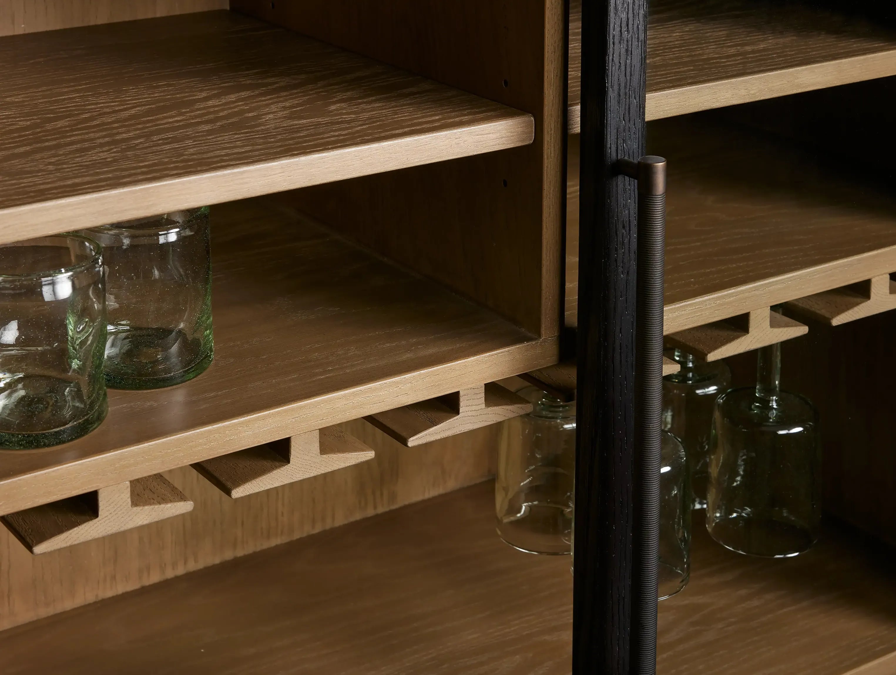 Handcrafted in Indonesia, it offers generous storage with adjustable shelves, stemware holders, and space for your favorite bottles. Brass-capped feet add a touch of elegance, while thoughtful details make it as functional as it is beautiful—ready to serve in any room.