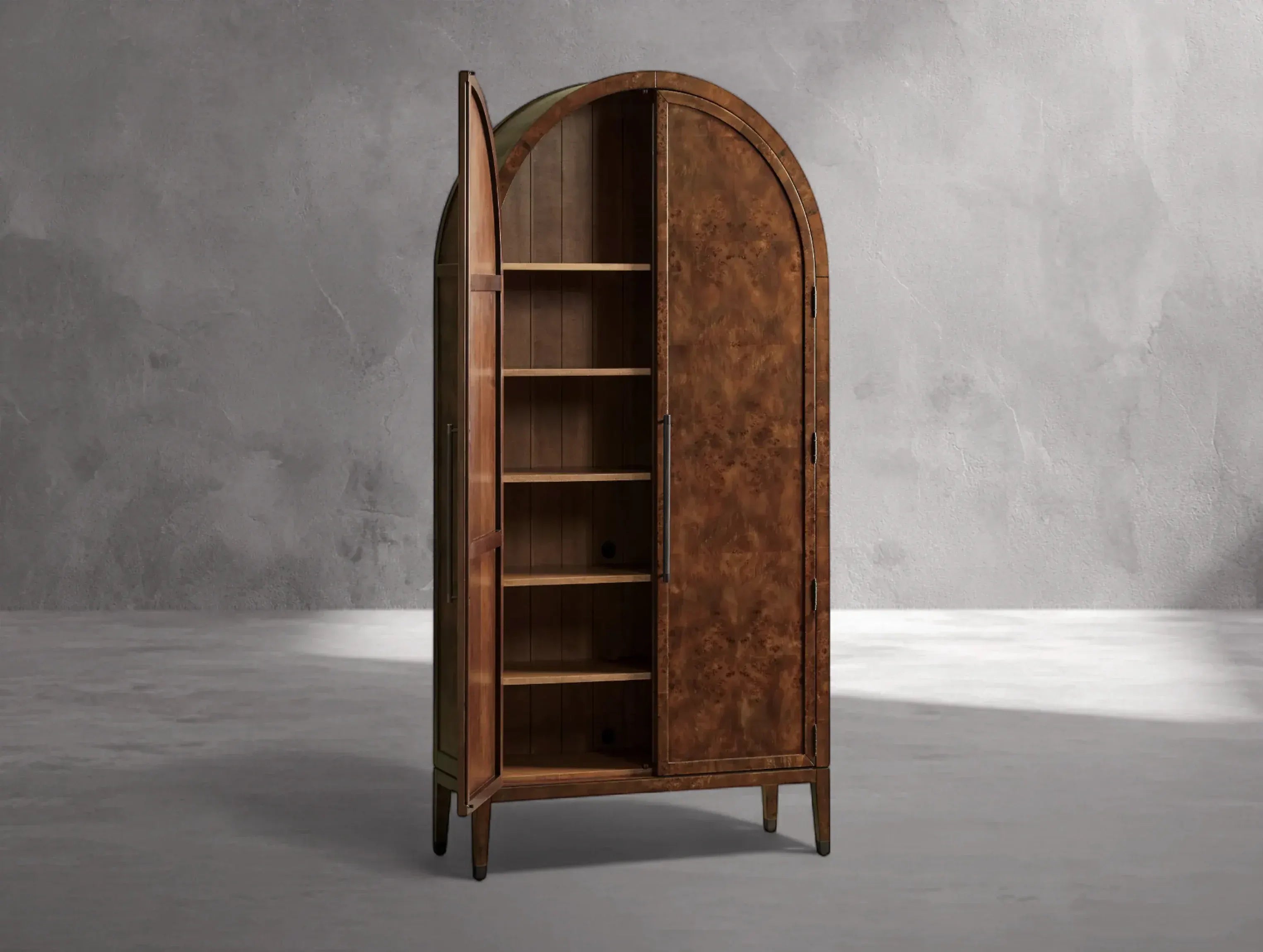 The Hottiy Burl Cabinet combines graceful curves with the intricate beauty of mappa burl veneer, making each piece a distinctive work of art. Crafted in China from solid oak, oak veneers, and mappa burl veneer, every cabinet is hand-finished to highlight the unique, swirling burl patterns. Shiplap back panels and contrasting finishes add depth, while exposed hinges, antiqued reeded hardware, and brass-capped feet provide refined character. Inside, five shelves offer generous storage, and discreet cord management keeps electronics organized. Solid aluminum alloy knurled handles complete the design with a touch of artisanal craftsmanship.