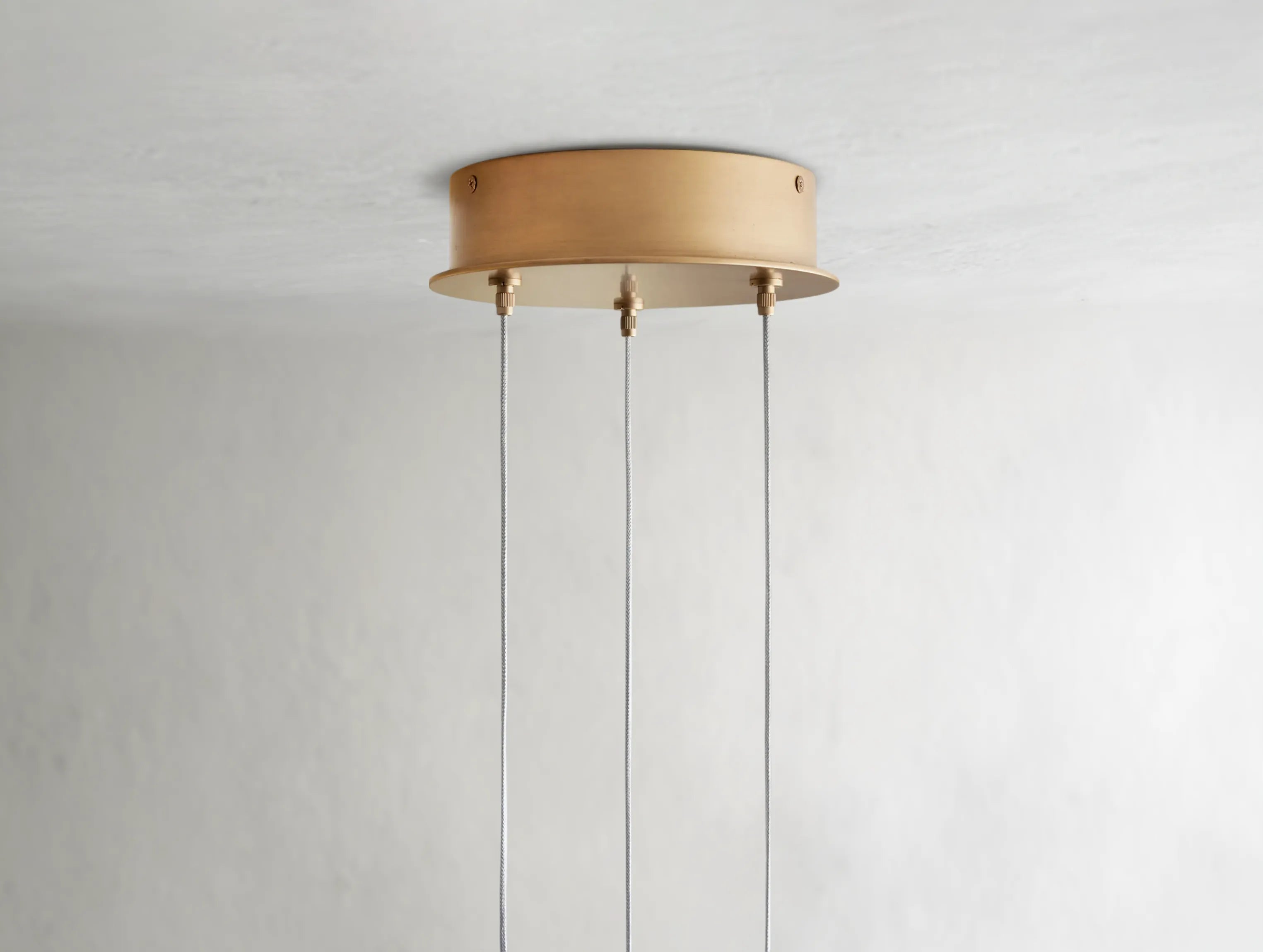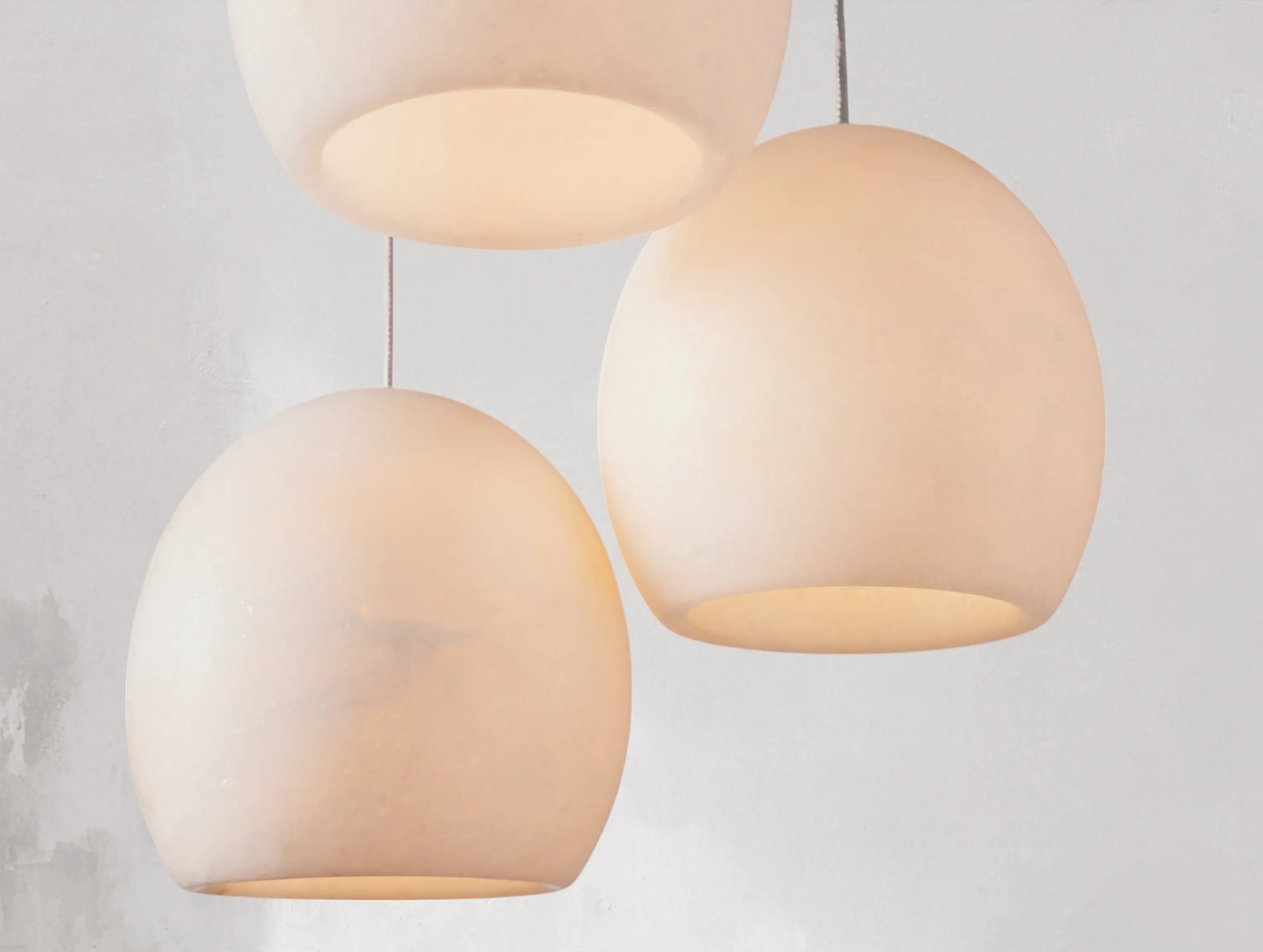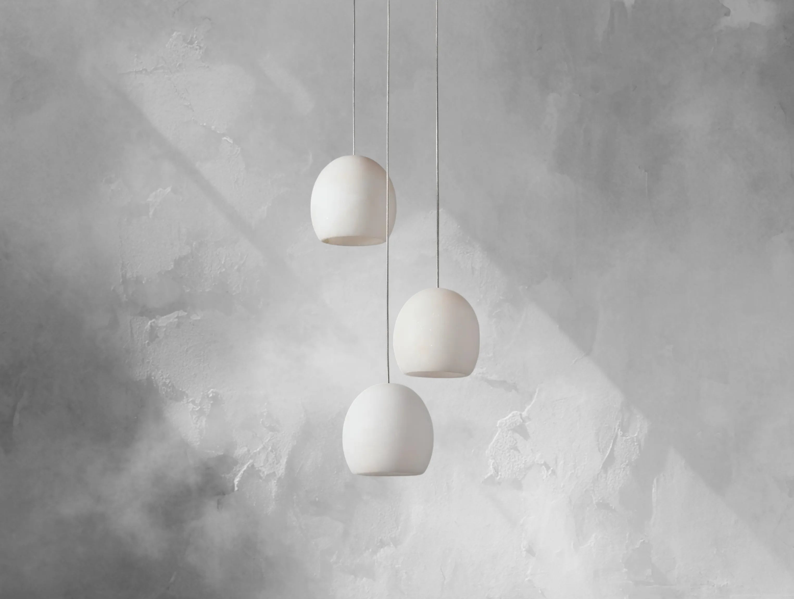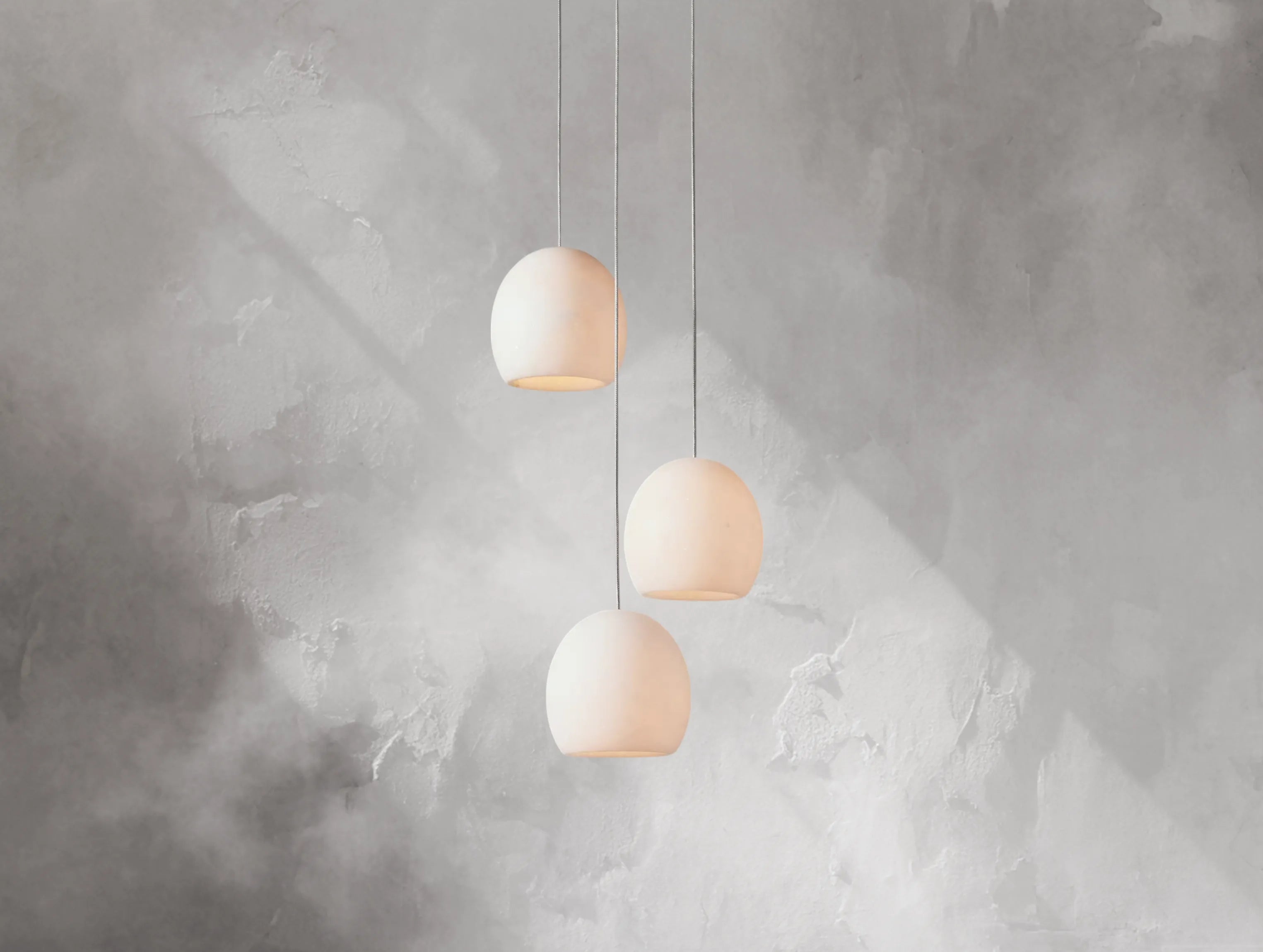 Airy and sculptural, the Beria Round Chandelier turns natural materials into an artful lighting installation. Crafted from hand-carved alabaster stone, each softly curved shade reveals the stone’s one-of-a-kind veining, giving every pendant its own unique character. Suspended by exposed aircraft cables, each light floats at an adjustable height, allowing for a custom cascade that suits your space. Whether you choose the understated 3-light version or the dramatic 36-light configuration, this chandelier brings organic warmth and elegance to any room. Includes bulbs.
