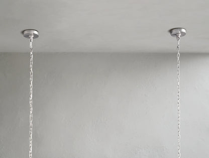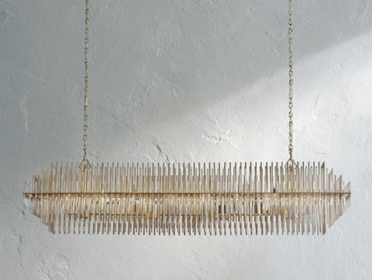 Designed by Adam Grant and inspired by a bold 1970s aesthetic, this rectangular chandelier showcases multiple tiers of slender brass, iron, and acrylic rods. The graduated arrangement filters the light within, producing a sculptural glow that commands attention. Its elongated form makes it a striking focal point over dining tables, kitchen islands, or long hallways.