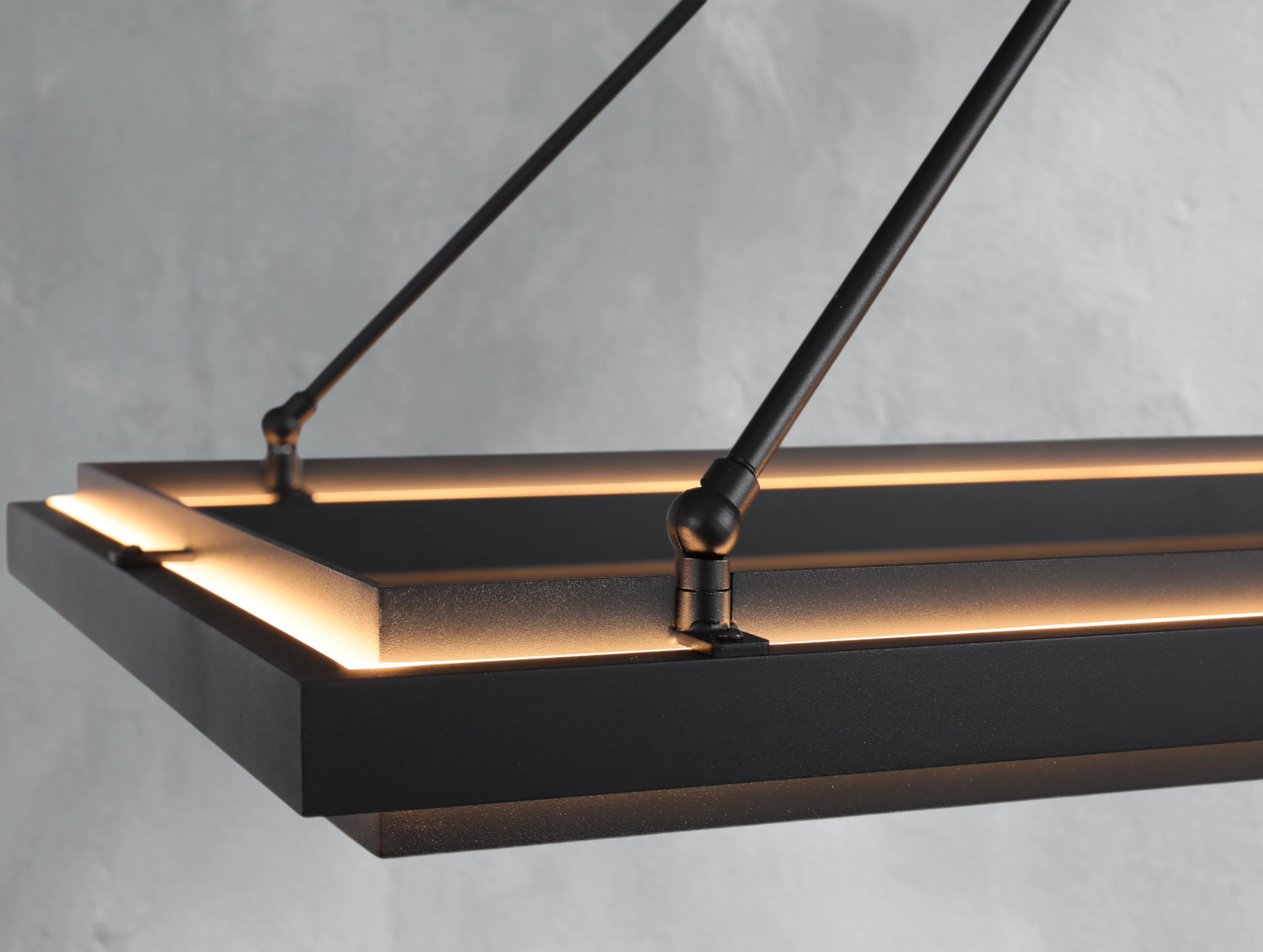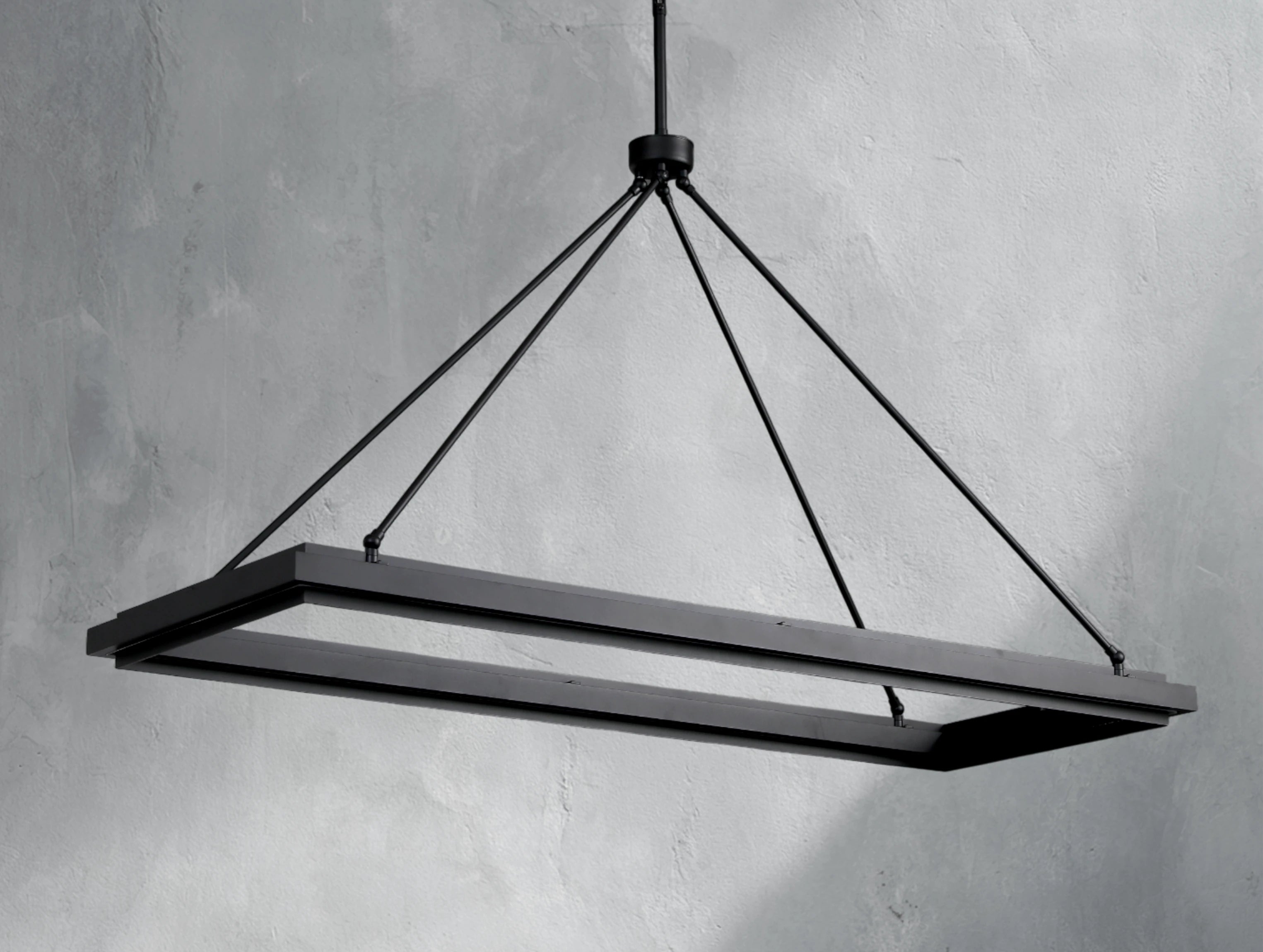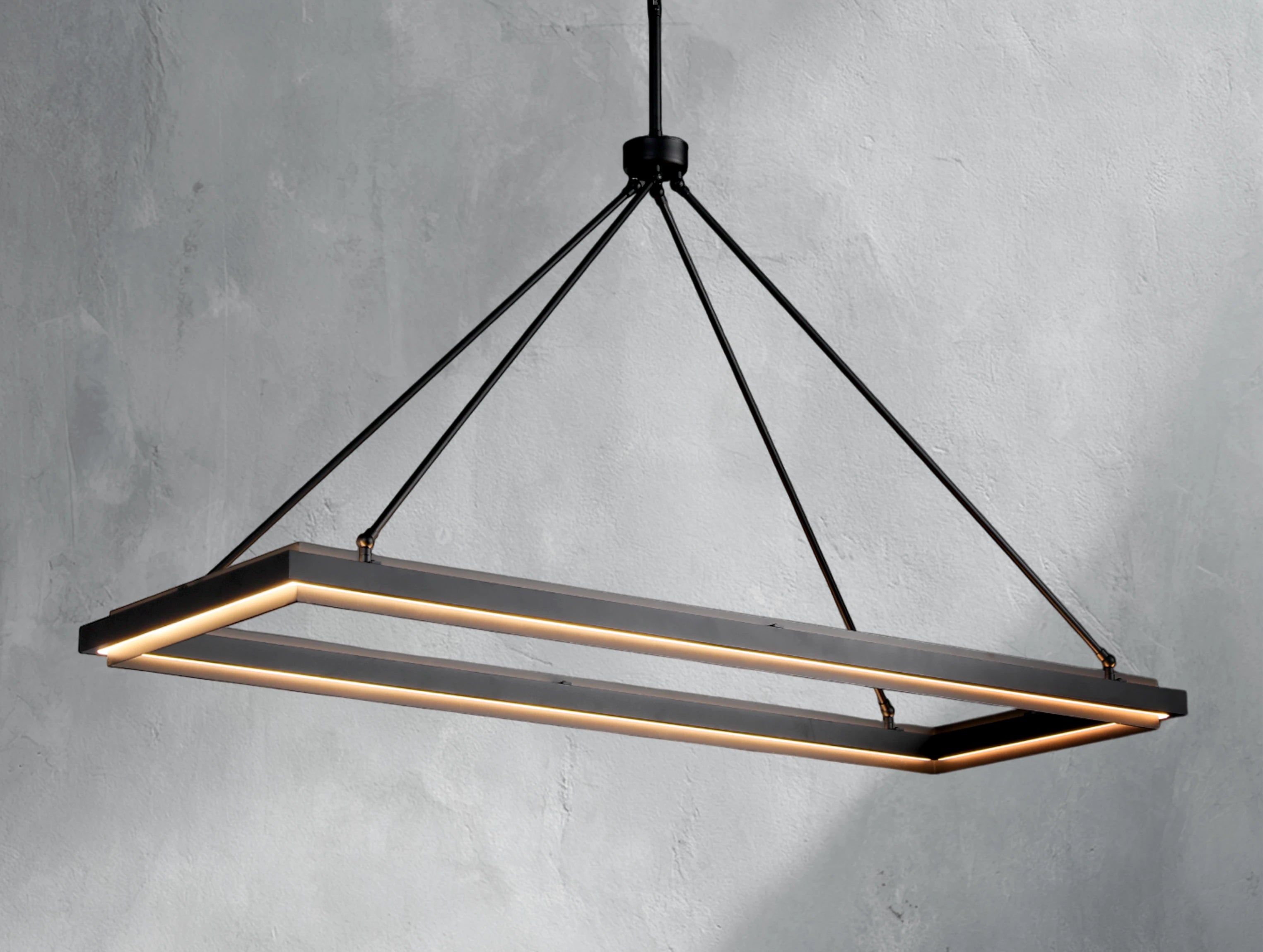 Industrial blacksmith Jon Sarriugarte brings together traditional craftsmanship and modern LED innovation in the Pelta Rectangular Chandelier. Forged by hand from iron, its streamlined rectangular frame conceals integrated LED strips, casting a warm halo of ambient light. Power is conducted through rods rather than visible wires, enhancing the fixture’s clean, architectural design.