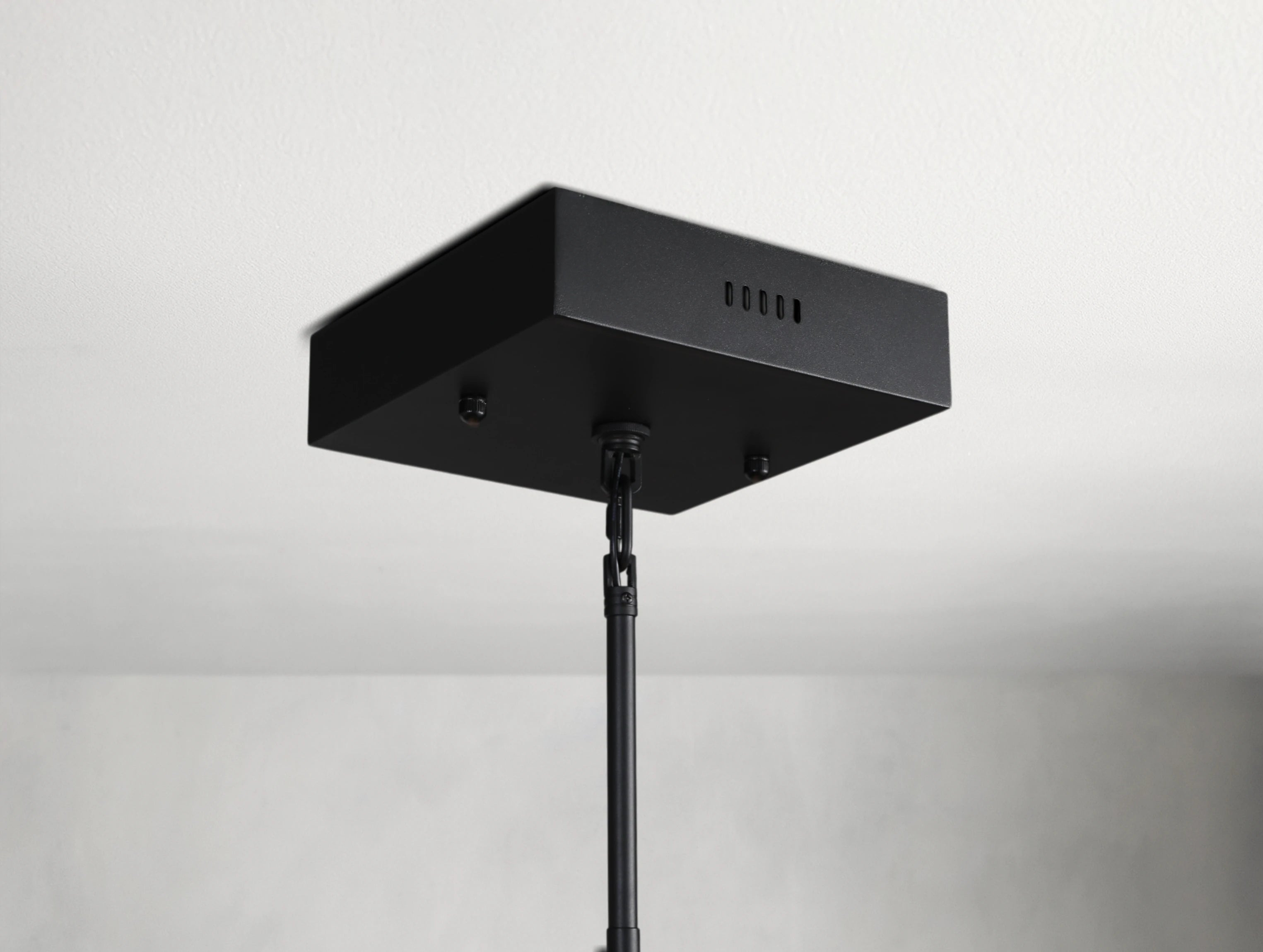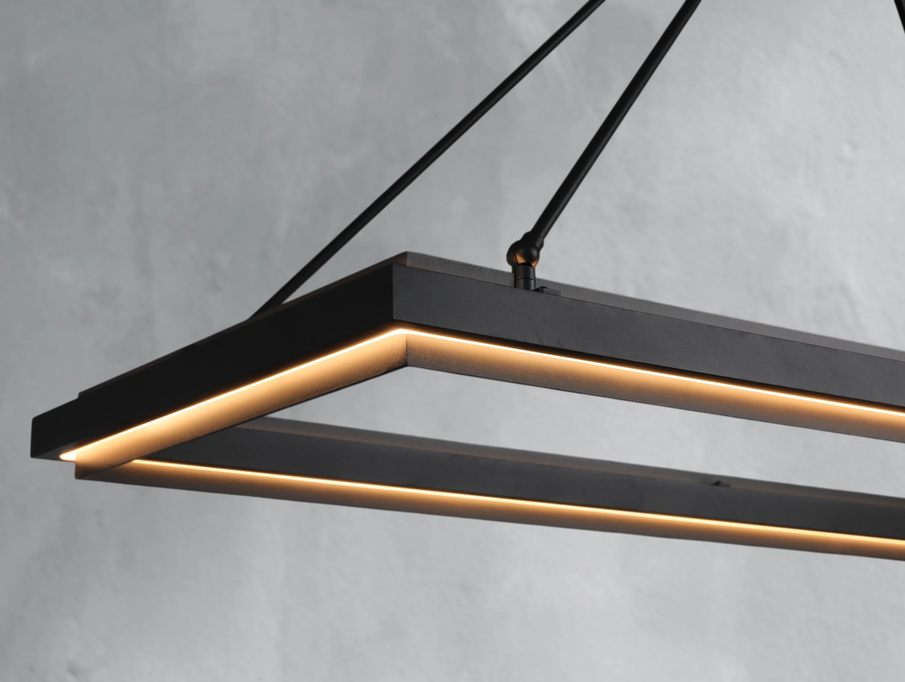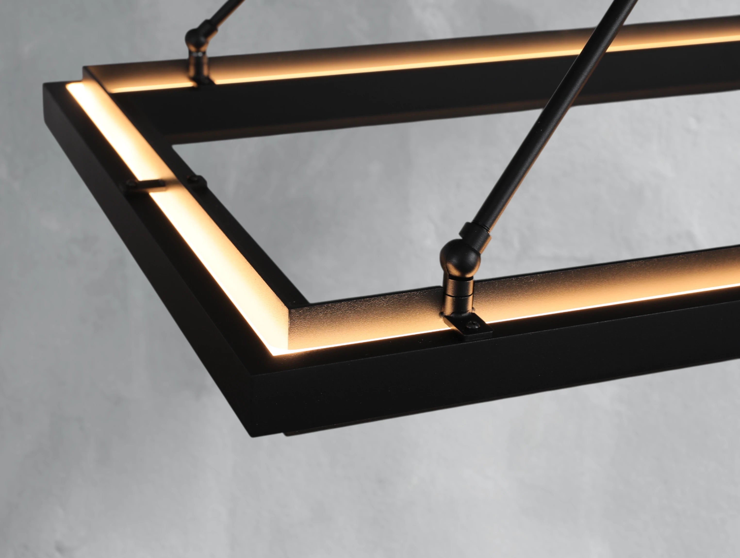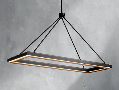 Industrial blacksmith Jon Sarriugarte brings together traditional craftsmanship and modern LED innovation in the Pelta Rectangular Chandelier. Forged by hand from iron, its streamlined rectangular frame conceals integrated LED strips, casting a warm halo of ambient light. Power is conducted through rods rather than visible wires, enhancing the fixture’s clean, architectural design.