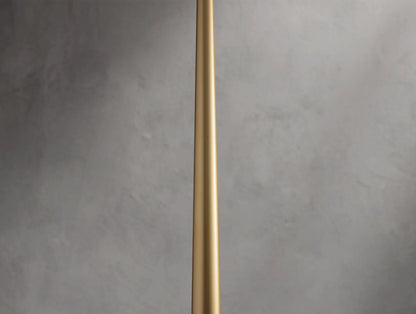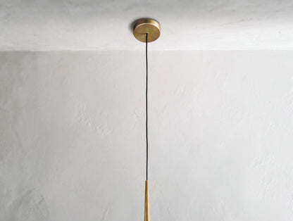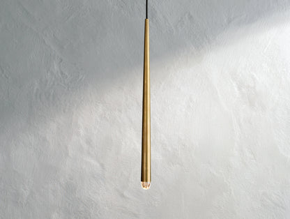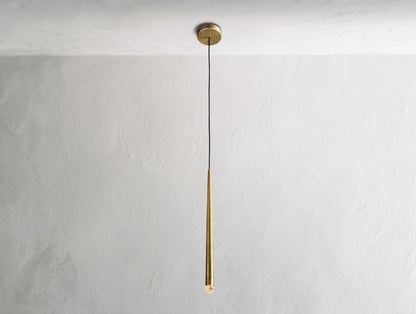 Minimalist yet striking, this pendant is inspired by French lighting of the 1960s. A solid brass form is suspended from a slender black cord, with a faceted glass tip inset with an LED that glows warmly. Its clean, modern design works beautifully on its own, in pairs, or arranged in multiples for dramatic effect.
