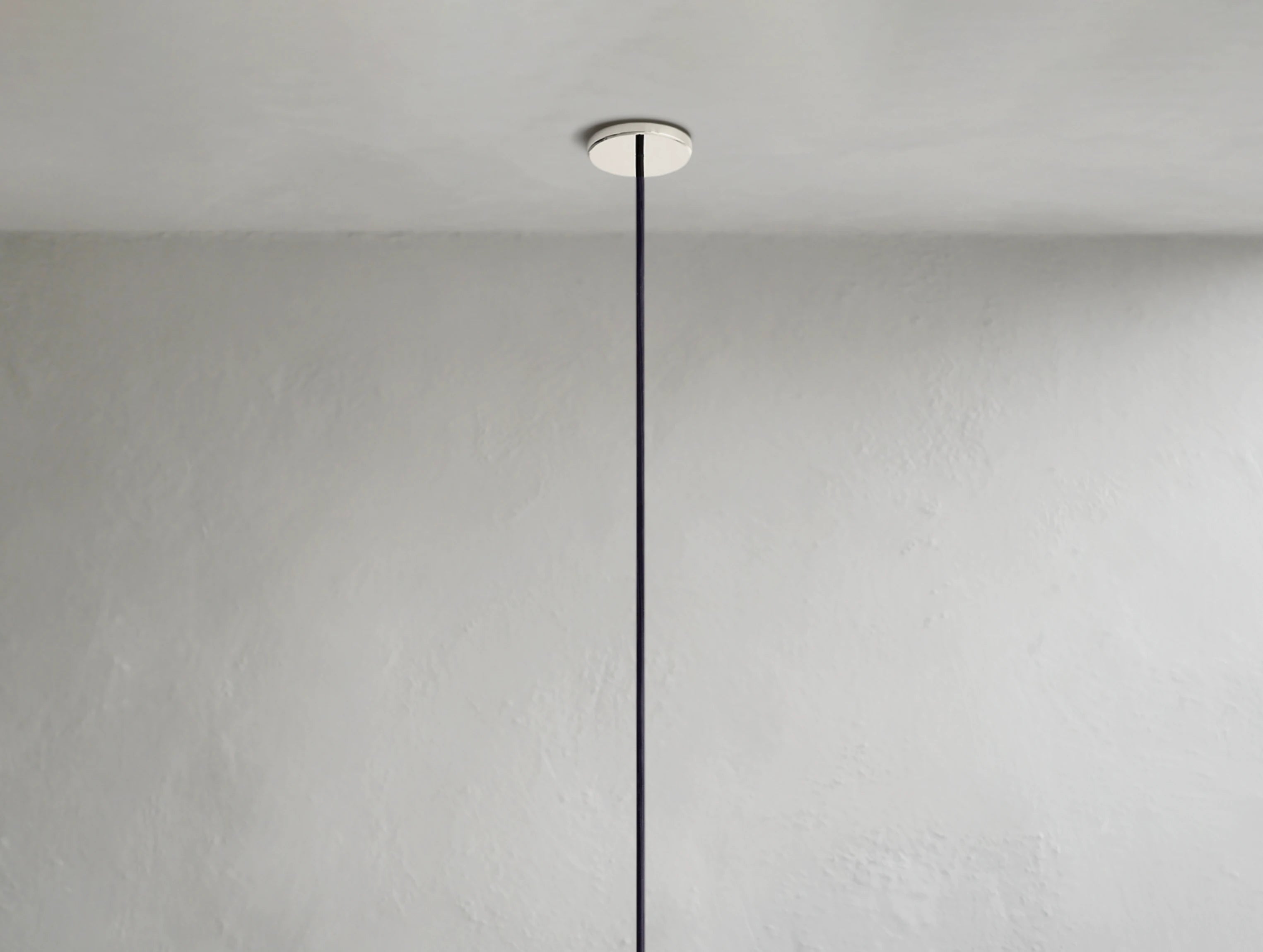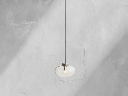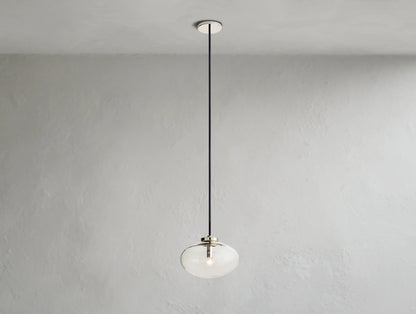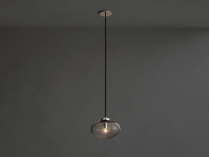 A single handblown glass globe floats with weightless elegance, suspended from a slim black cord and anchored by a simple steel frame. Minimal yet refined, this pendant offers a sculptural glow that works beautifully on its own or arranged in multiples.