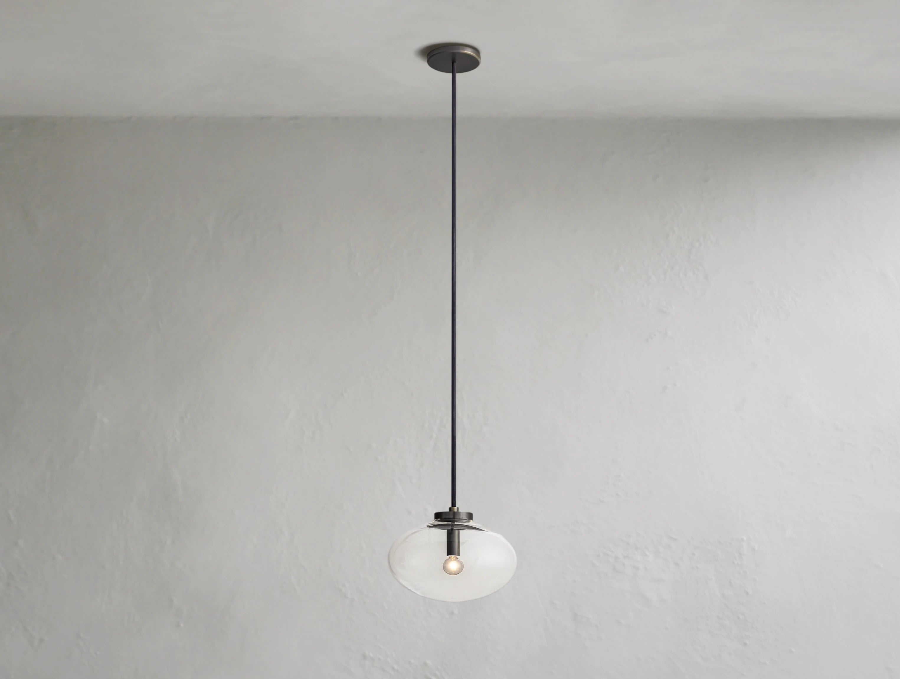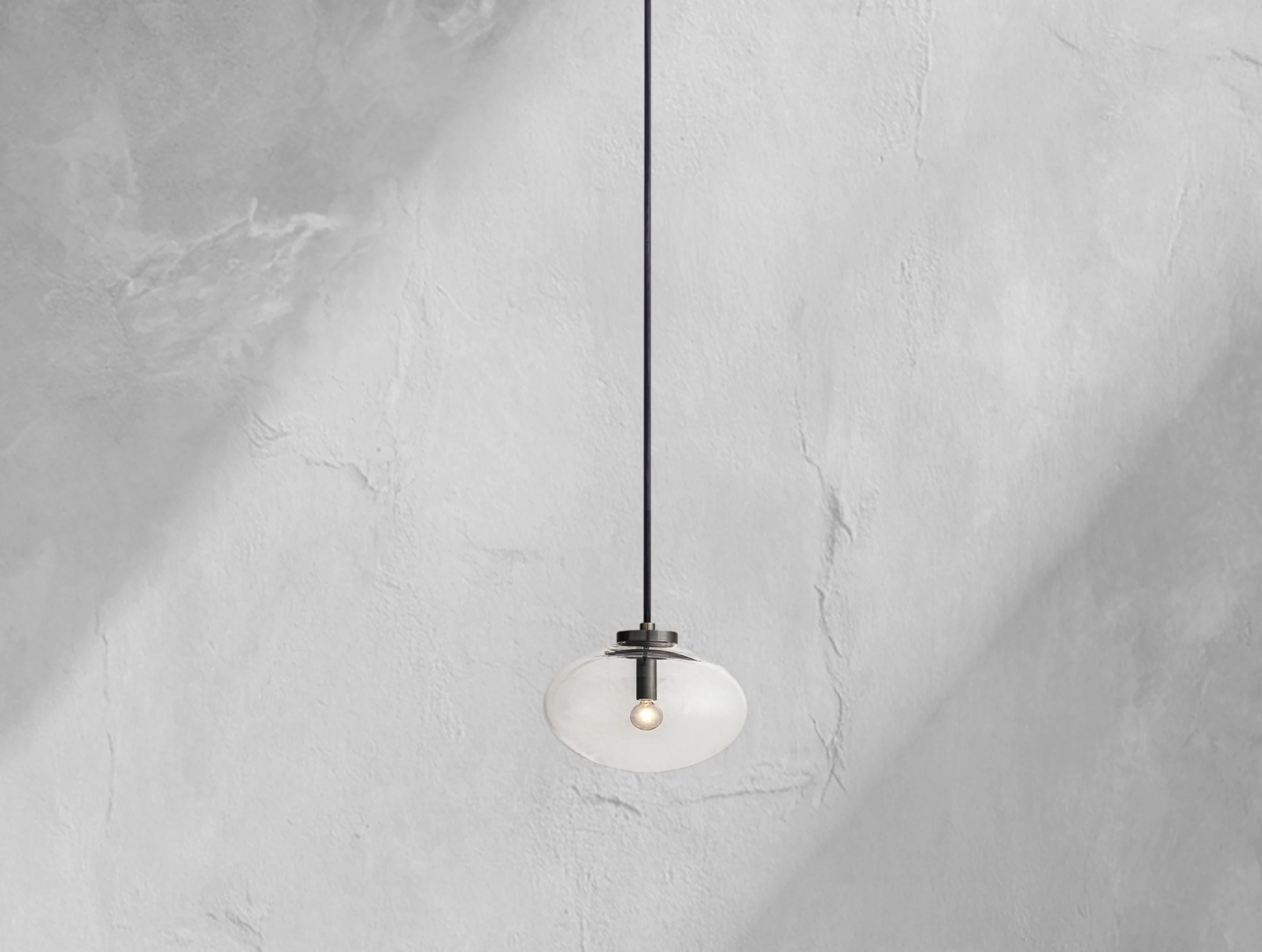 A single handblown glass globe floats with weightless elegance, suspended from a slim black cord and anchored by a simple steel frame. Minimal yet refined, this pendant offers a sculptural glow that works beautifully on its own or arranged in multiples.