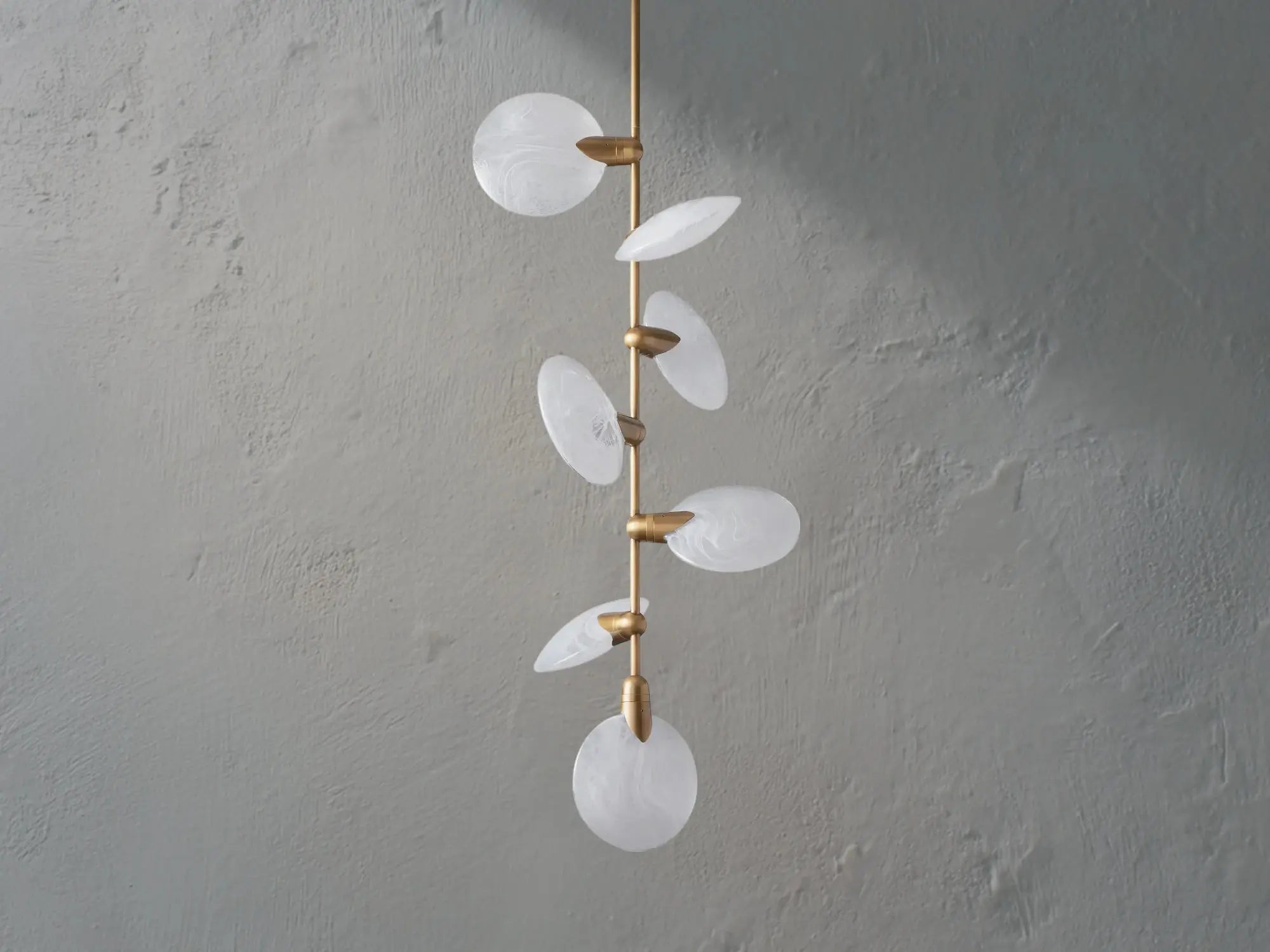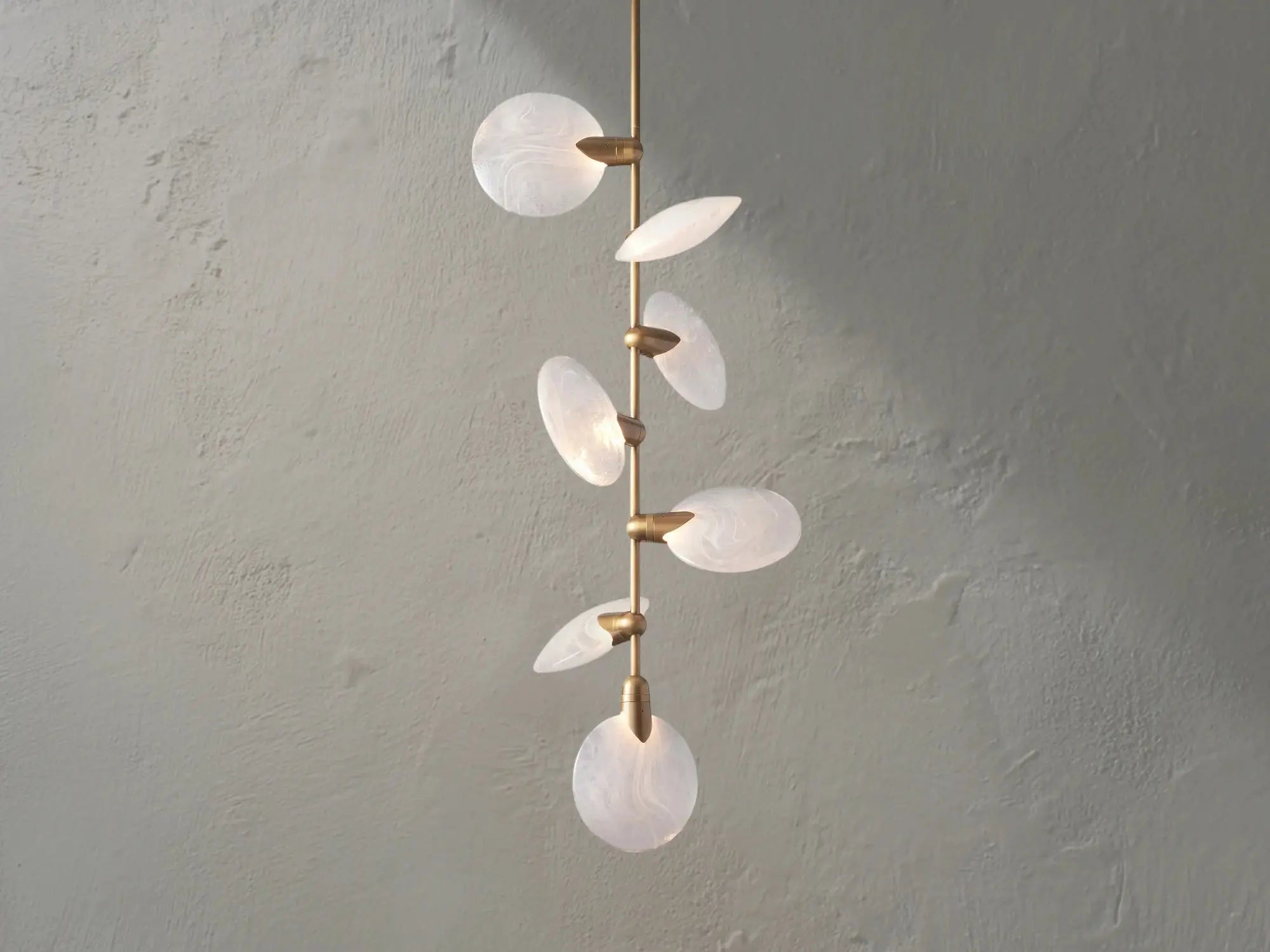 Graceful and luminous, the Lylan Pendant brings sculptural elegance to any space. Featuring a cascade of hand-blown translucent glass discs, each piece reveals delicate swirls and textures when lit. Suspended from a sleek steel rod, this pendant is ideal for creating a soft focal point above entryways, stairwells, or lounge areas.
