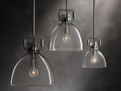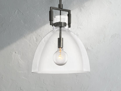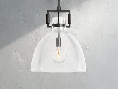 A harmonious tension of form and material, this pendant blends industrial geometry with airy elegance. The solid metal yoke anchors the design with mechanical strength, while the delicate blown-glass shade softens the silhouette, framing the glow of a slender Edison bulb inside. Each shade is mouth-blown, revealing subtle artisan details that make every piece unique. Offered in three sizes, the fixture adapts seamlessly to modern kitchens, baths, or entryways.
