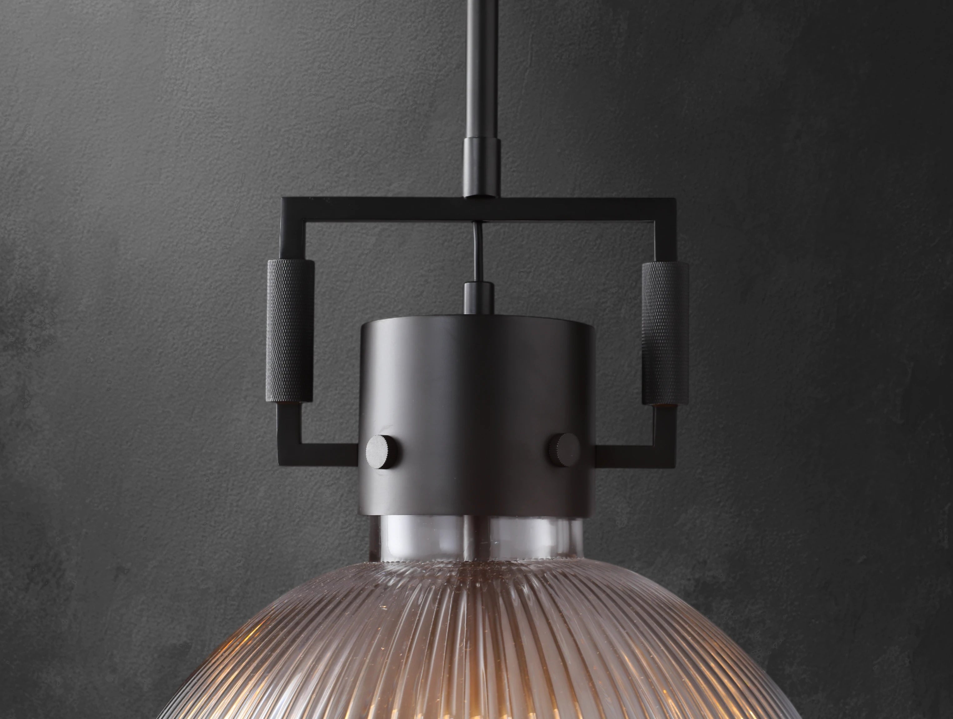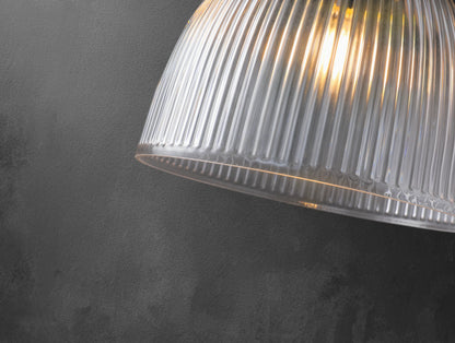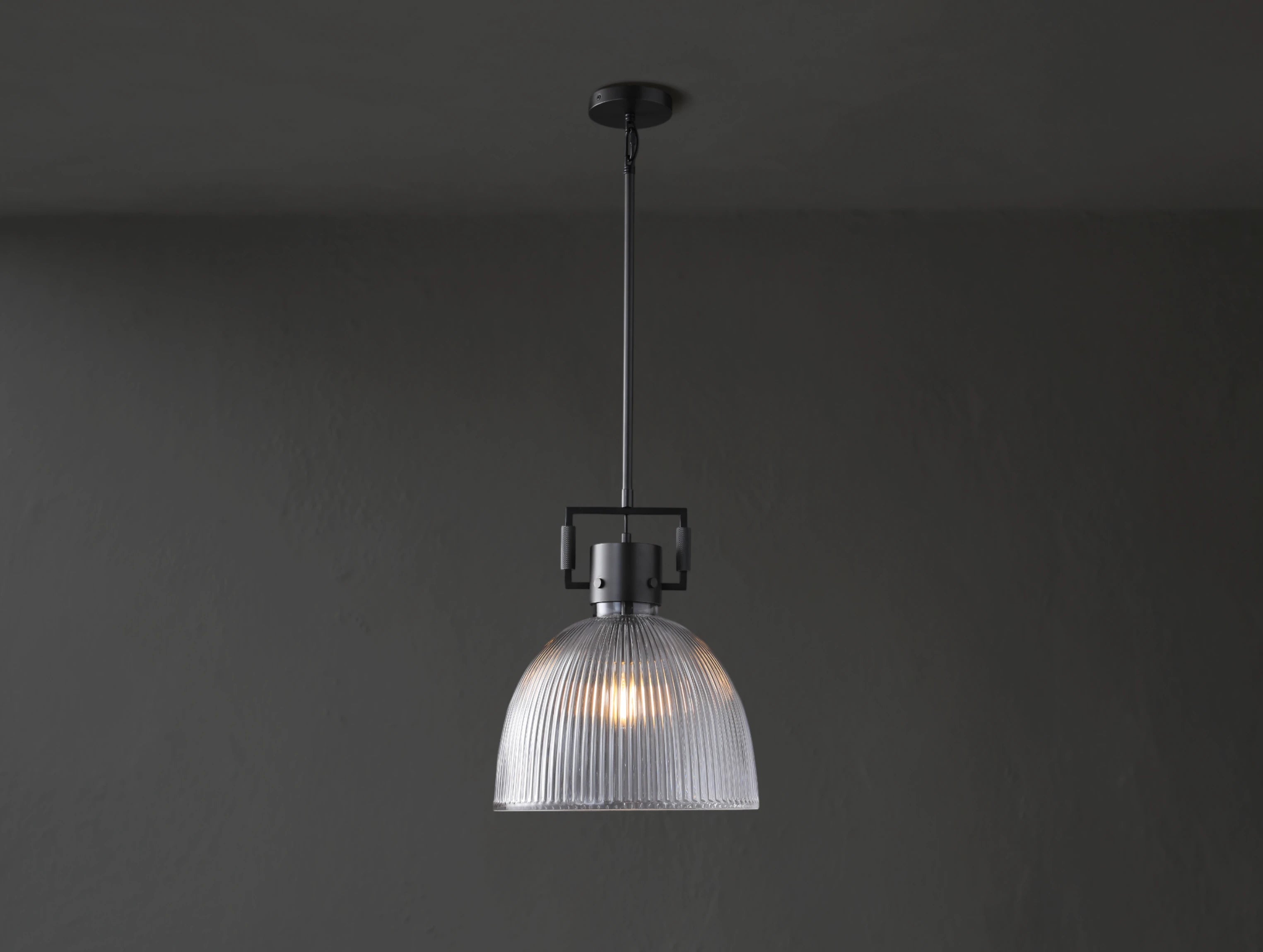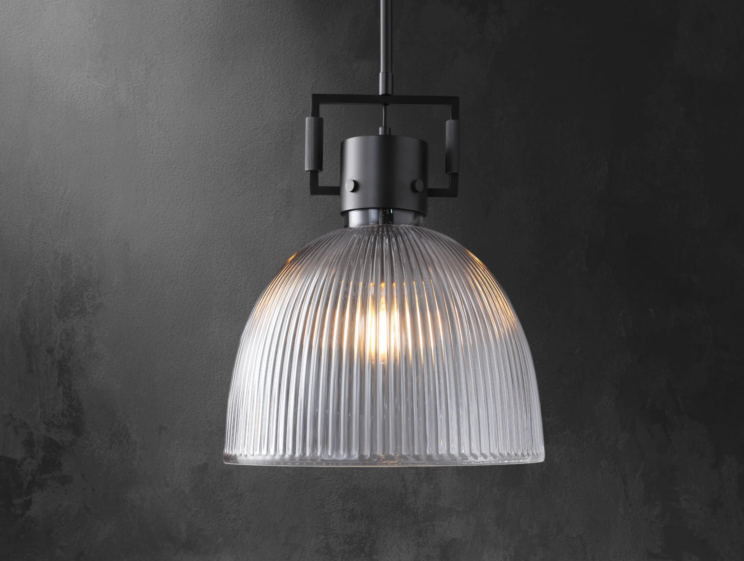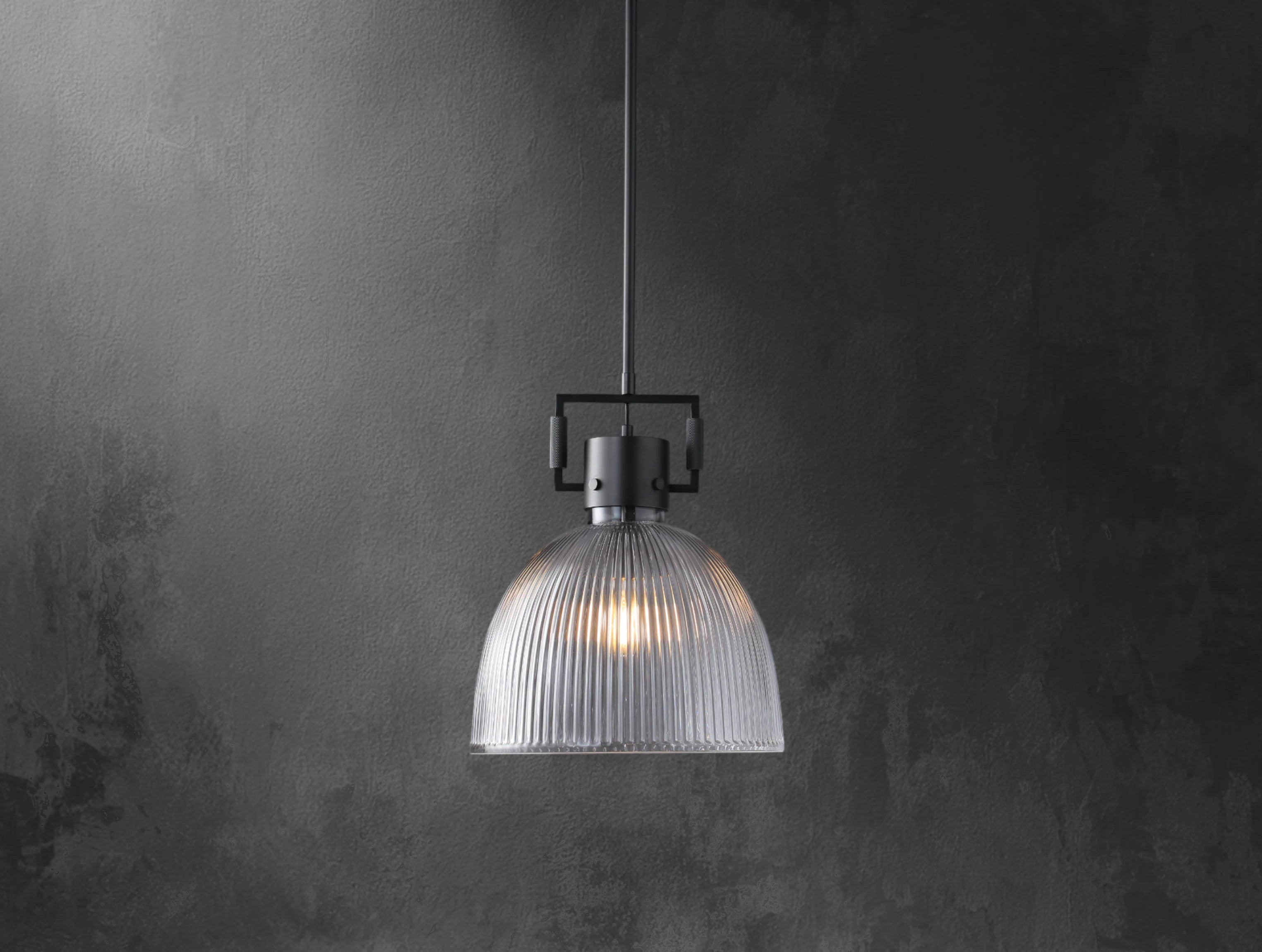 Industrial strength meets optical elegance in this pendant inspired by vintage utility lighting. Its prismatic borosilicate glass shade evenly refracts light to illuminate spaces with clarity and warmth, while a geometric metal yoke—complete with exposed bolts and knurled detailing—anchors the fixture in mechanical heritage. Available in three sizes, it's ideal for kitchens, baths, or anywhere clean lines and diffused light are called for.