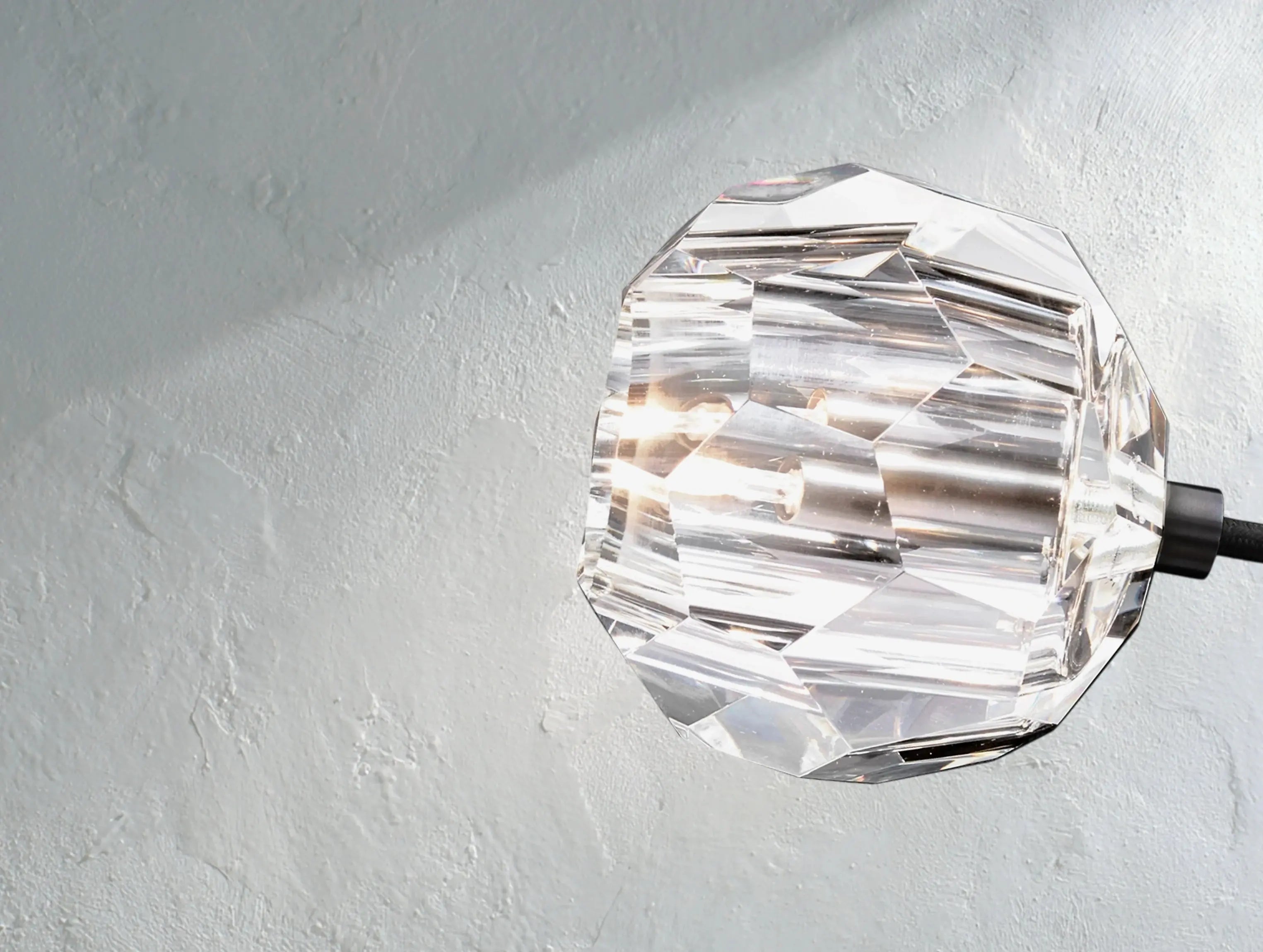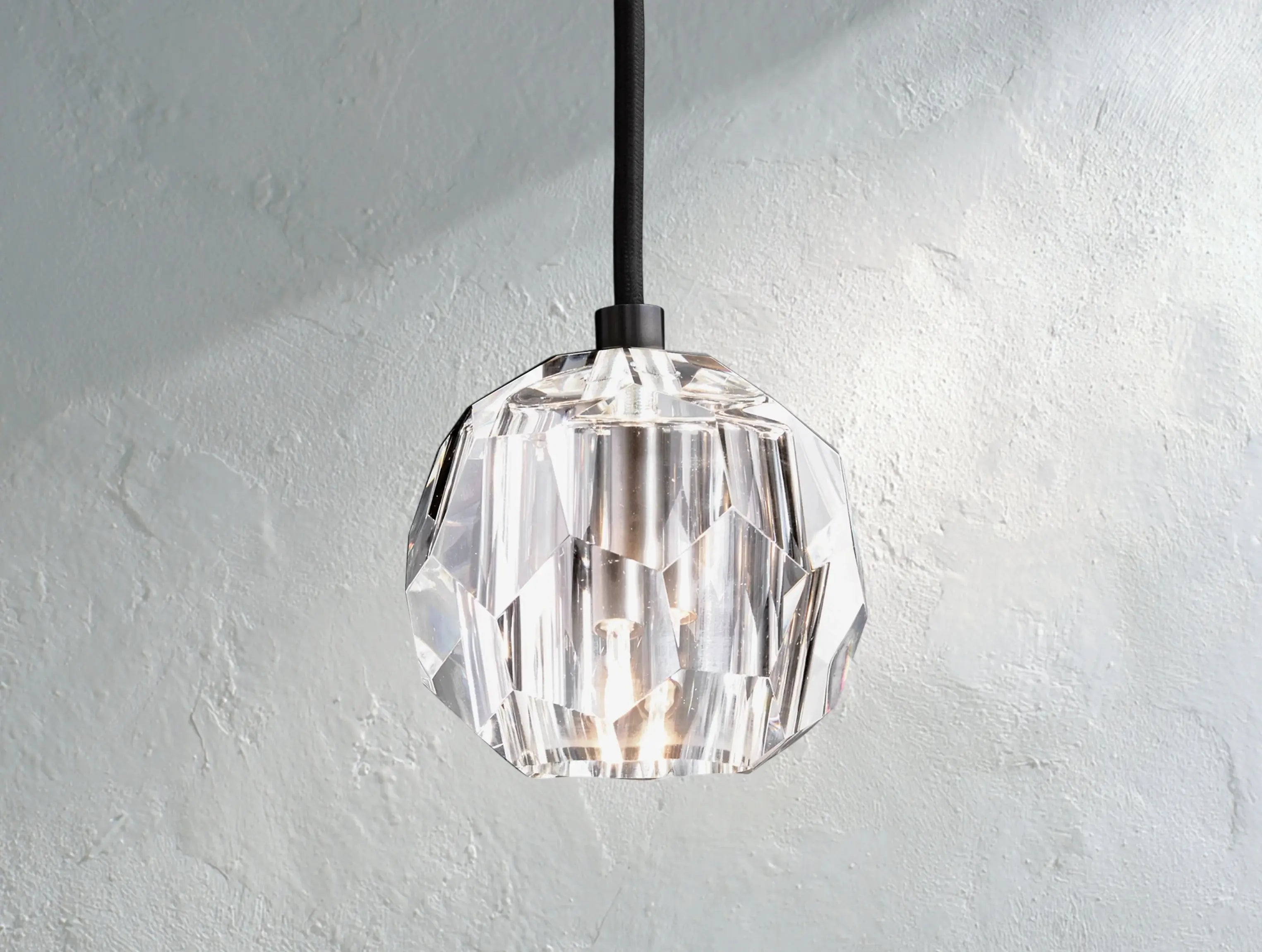 Delicately suspended by a simple black fabric cord, this pendant distills sculptural elegance into its purest form. The finely faceted crystal sphere—meticulously cut and hand-polished—scatters light with optical clarity, offering a refined glow ideal for intimate spaces or dramatic clustering.