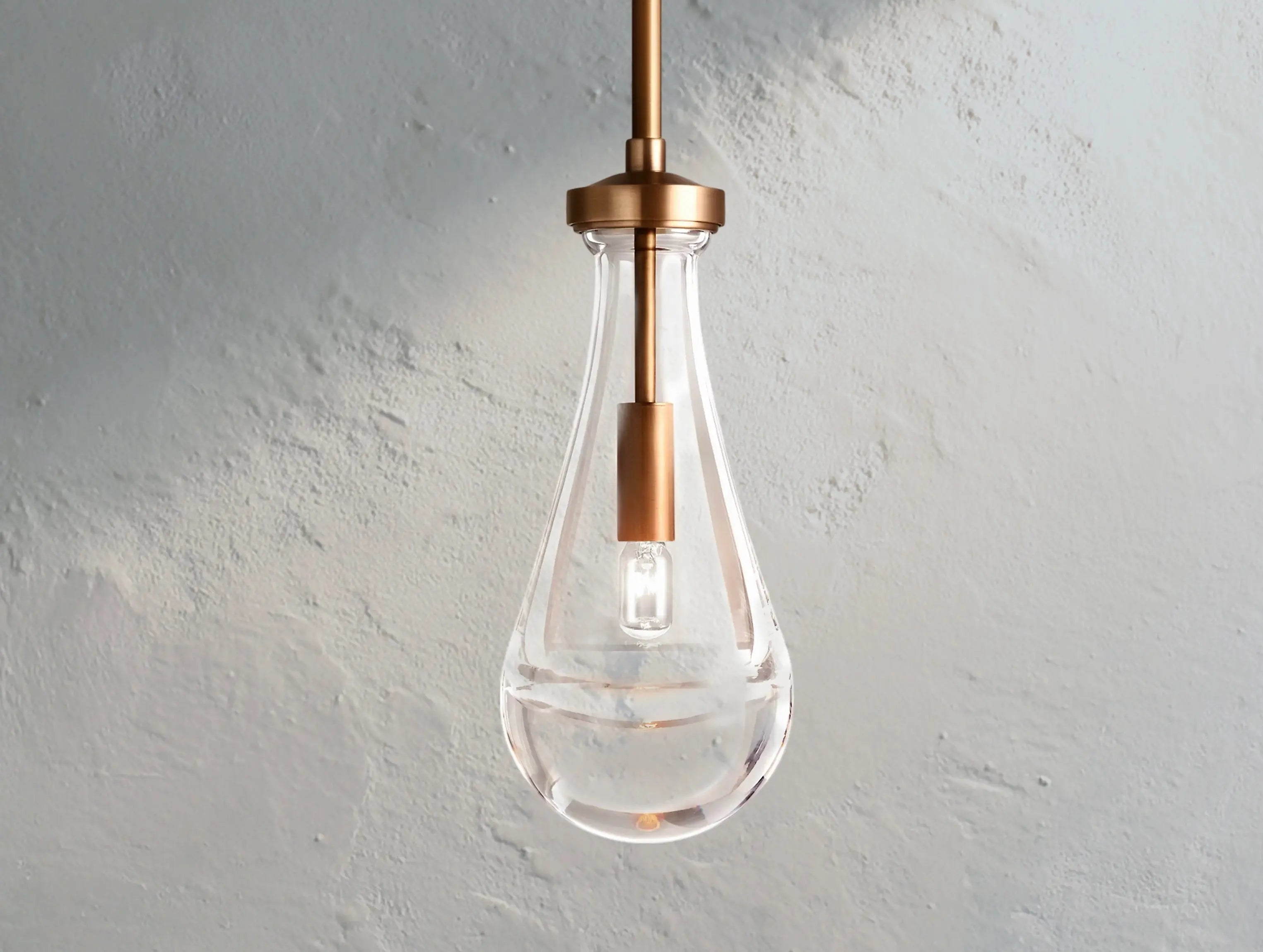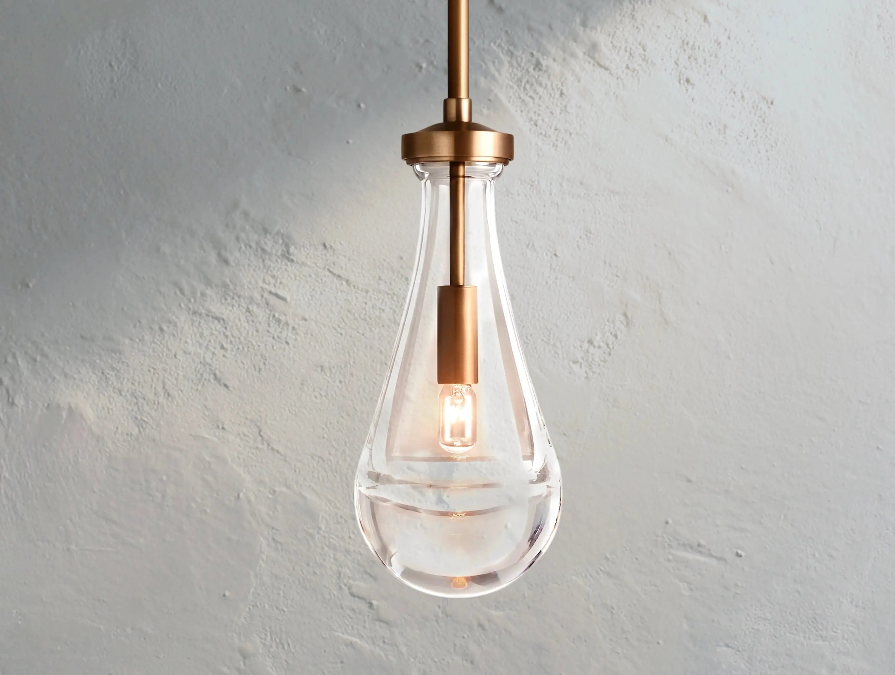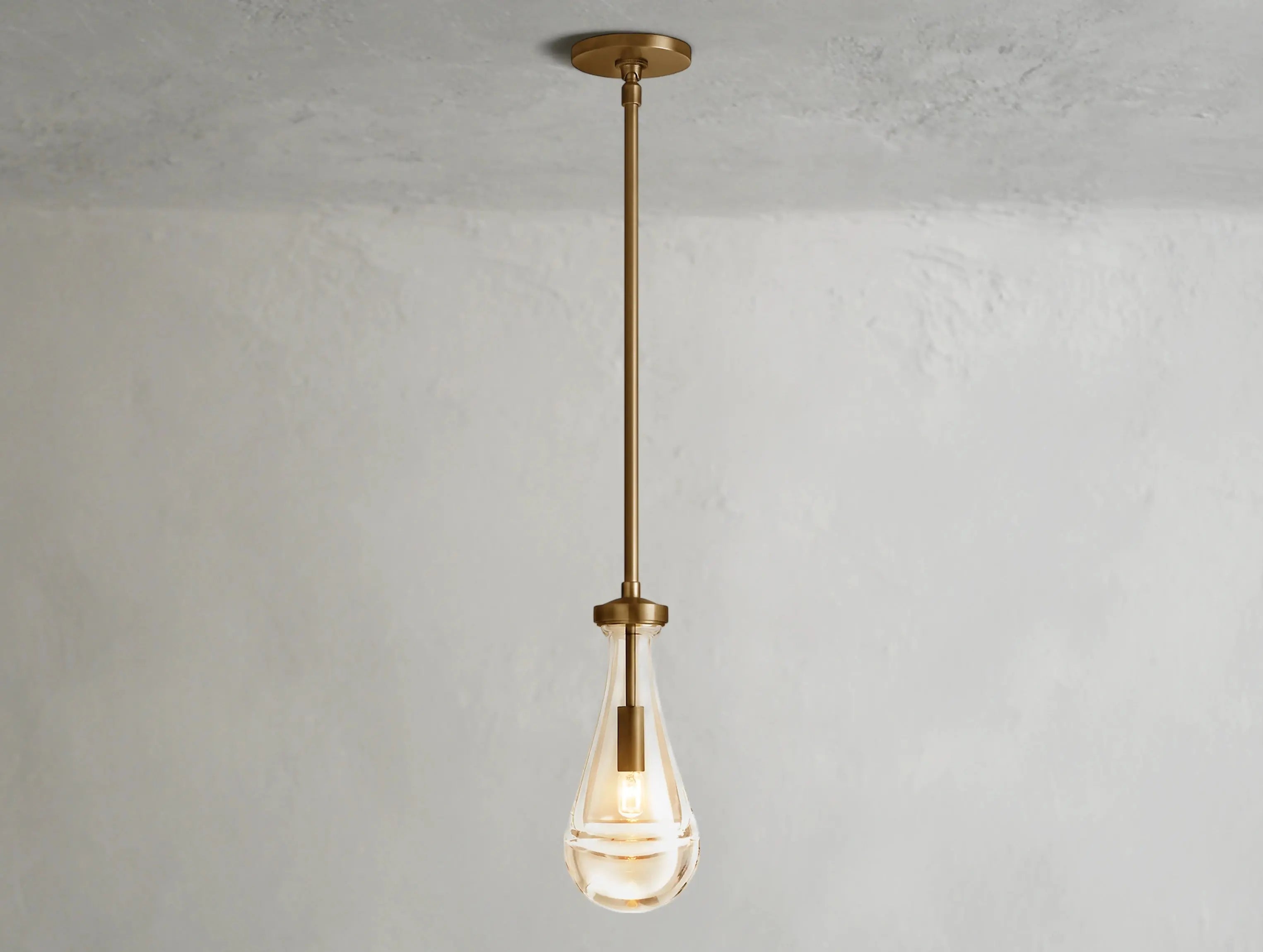 A poetic expression of a single falling raindrop, this outdoor-rated pendant suspends a handblown glass droplet from a slender brass frame. Whether placed on a covered patio or in a moisture-prone indoor space, it glows with quiet elegance.