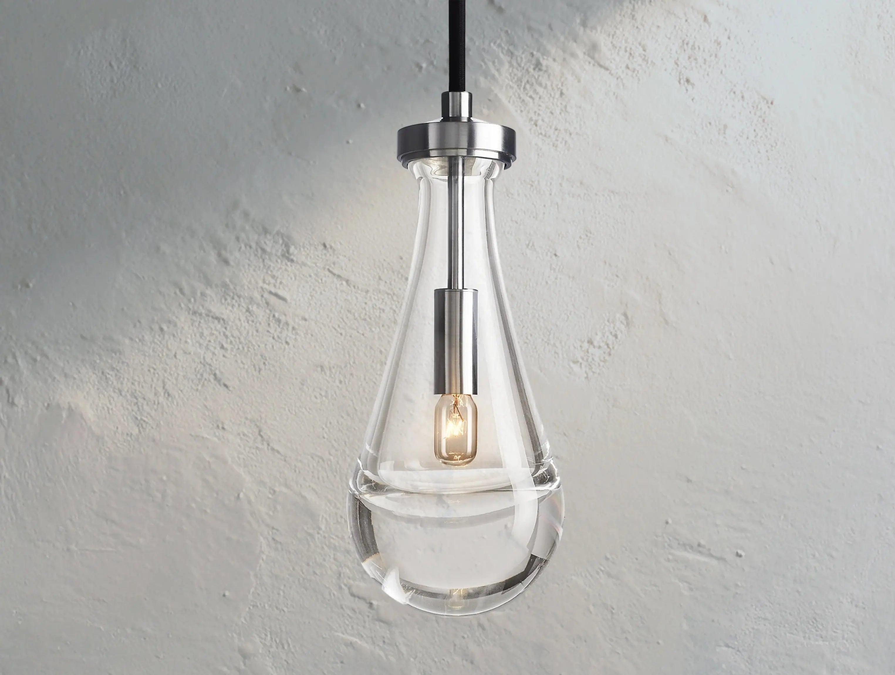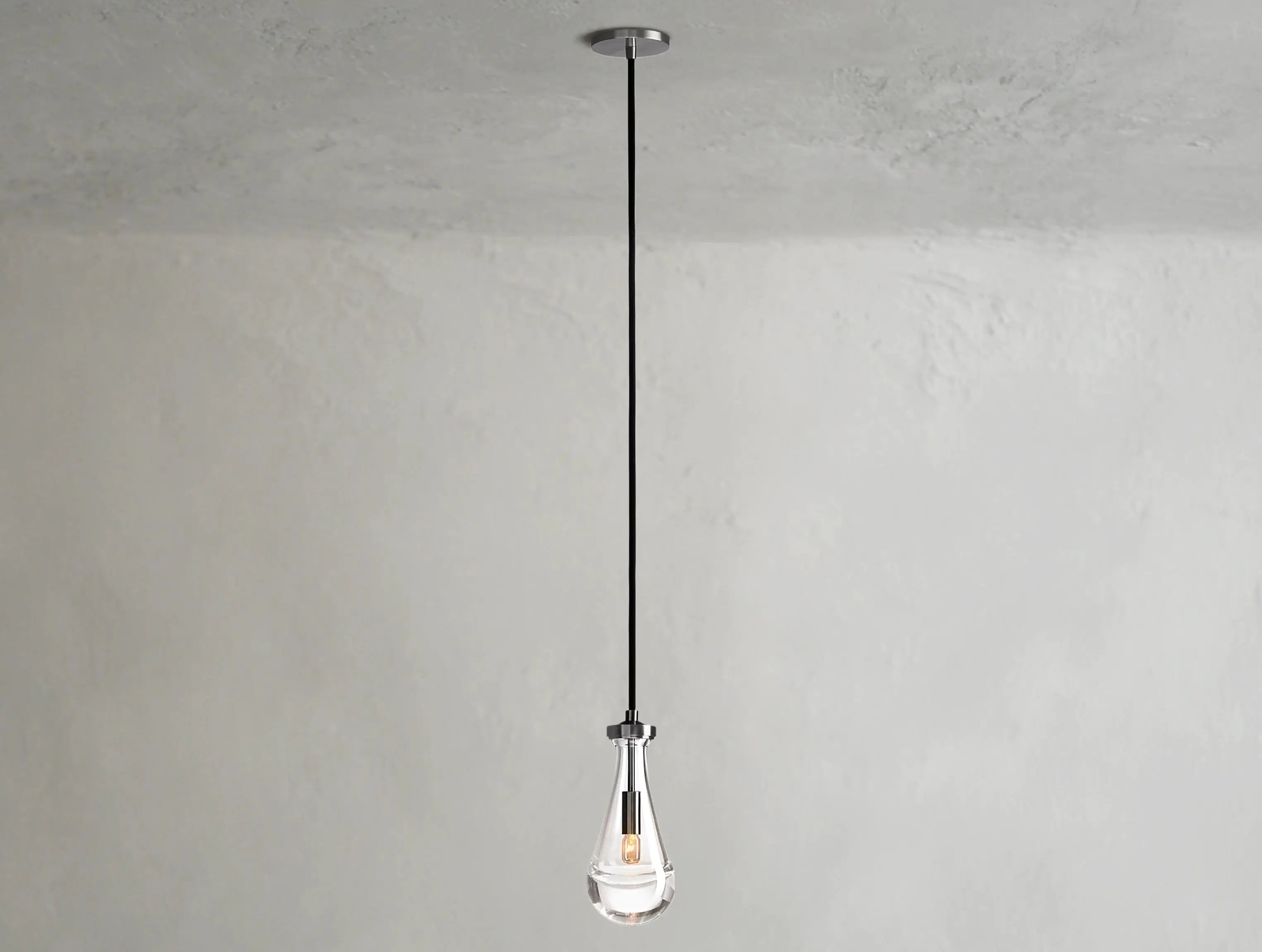 Evoking the quiet elegance of a single falling raindrop, this sculptural pendant features a handblown glass form suspended from a slim cord. The glowing orb casts a soft halo of light, bringing a sense of calm and refinement to any space.