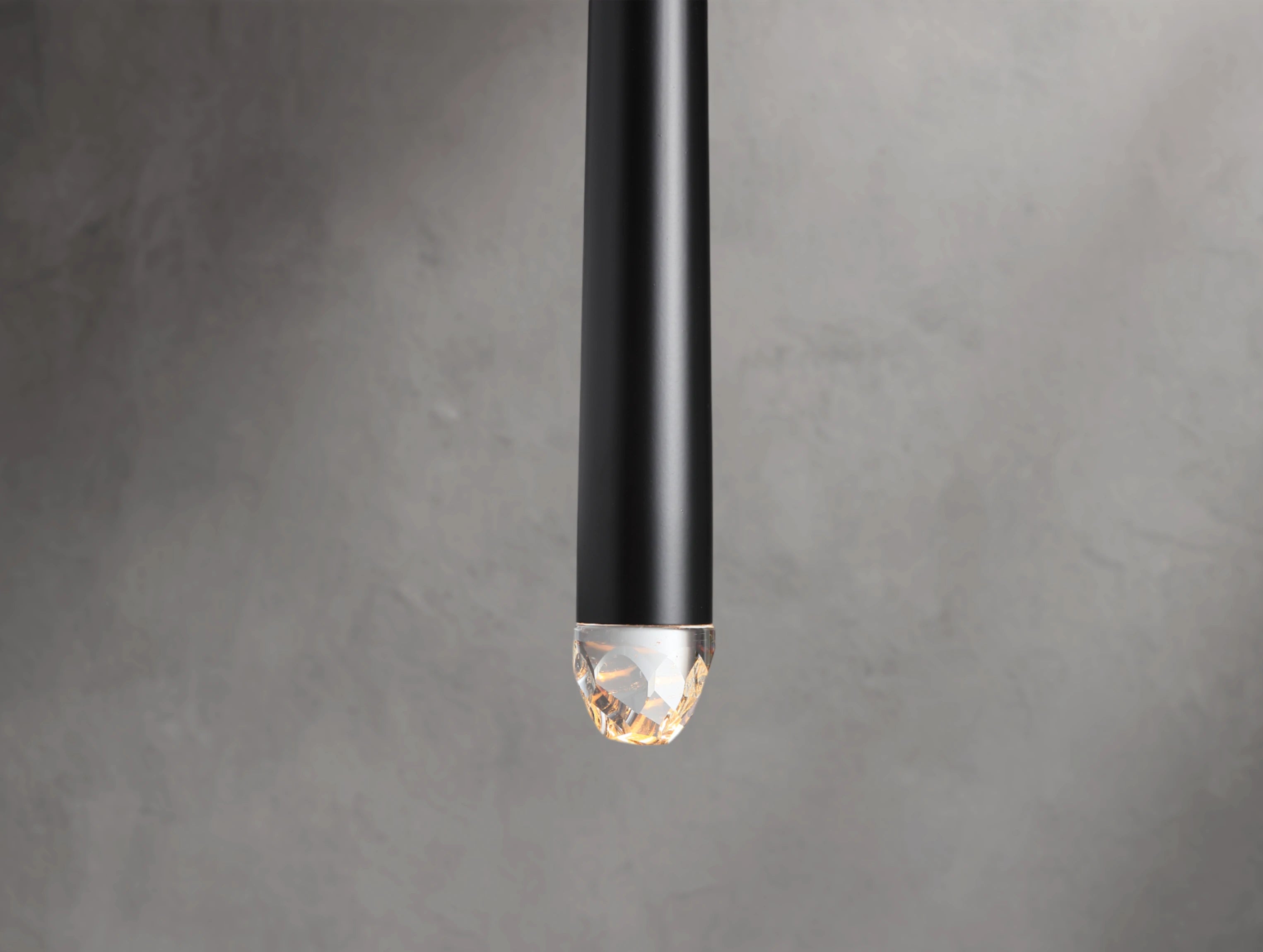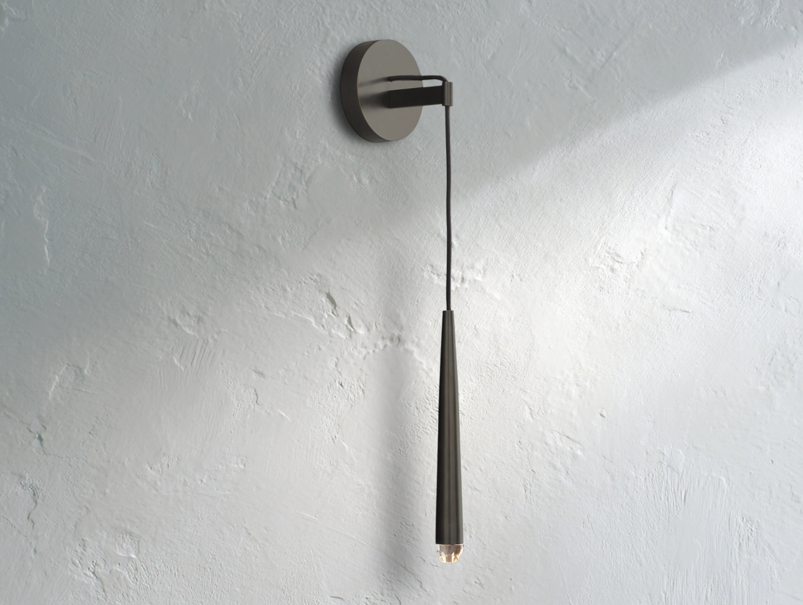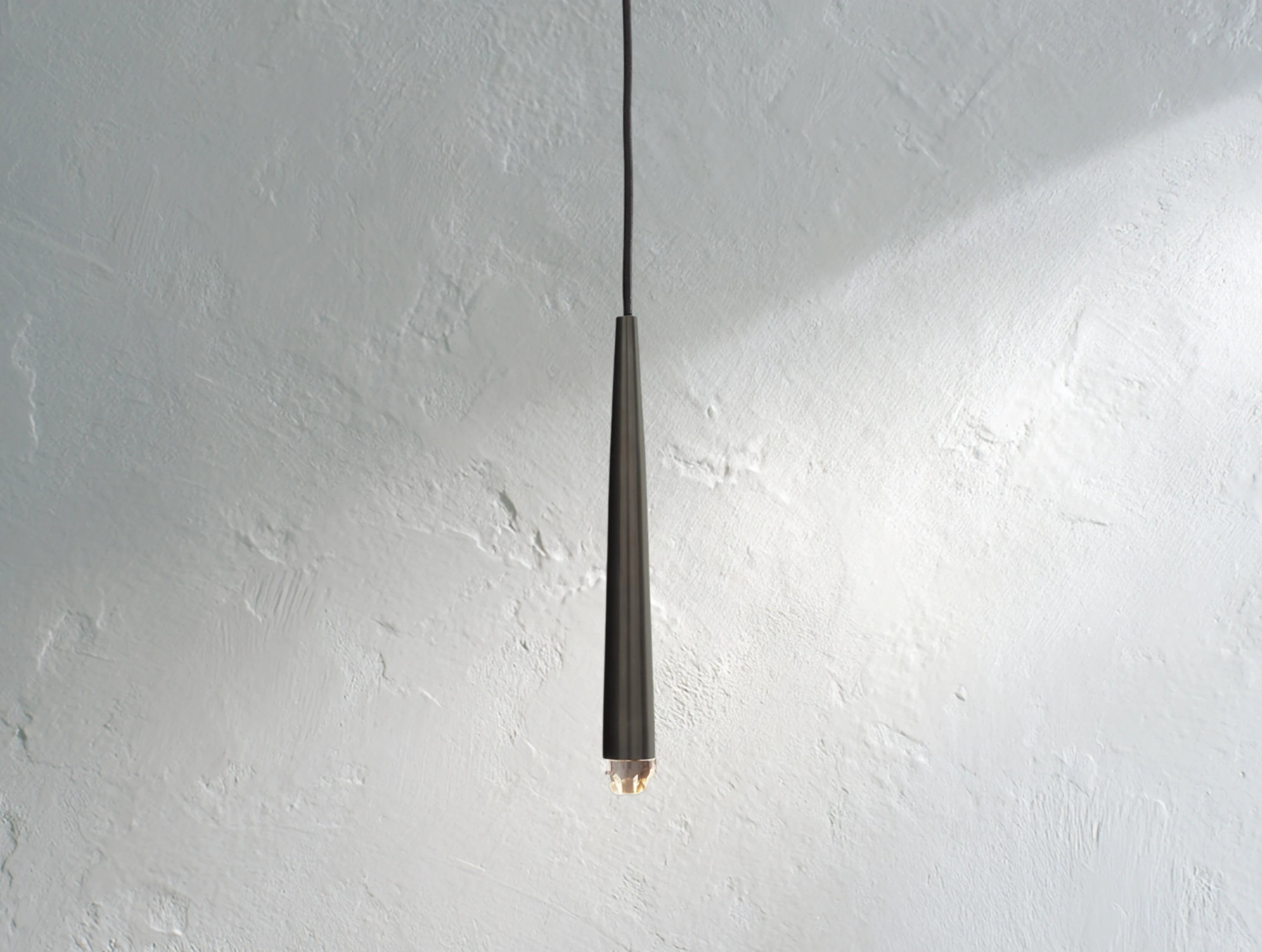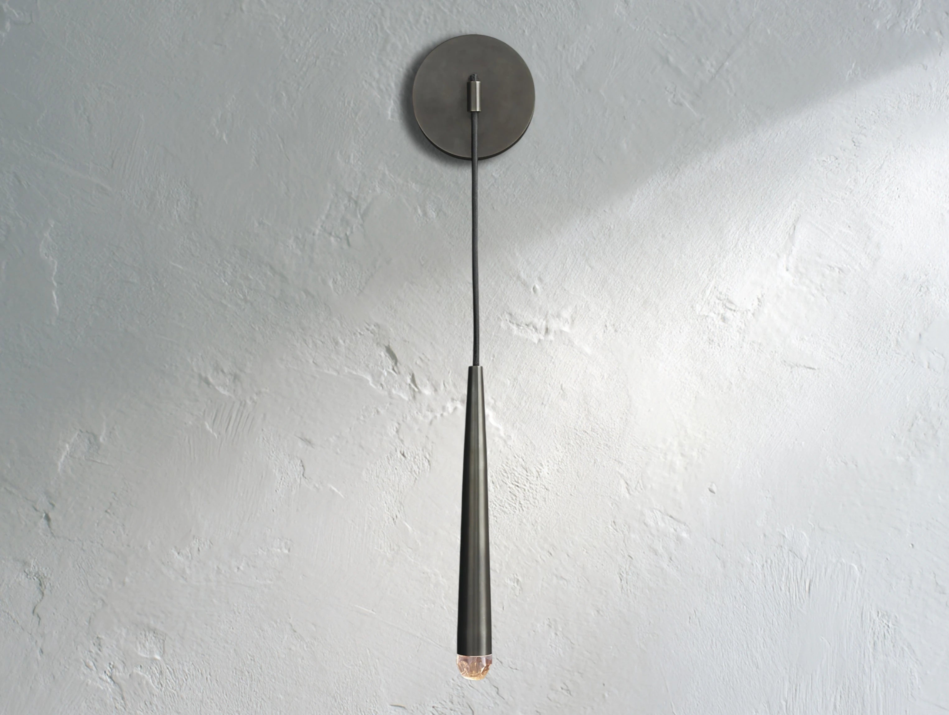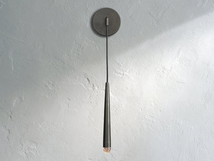 Inspired by minimalist French lighting of the 1960s, this wall sconce features a sculptural brass form suspended vertically with a faceted glass tip inset with an LED. It casts a warm, glowing light that adds a refined modern touch to hallways, bathrooms, or living spaces.