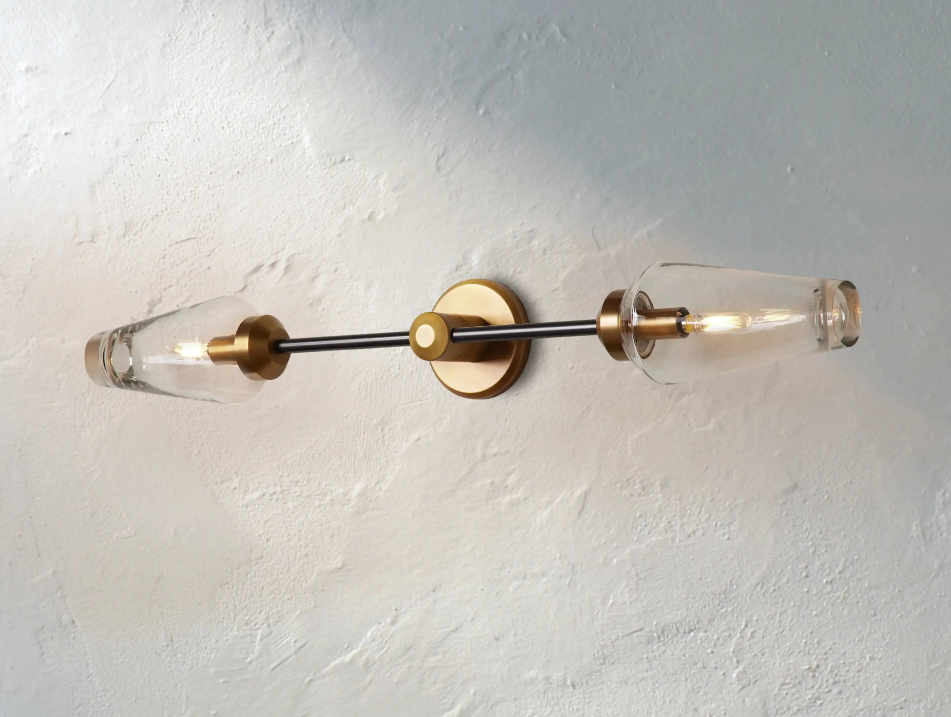 Artful asymmetry meets modern balance in the Arron Double Sconce. Two dense, mouth-blown glass diffusers are paired with a bronze or brass frame and accented in refined brass detailing. Can be installed vertically or horizontally for versatile styling.