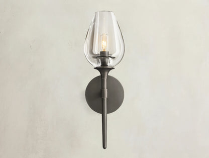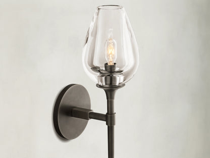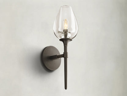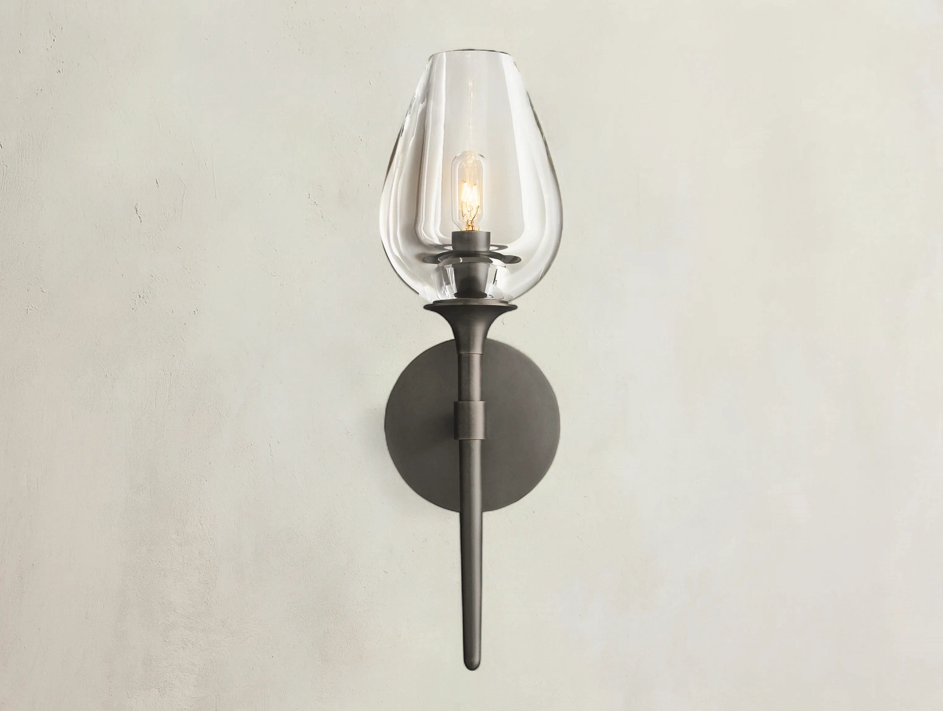 Inspired by the soft contours of a tulip in bloom, this sconce showcases the artistry of hand-carved crystal. Each thick crystal torchère is lathe-cut from a solid block, then polished by hand to reveal petal-like shapes that diffuse light into a warm, atmospheric glow. A solid brass frame provides understated support, blending organic elegance with refined craftsmanship.