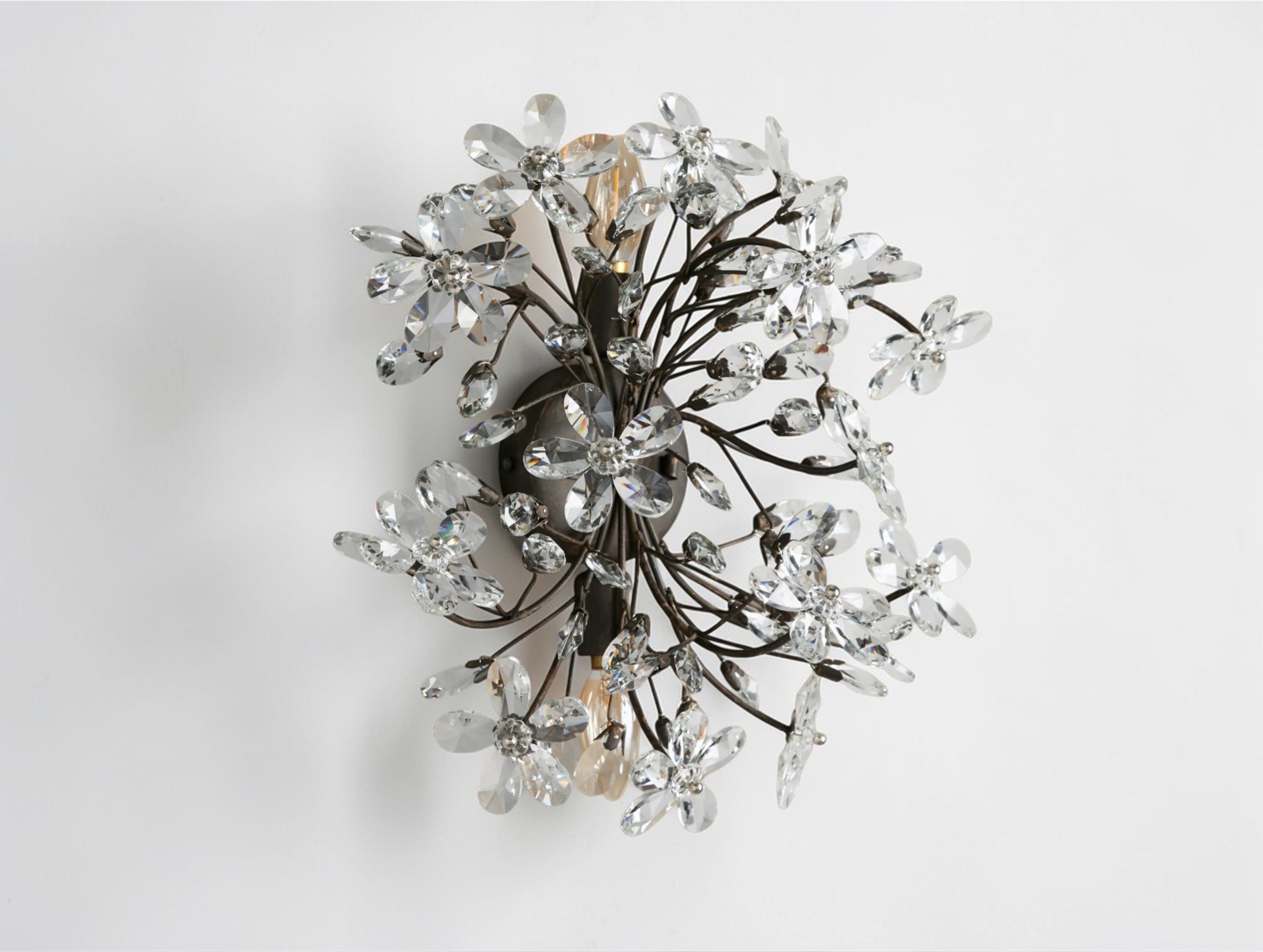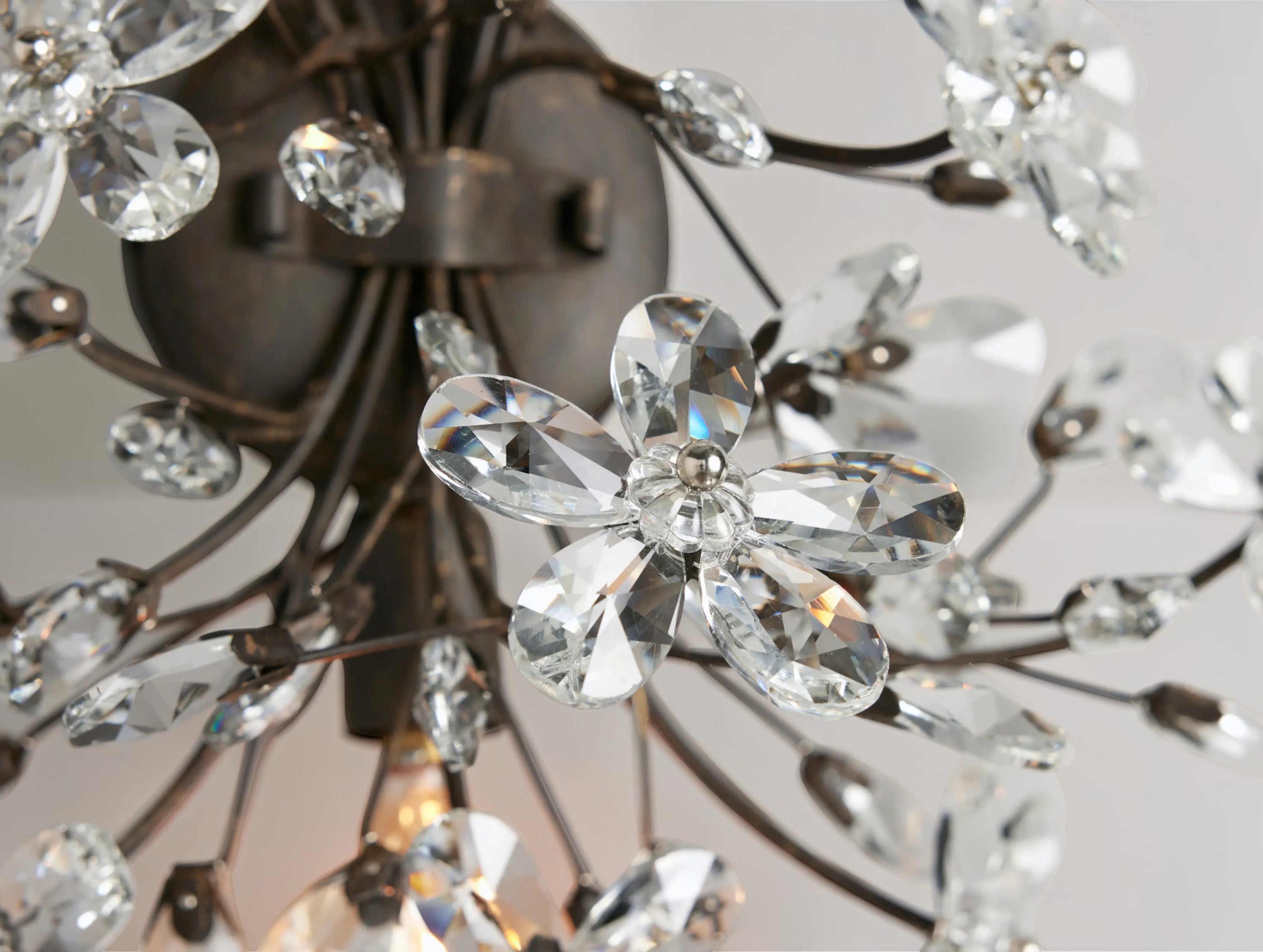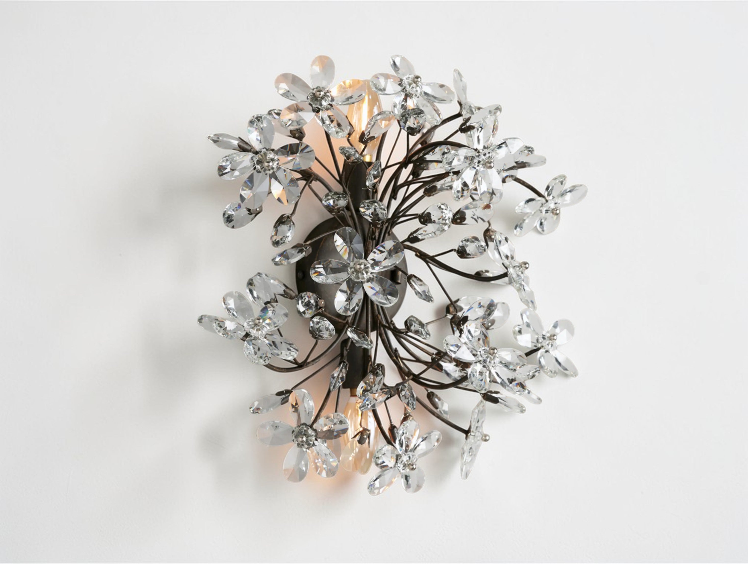 Delicate crystal florals sparkle along the sculptural iron branches of the Fiona Sconce, capturing the romance of nature in a refined, heirloom-inspired form. Handcrafted in Italy from solid iron with silver, gold, or bronze finishes, each piece features intricate detailing and includes two E12 bulbs for a soft, radiant glow in hallways, bathrooms, or formal rooms.