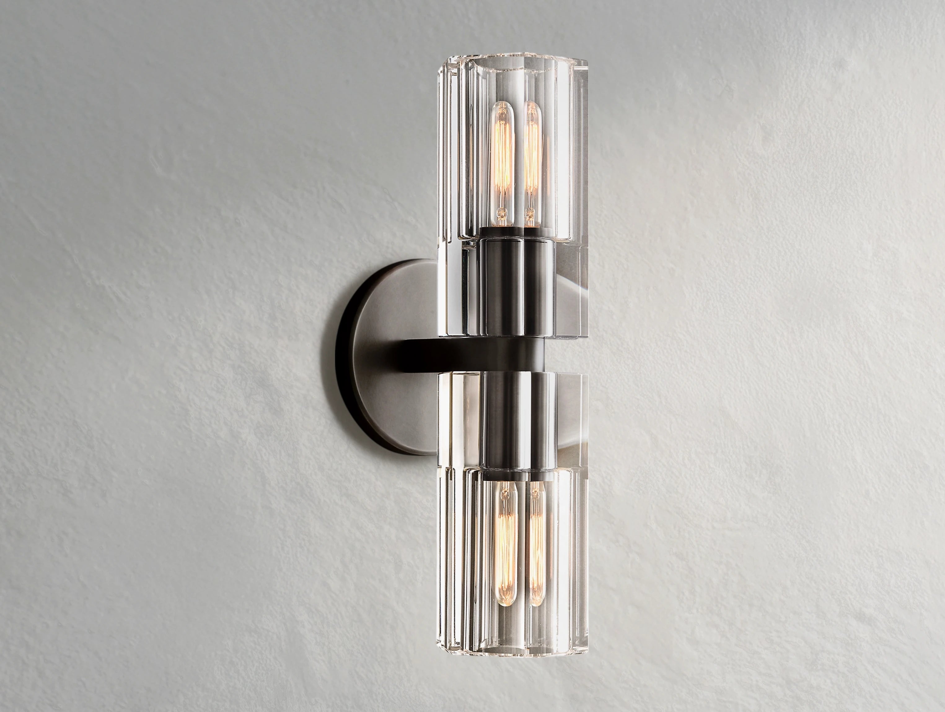 The Gearra Linear Sconce channels industrial geometry into a streamlined lighting sculpture. Two hexagonal K9 crystal prisms, precisely aligned within a brass or polished steel frame, bring radiant balance to hallways, bathrooms, and modern interiors. Mount vertically or horizontally to suit your space.