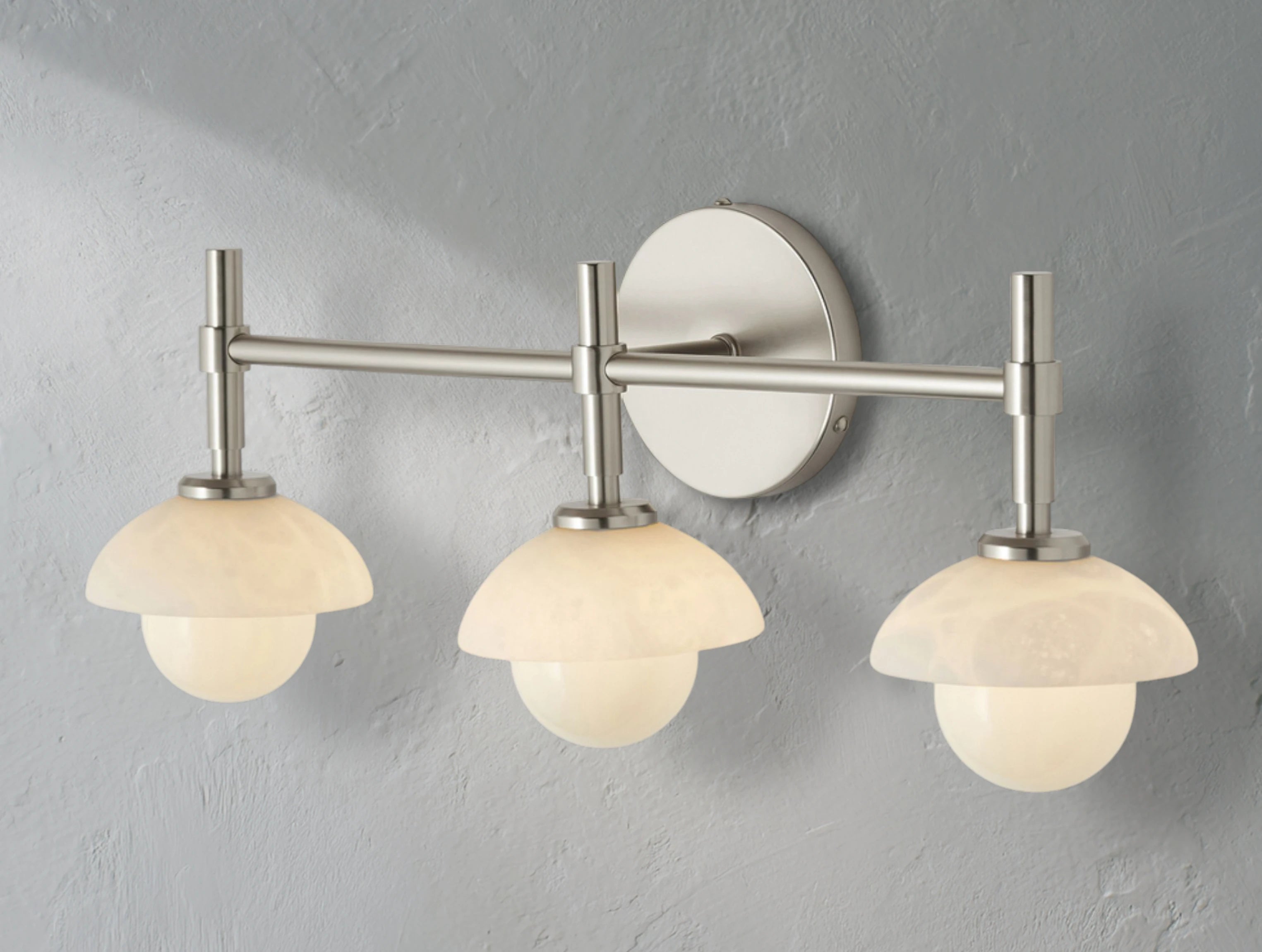 The Greensh Triple Sconce embodies refined balance and sculptural beauty. Crafted from solid brass, it features three softly rounded glass shades nestled into elegant bowls made from opal glass or hand-carved alabaster. Each alabaster bowl is individually shaped by Italian artisans, revealing natural veining that makes every fixture a true original.