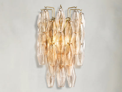 A statement in light and form, the Jayara Sconce reinterprets 1950s Murano design into a vertical sculpture of glowing glass. Dozens of handblown polyhedral pendants spill down a compact tiered steel frame, catching and scattering light in every direction. Whether flanking a mirror, illuminating a hallway, or anchoring a modern vignette, it’s a conversation piece in any space.