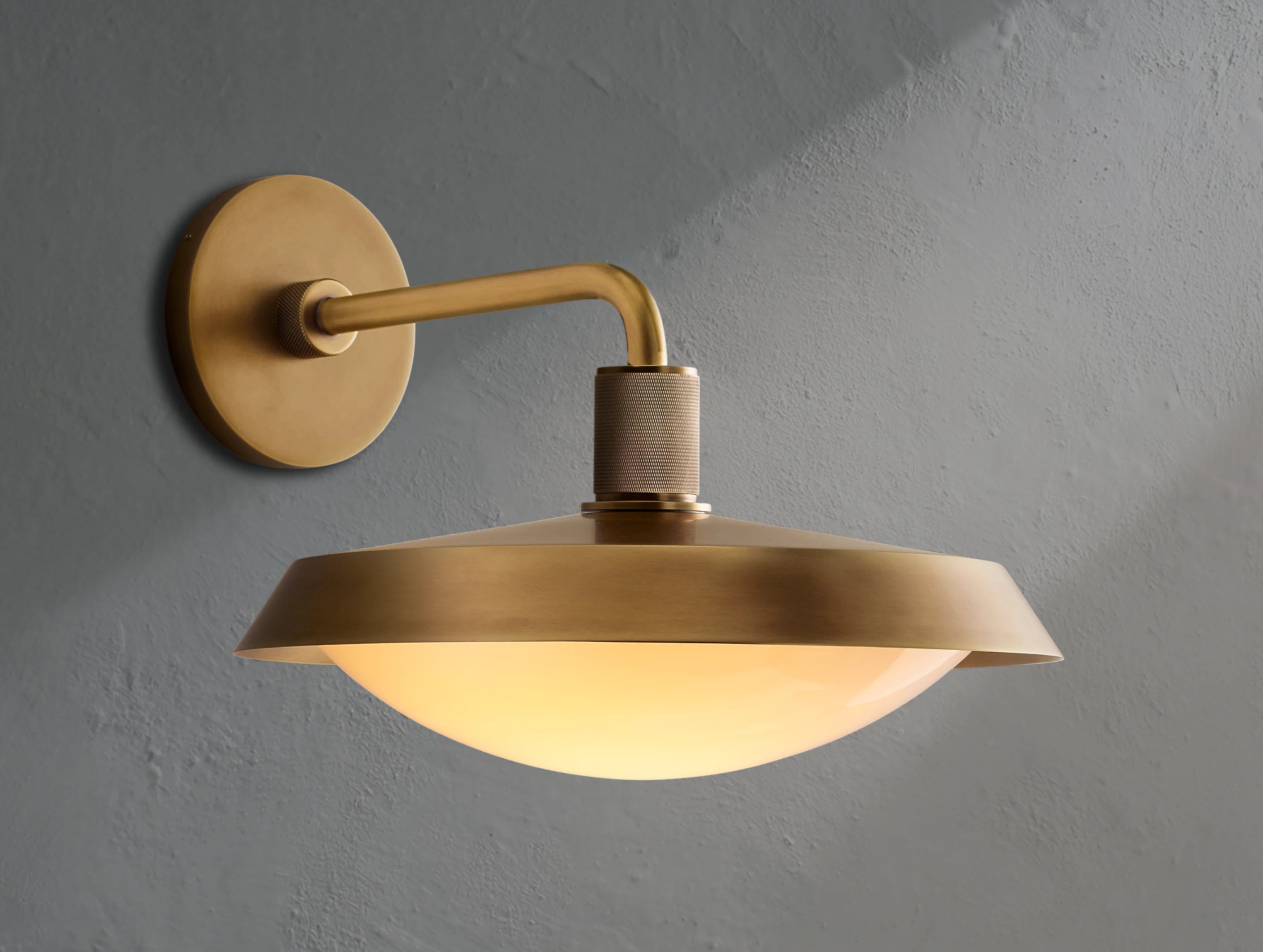 Designer Ian K. Fowler’s reimagining of the classic barn lamp merges mid-century refinement with industrial heritage. Crafted from solid brass with fine knurled detailing, the sconce celebrates material honesty and precision. Its milk glass shade gently diffuses the light, casting a warm, inviting glow that enhances both modern and traditional interiors — equally suited for indoor or outdoor use.