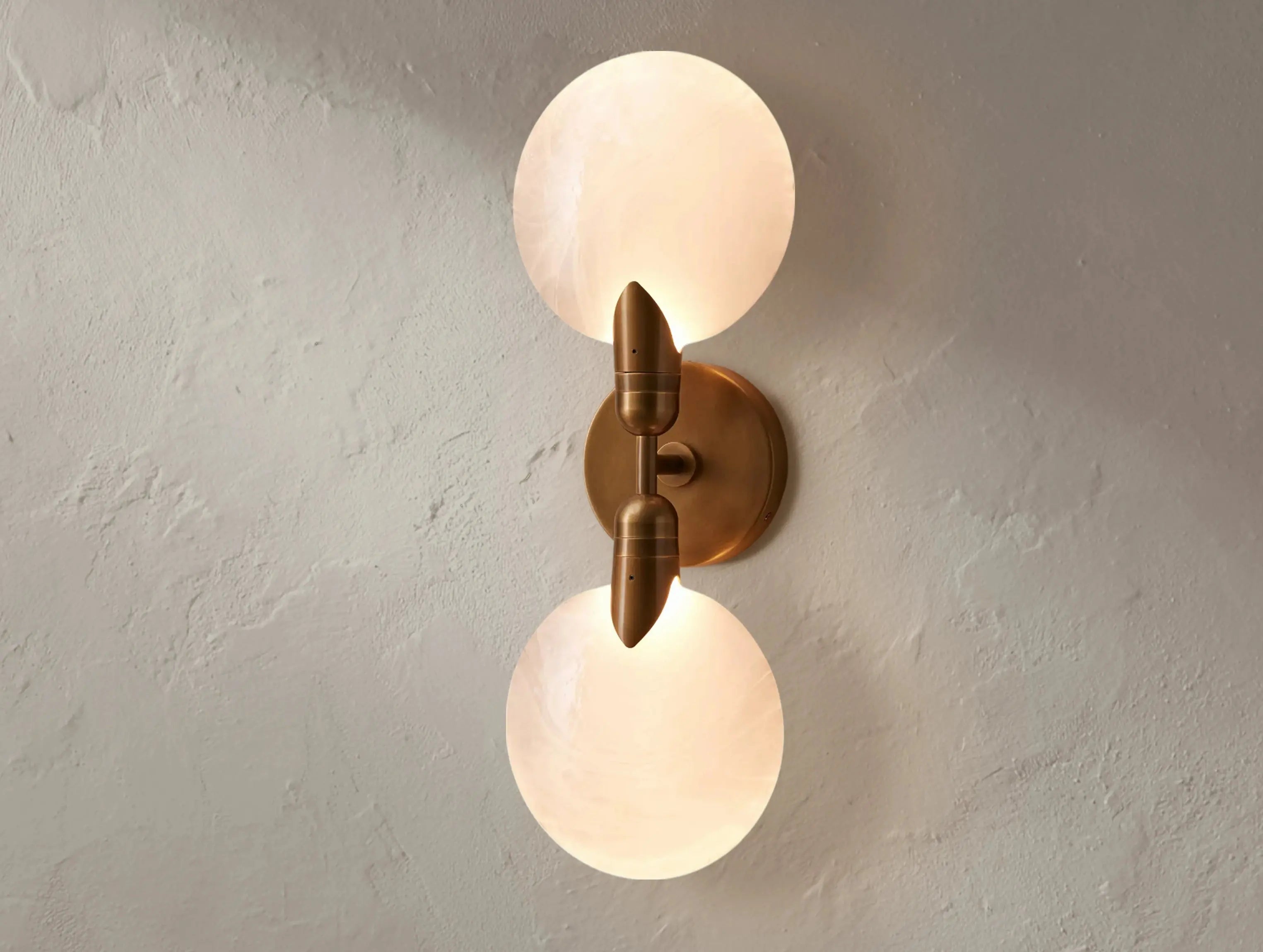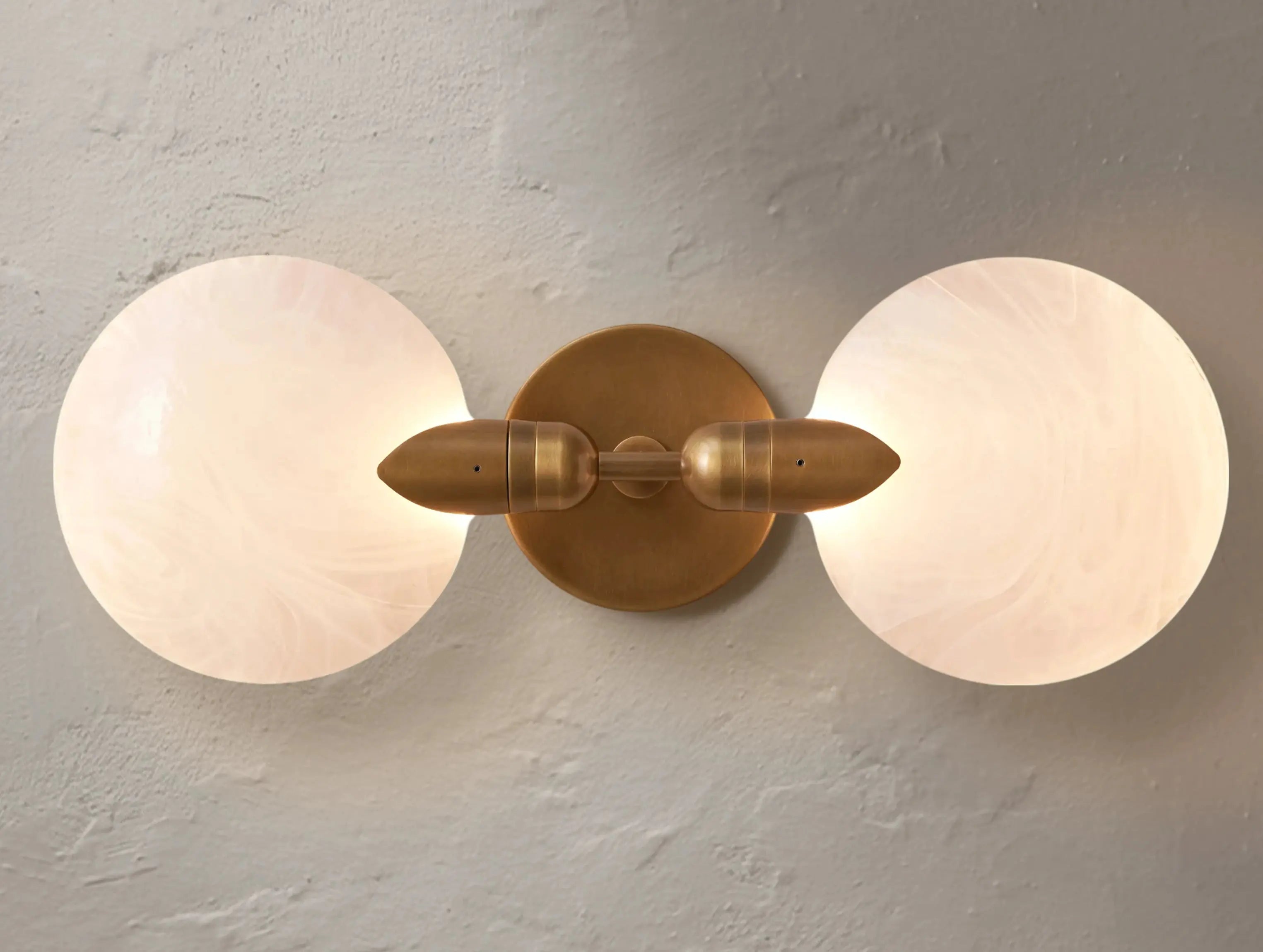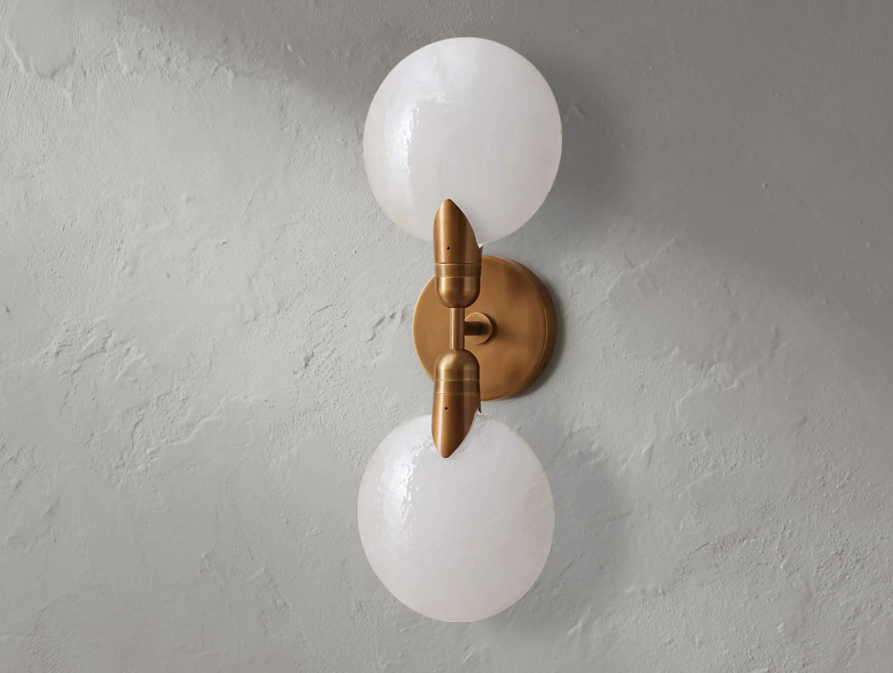 A sculptural statement for your walls, the Lylan Double Sconce features two petal-like glass discs, each hand-blown to reveal unique swirls and textures when lit. Warm, integrated LED lights offer a soft yet striking glow—ideal for flanking mirrors or brightening narrow hallways with modern elegance.