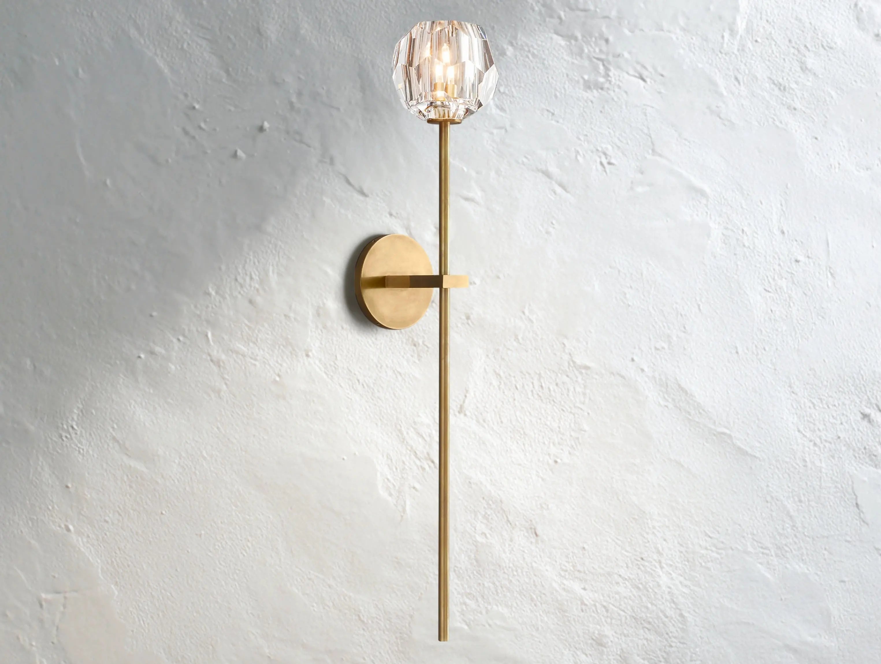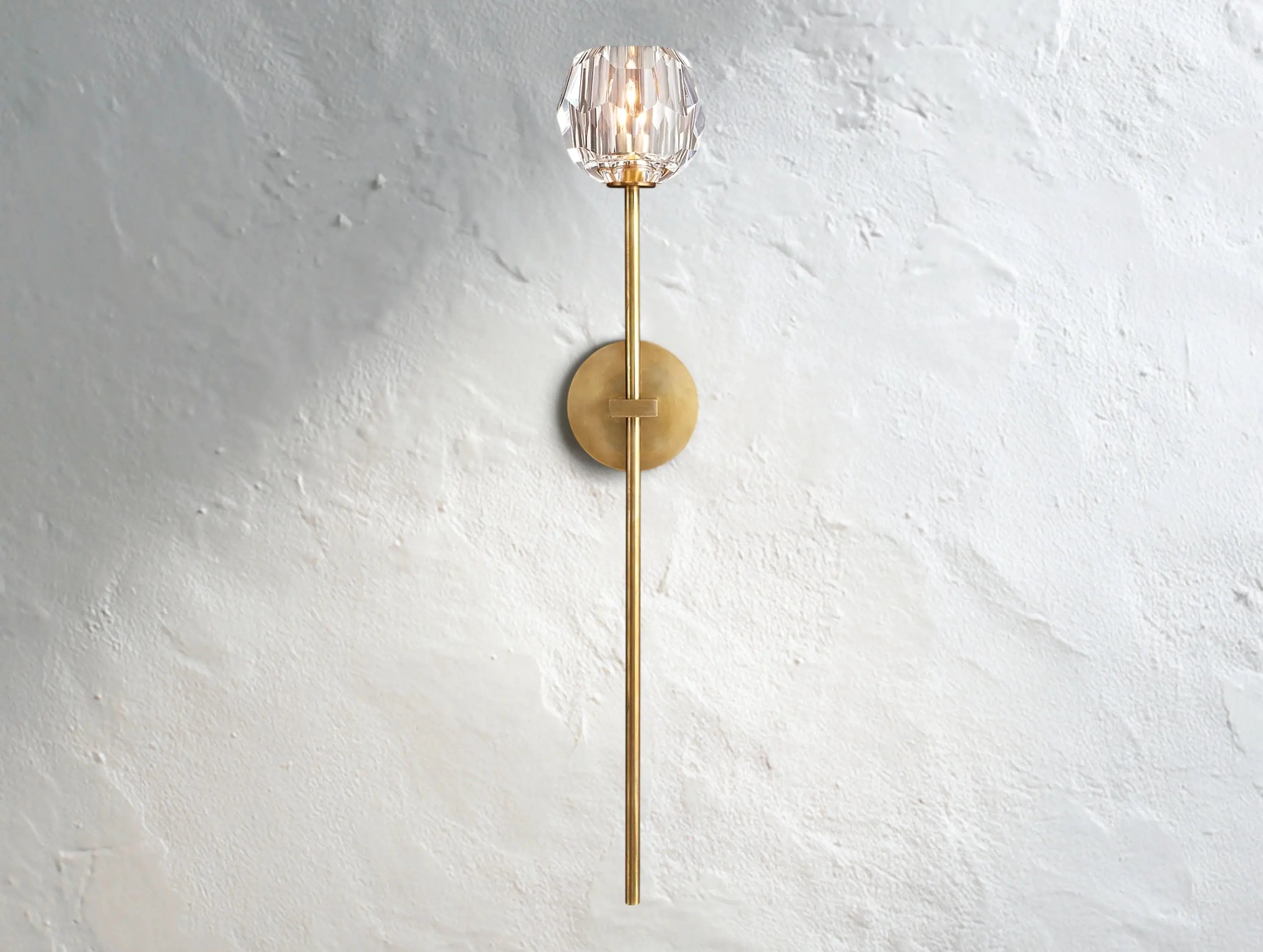 Luminous and architectural, this oversized wall sconce reinterprets classic crystal lighting through a modern lens. Anchored by a substantial brass frame, a single hand-polished crystal sphere casts a warm, faceted glow—perfect for entryways, stairwells, or luxurious baths.