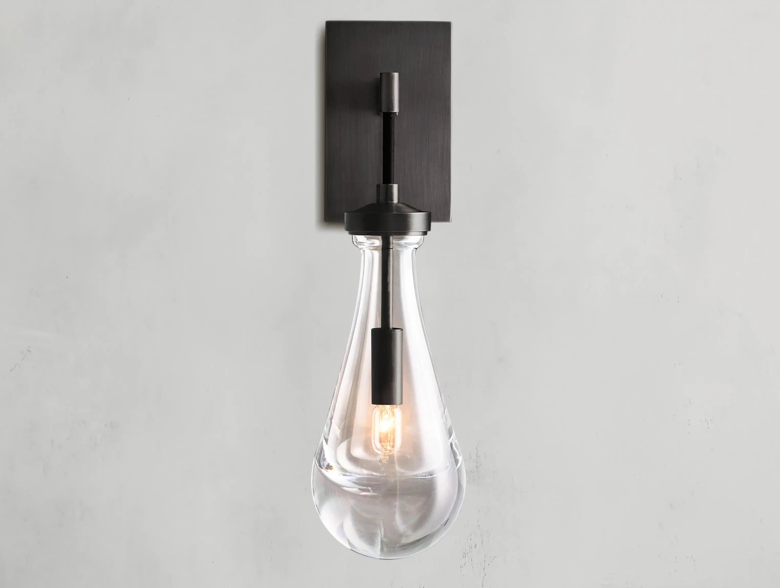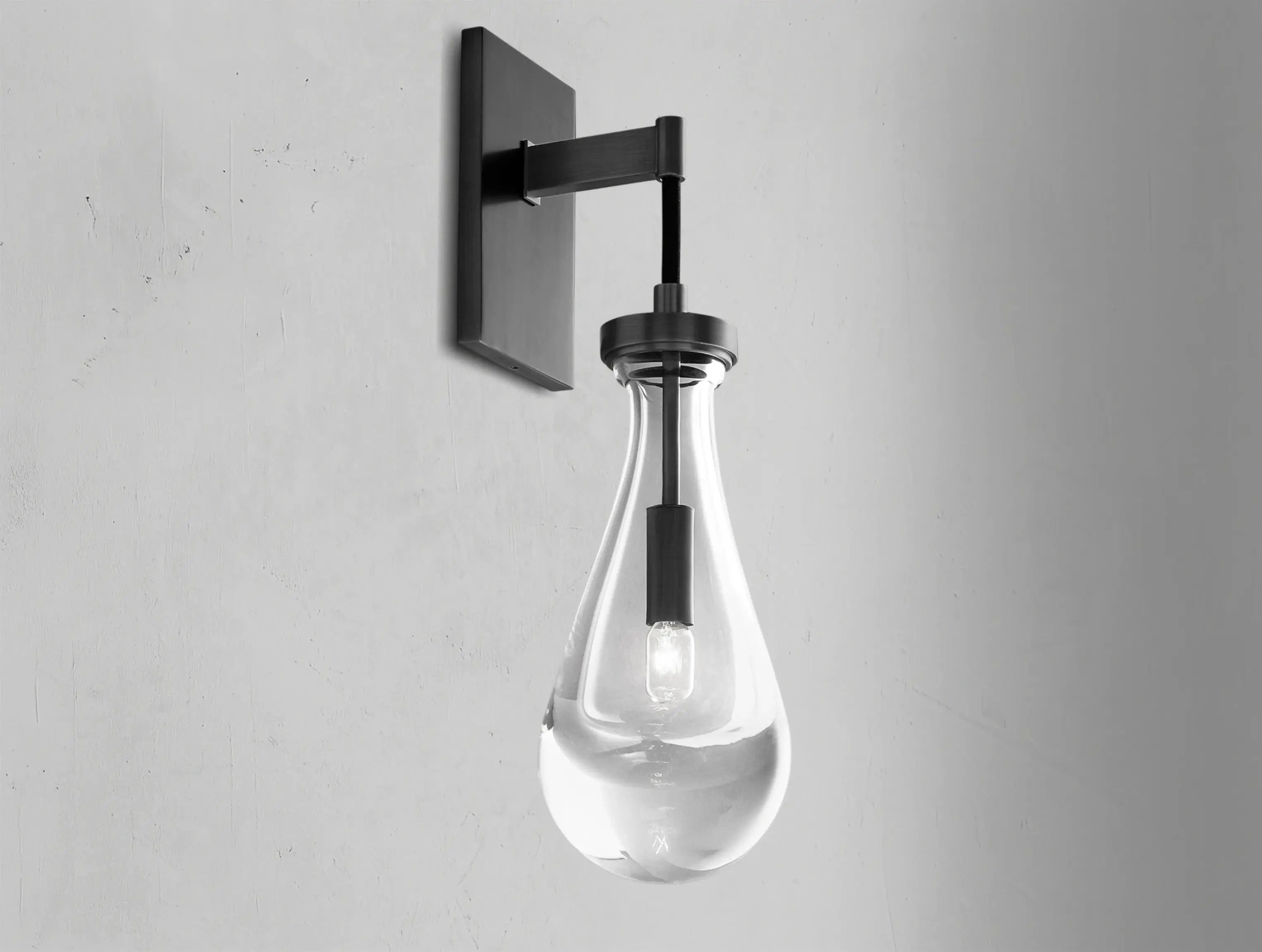 Echoing the quiet grace of a falling droplet, this wall-mounted sconce suspends a single handblown glass form in a minimal brass frame. The result is a glowing sculpture that brings warmth and refinement to hallways, bedrooms, or powder rooms.