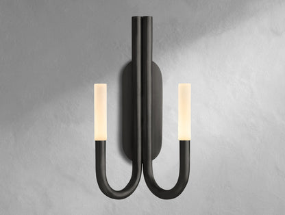 Inspired by minimalist mid-century Italian design, this wall sconce embodies pure geometry and graceful balance. Rousseau’s elegantly upraised brass arms hold etched glass shades that emit a soft, diffused glow when lit. Its clean silhouette and warm illumination bring a sense of modern refinement to any interior.