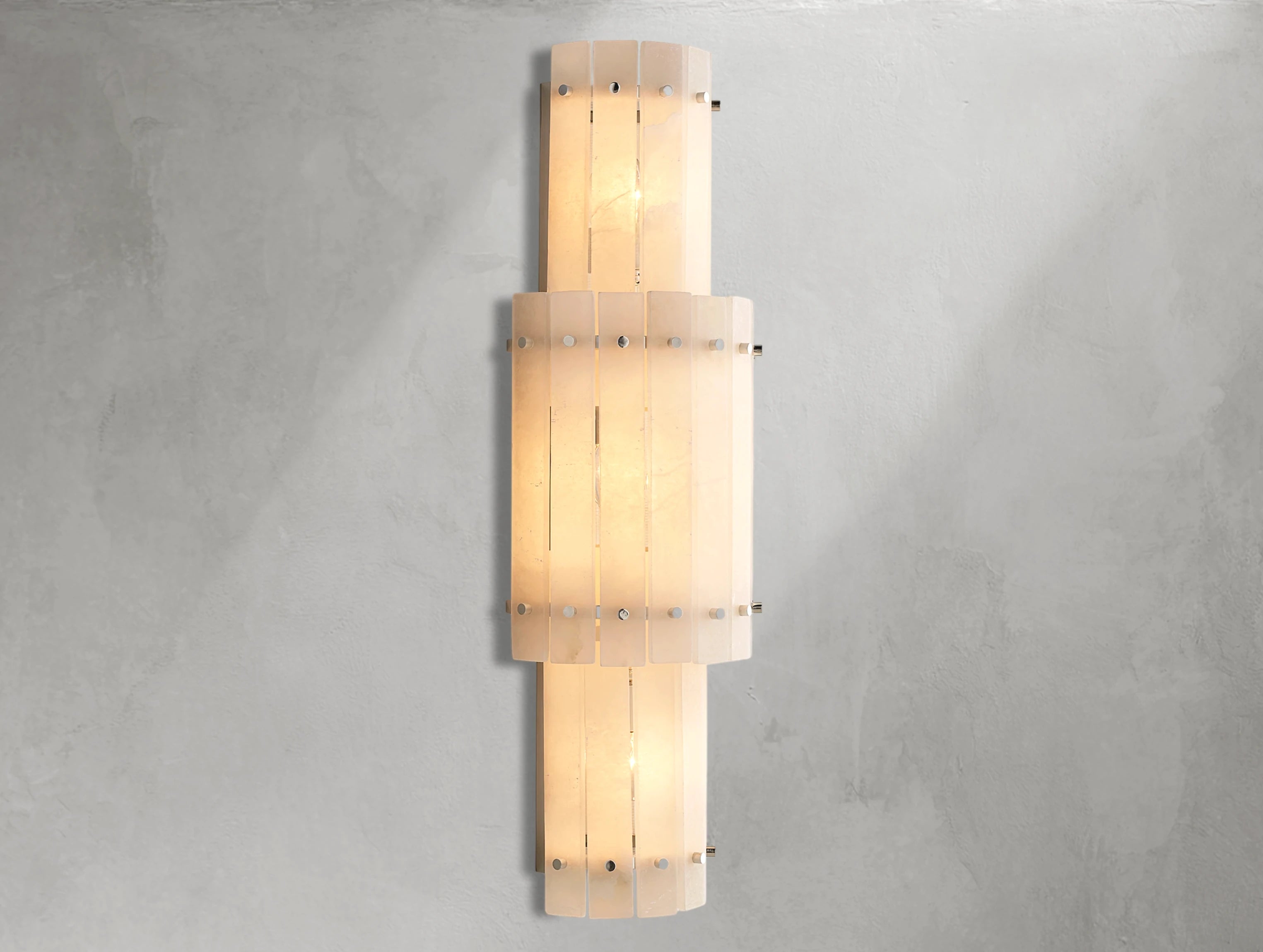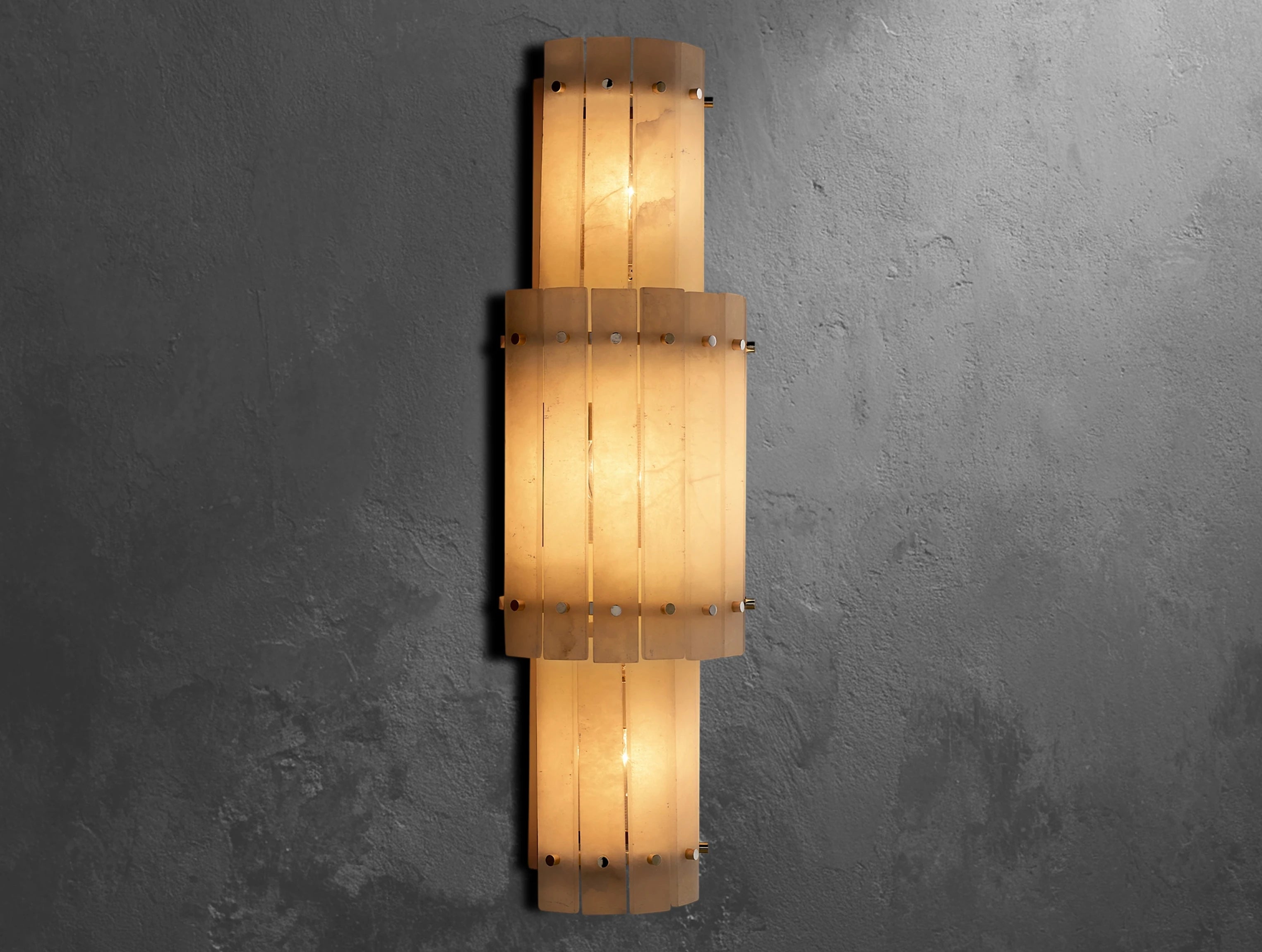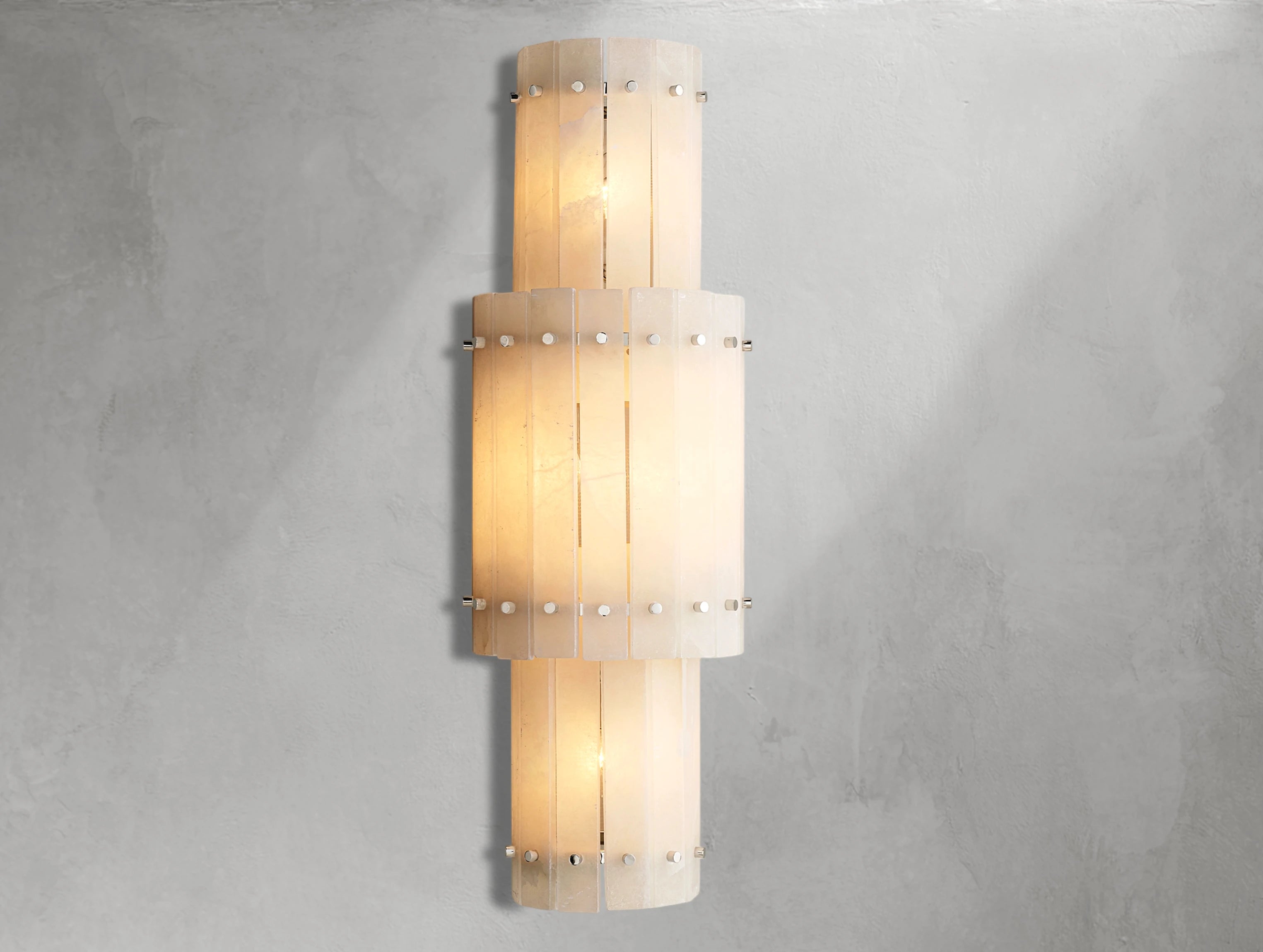 The Royce alabaster grand round sconce recalls the glamour of 1960s Italian lighting with its sculptural form and soft radiance. Translucent alabaster panels are hand-set within a sleek steel frame, producing a natural variation of light and a gently diffused glow. Rated for four bulbs and dimmer compatible, it can be mounted vertically or horizontally, making it a versatile statement piece for modern interiors.