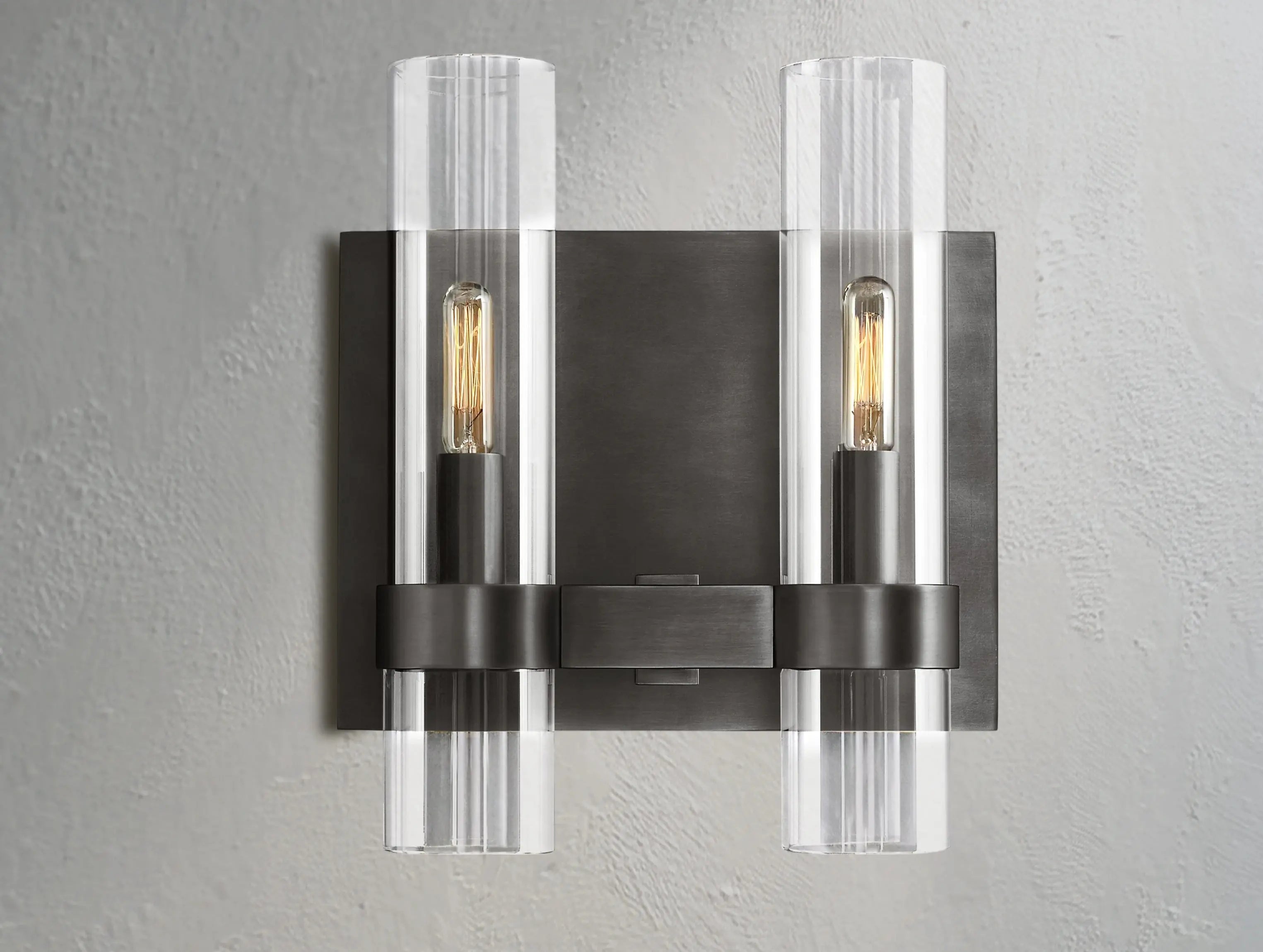 With its symmetrical silhouette and glowing twin glass columns, the Solene Double Sconce captures the spirit of Art Deco through a minimalist lens. Blown glass shades diffuse a warm, inviting glow, while unembellished steel bands provide structure and balance. A refined addition to bathrooms, hallways, or any space in need of subtle drama.