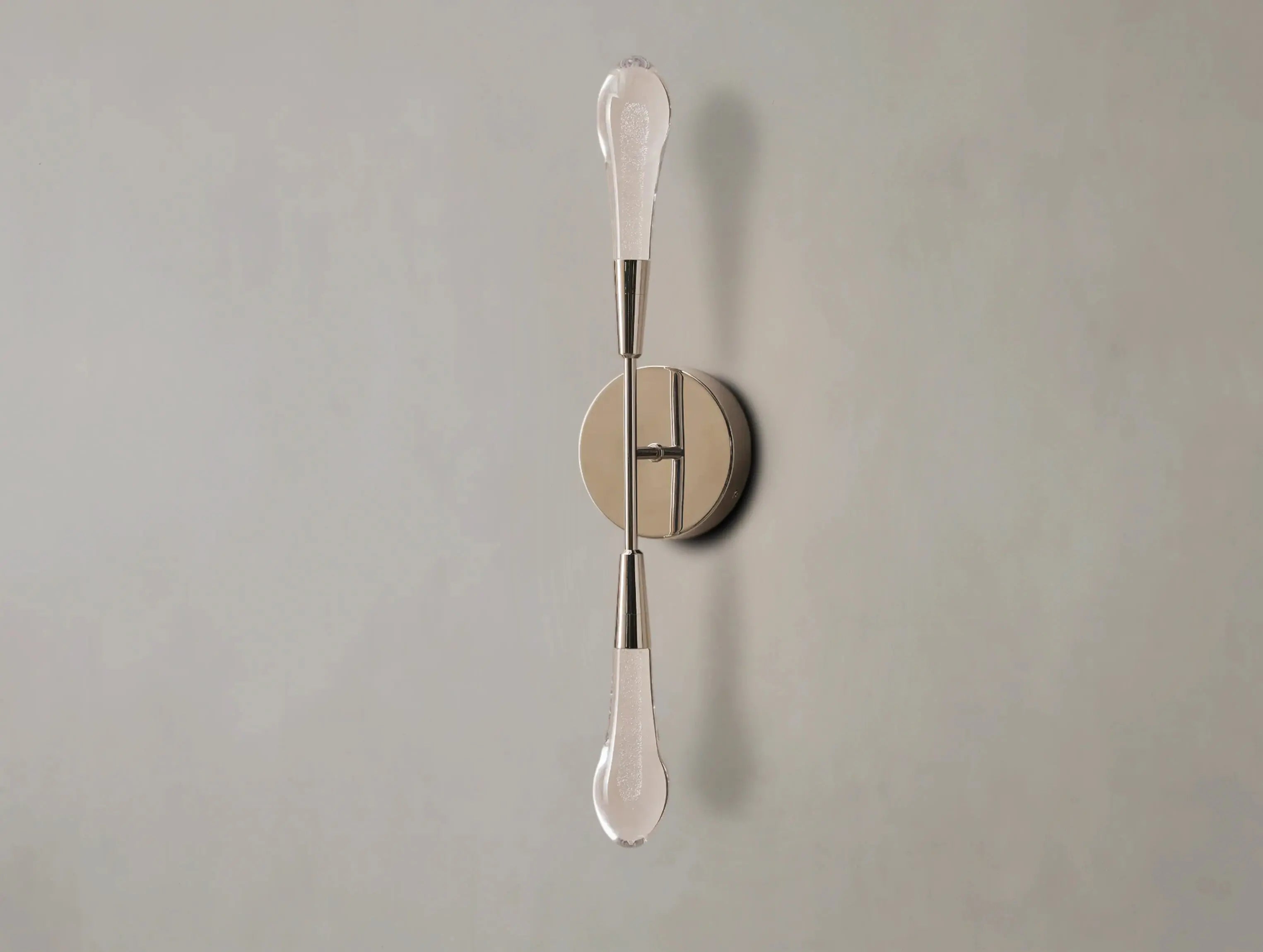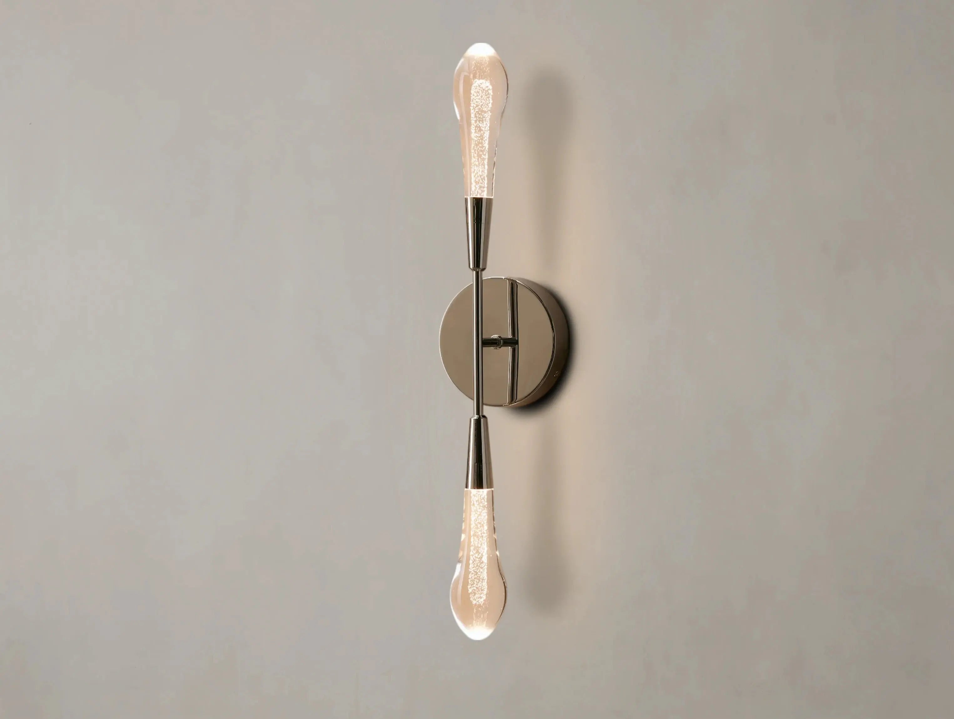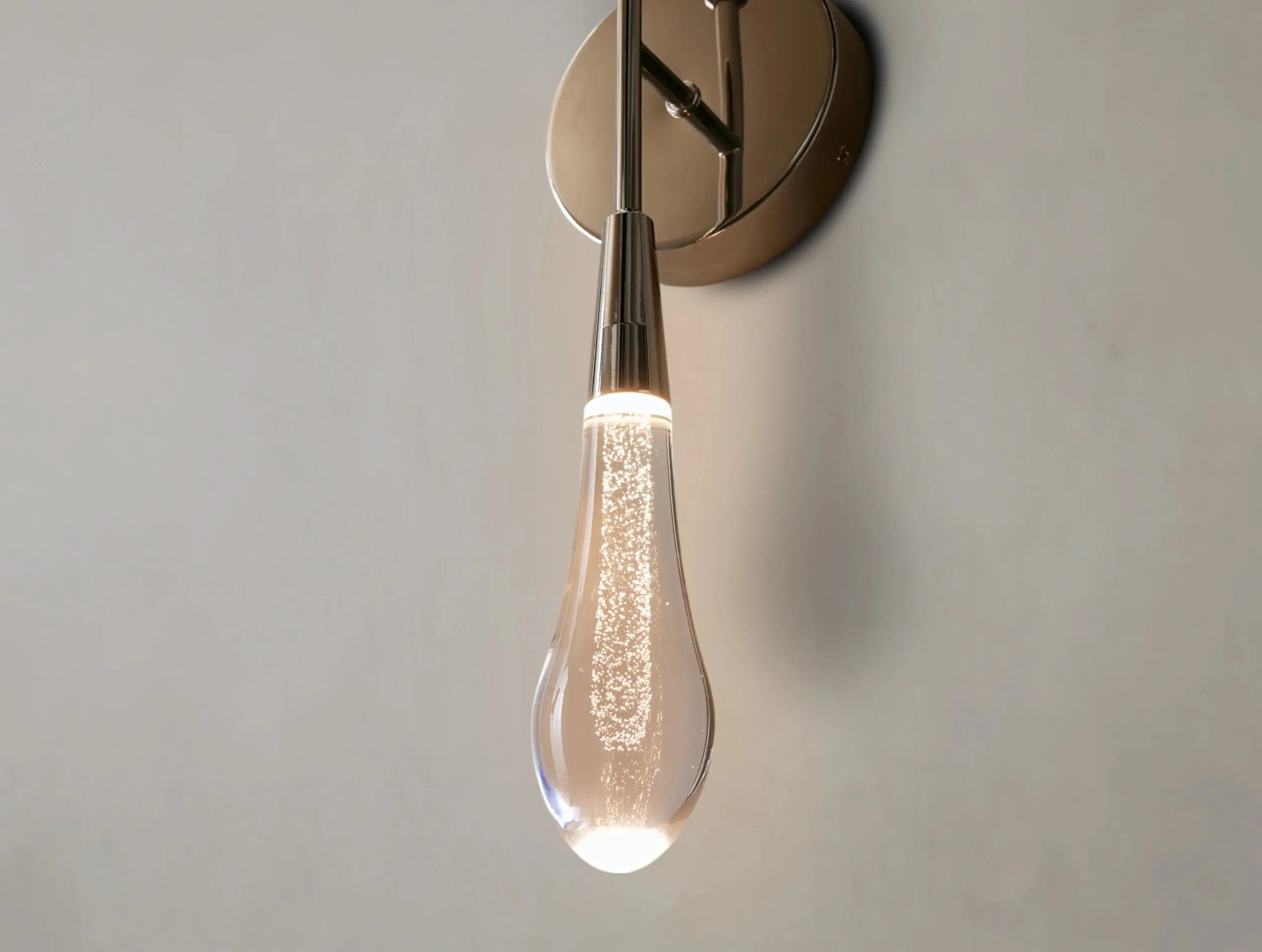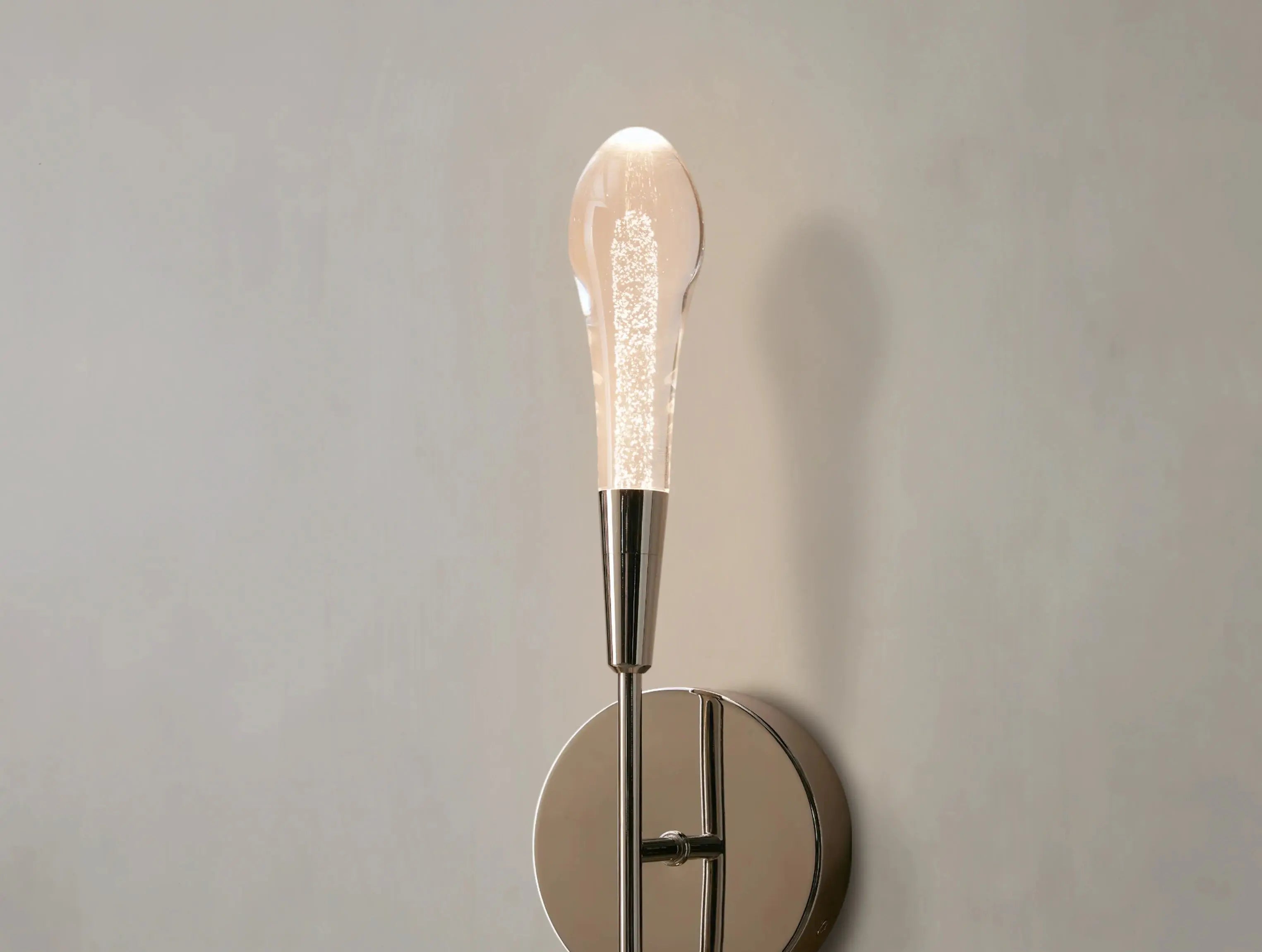 Inspired by the delicate moment of a falling raindrop, the Soltoire Sconce pairs a slender metal arm with a hand-blown seeded glass diffuser. The integrated LED casts a soft, calming glow—ideal for hallways, bedside walls, or serene bathrooms.