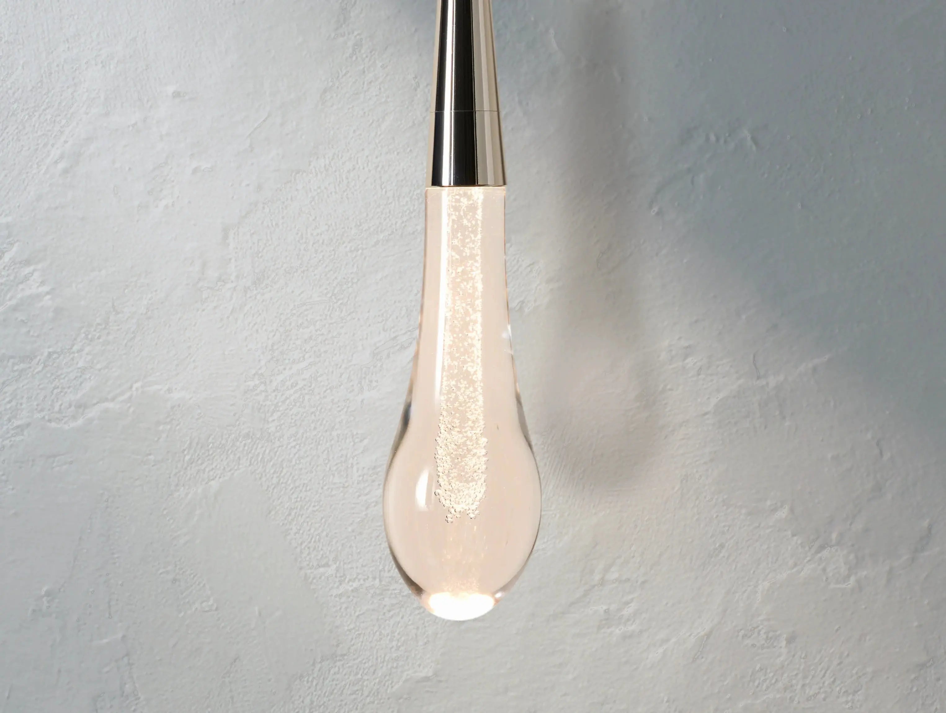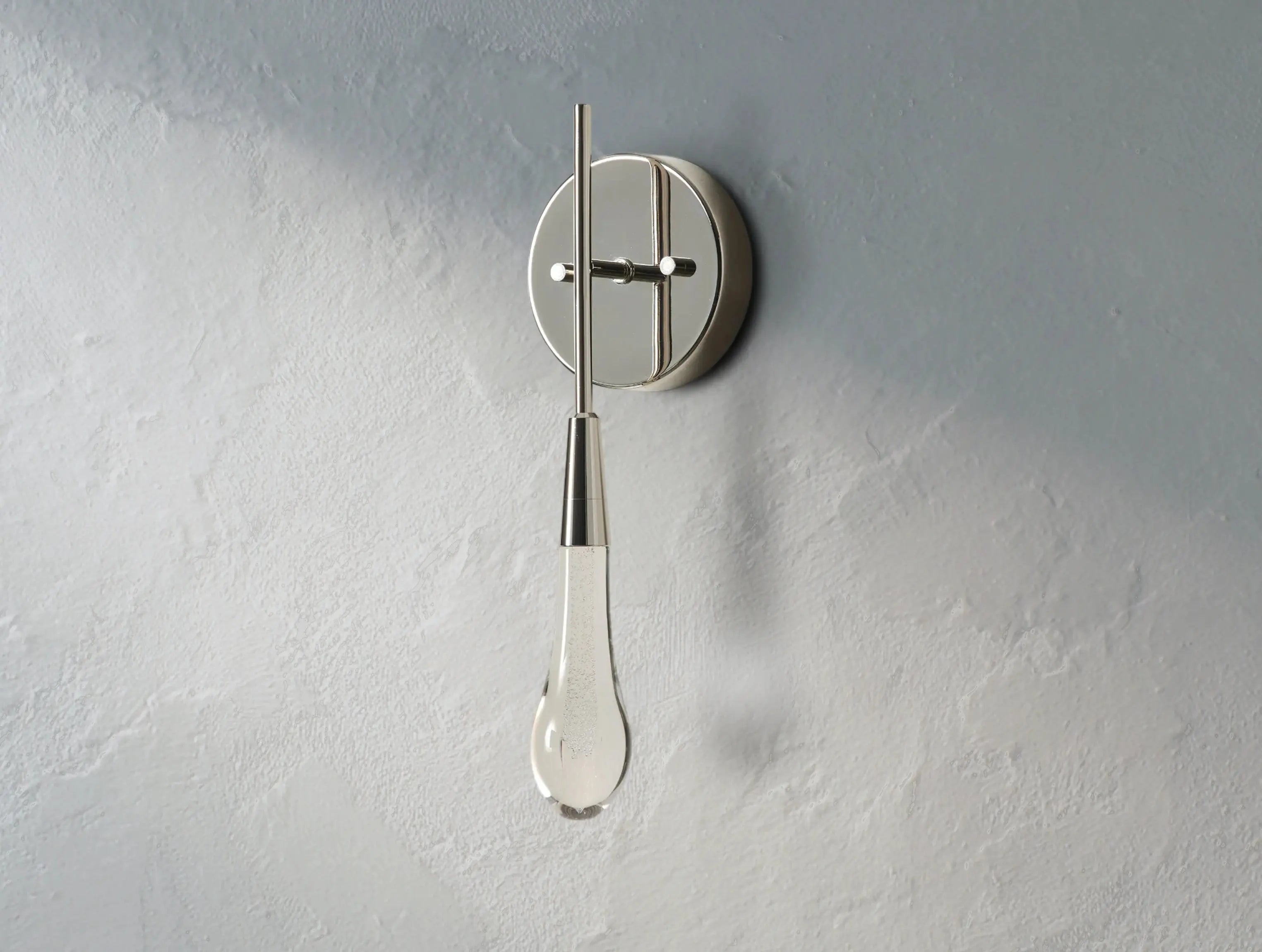 Inspired by the delicate moment of a falling raindrop, the Soltoire Sconce pairs a slender metal arm with a hand-blown seeded glass diffuser. The integrated LED casts a soft, calming glow—ideal for hallways, bedside walls, or serene bathrooms.