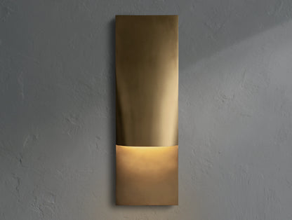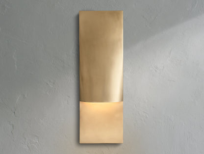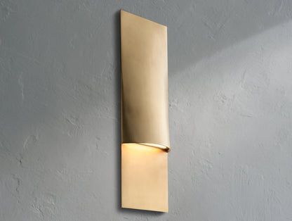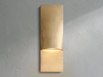 Casting a warm, focused glow, this wall sconce combines crisp geometric lines with a gently curved form for a subtle floating effect. Handcrafted from solid brass and lightly textured to highlight the metal’s natural luster, it embodies the refined balance of postmodern design. The integrated dimmable LED provides a soft 2700K light suitable for both indoor and outdoor settings.