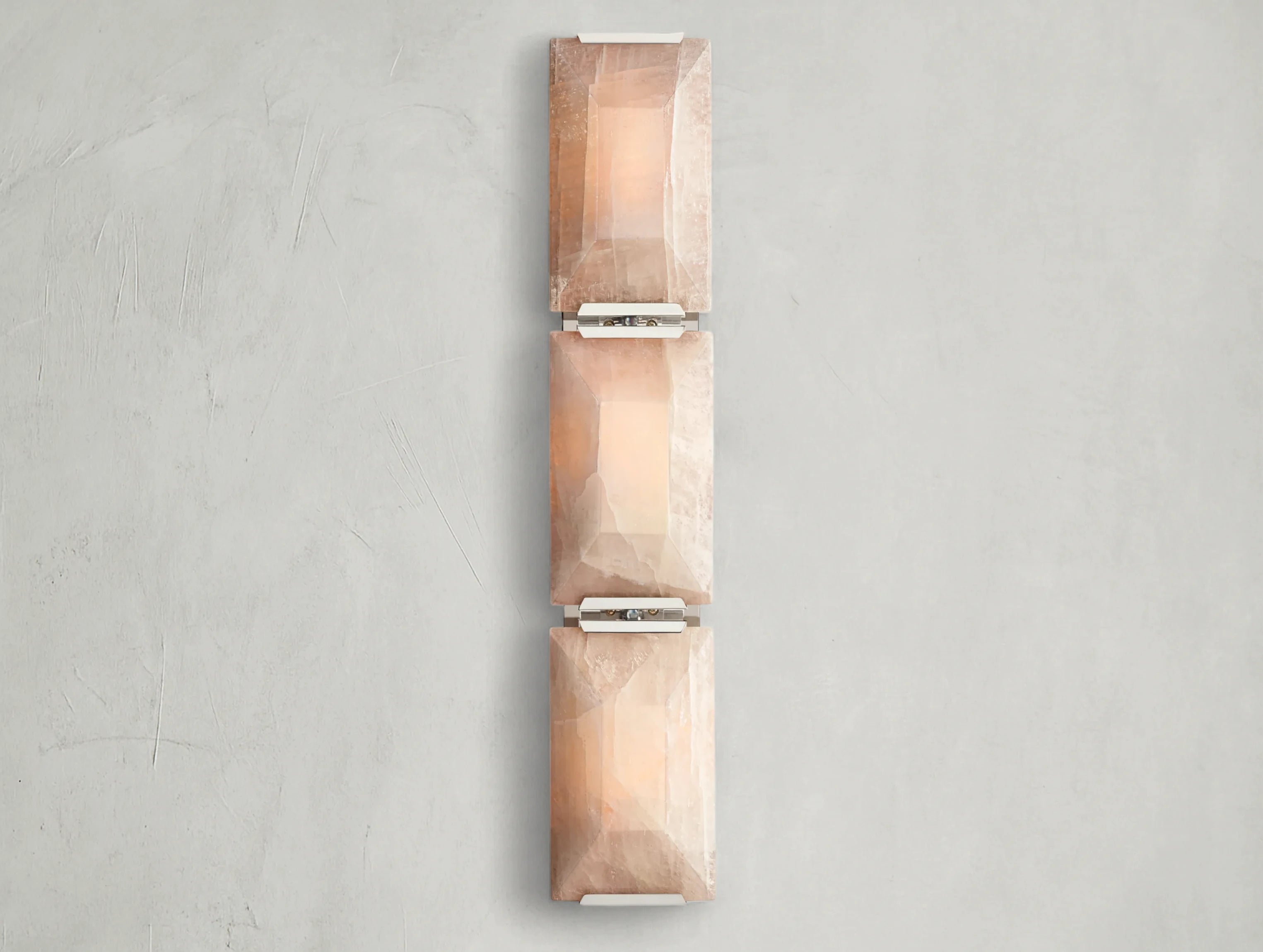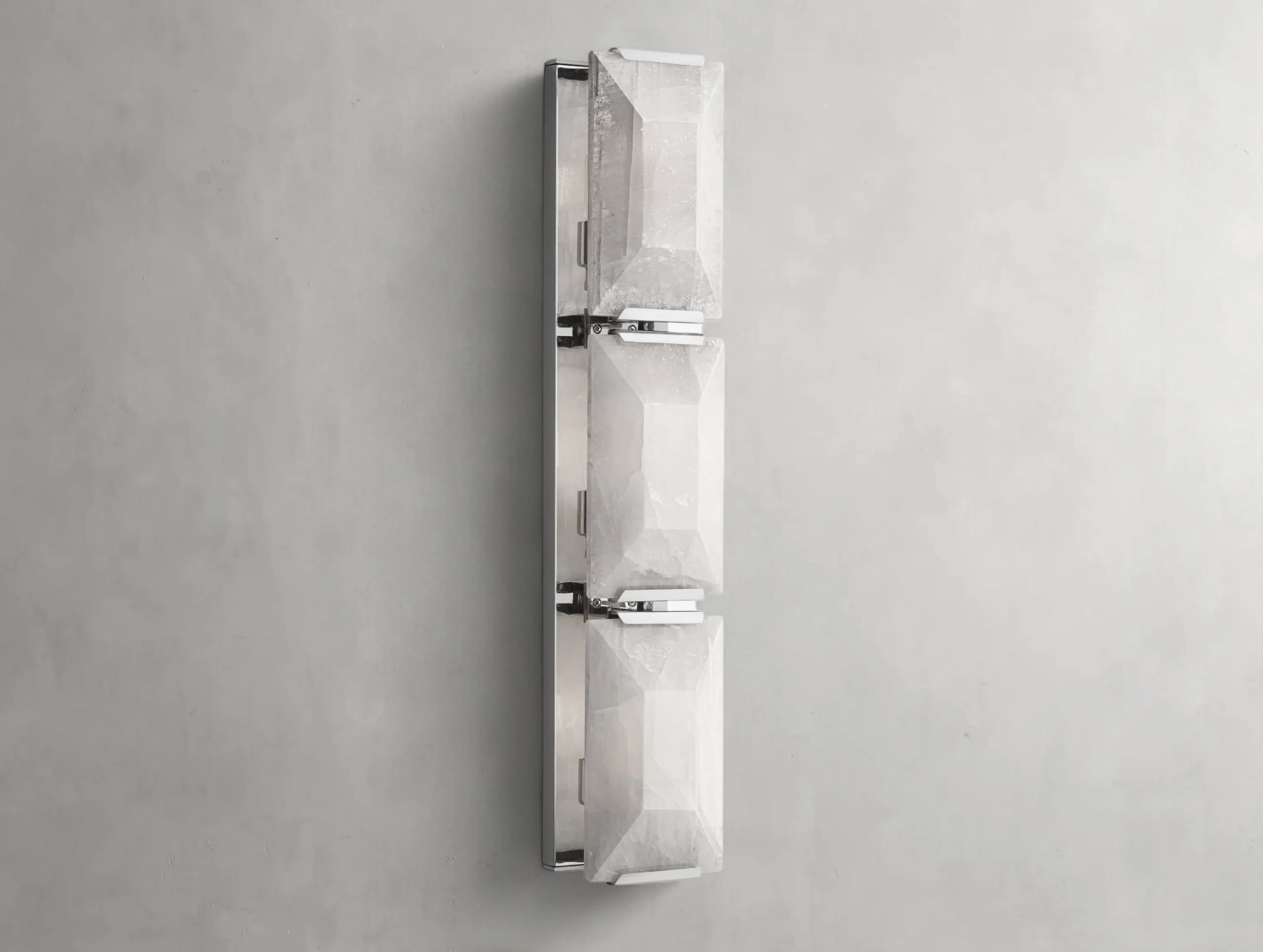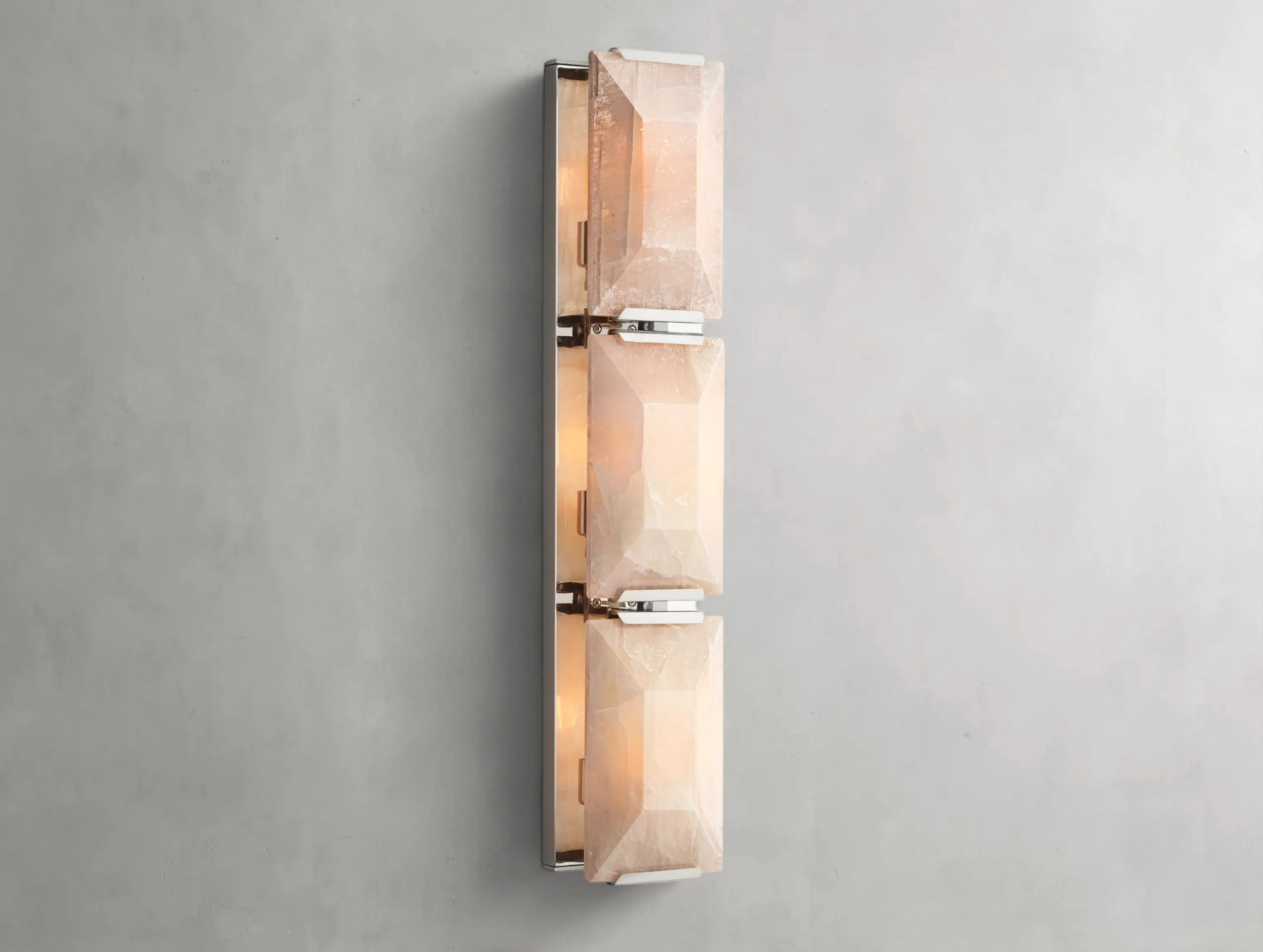 The Harlow Calcite Triple Sconce blends natural stone beauty with a refined vertical form. Three translucent calcite prisms, hand-cut into faceted slabs, are secured with sleek metal mounts to allow warm light to pass through, highlighting their unique crystal patterns. Each piece is artisan-crafted, ensuring no two are exactly alike.