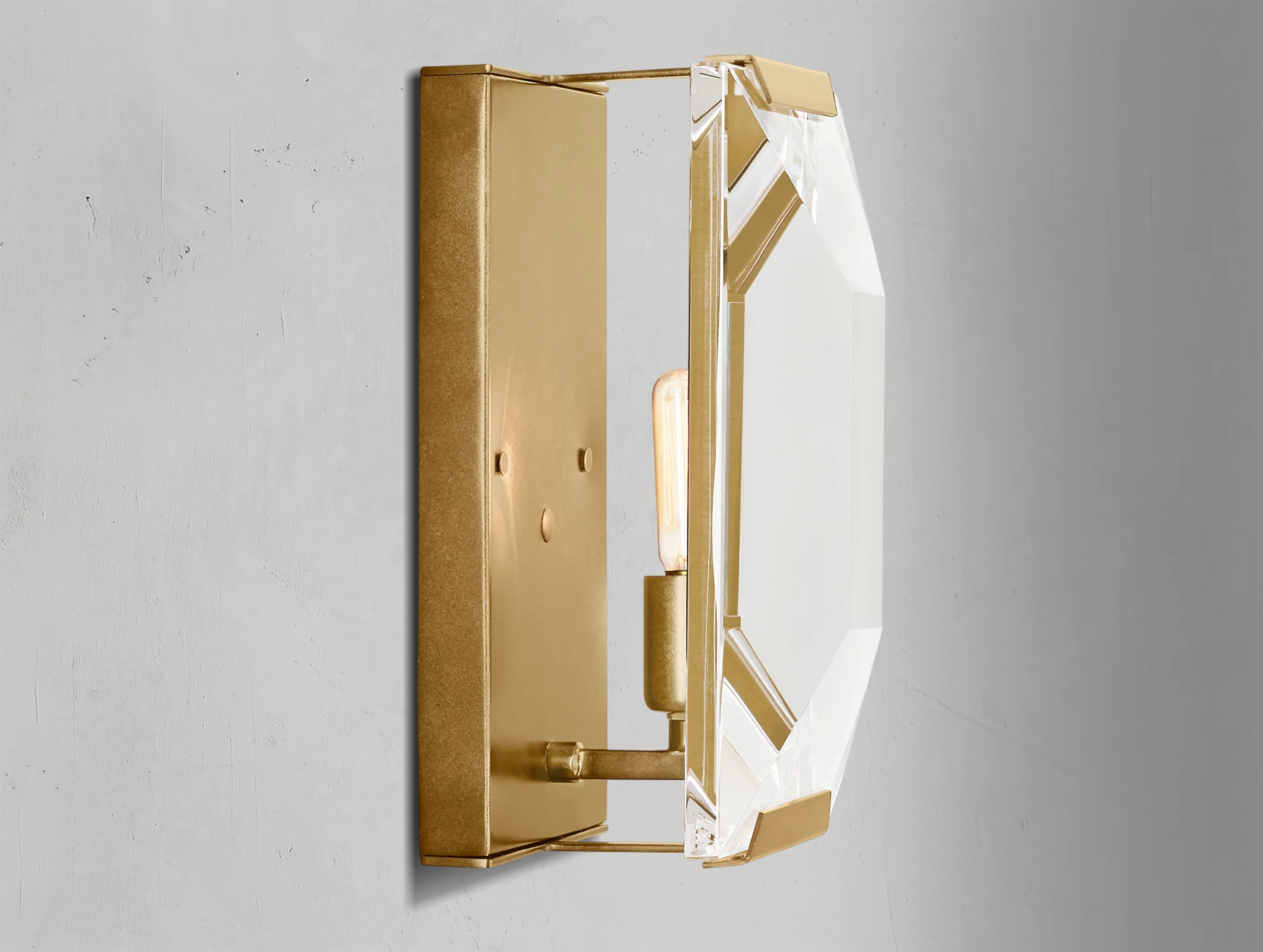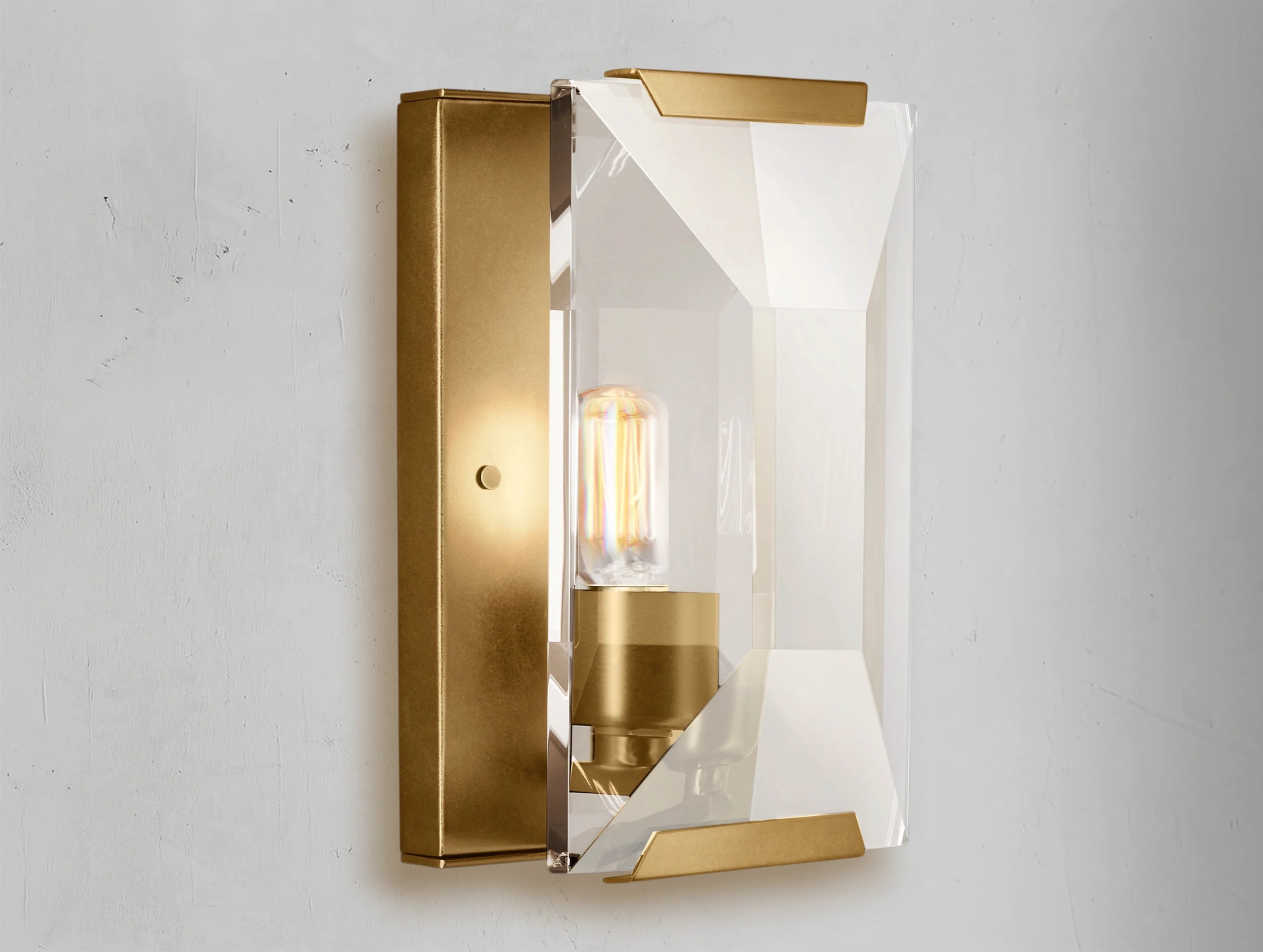 The Valonne Crystal Sconce brings a refined 1970s German influence into modern interiors. Its hand-faceted crystal prism plays with the light, scattering it in a way reminiscent of an emerald-cut gemstone, adding a subtle touch of vintage glamour.