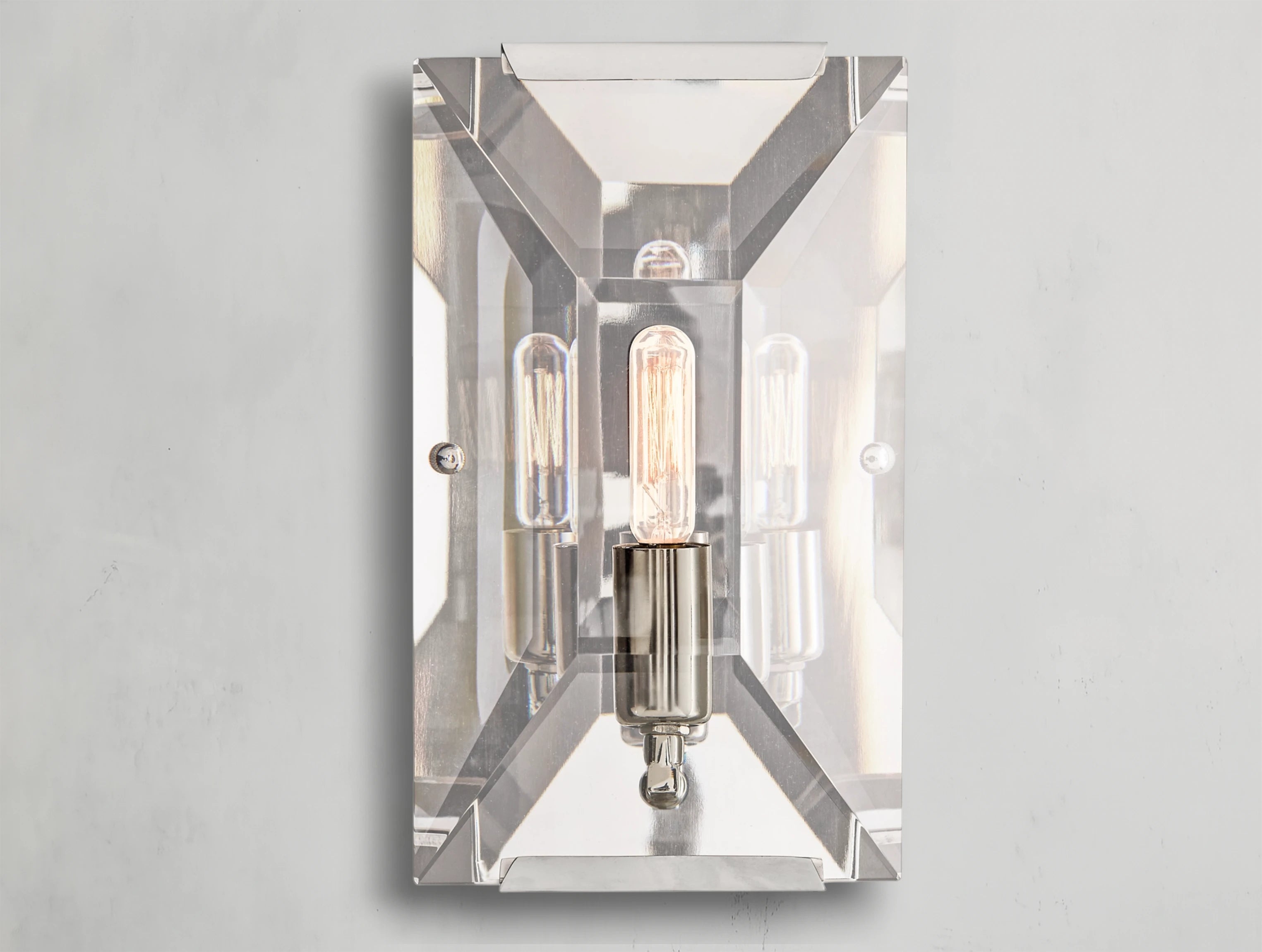 The Valonne Crystal Sconce brings a refined 1970s German influence into modern interiors. Its hand-faceted crystal prism plays with the light, scattering it in a way reminiscent of an emerald-cut gemstone, adding a subtle touch of vintage glamour.