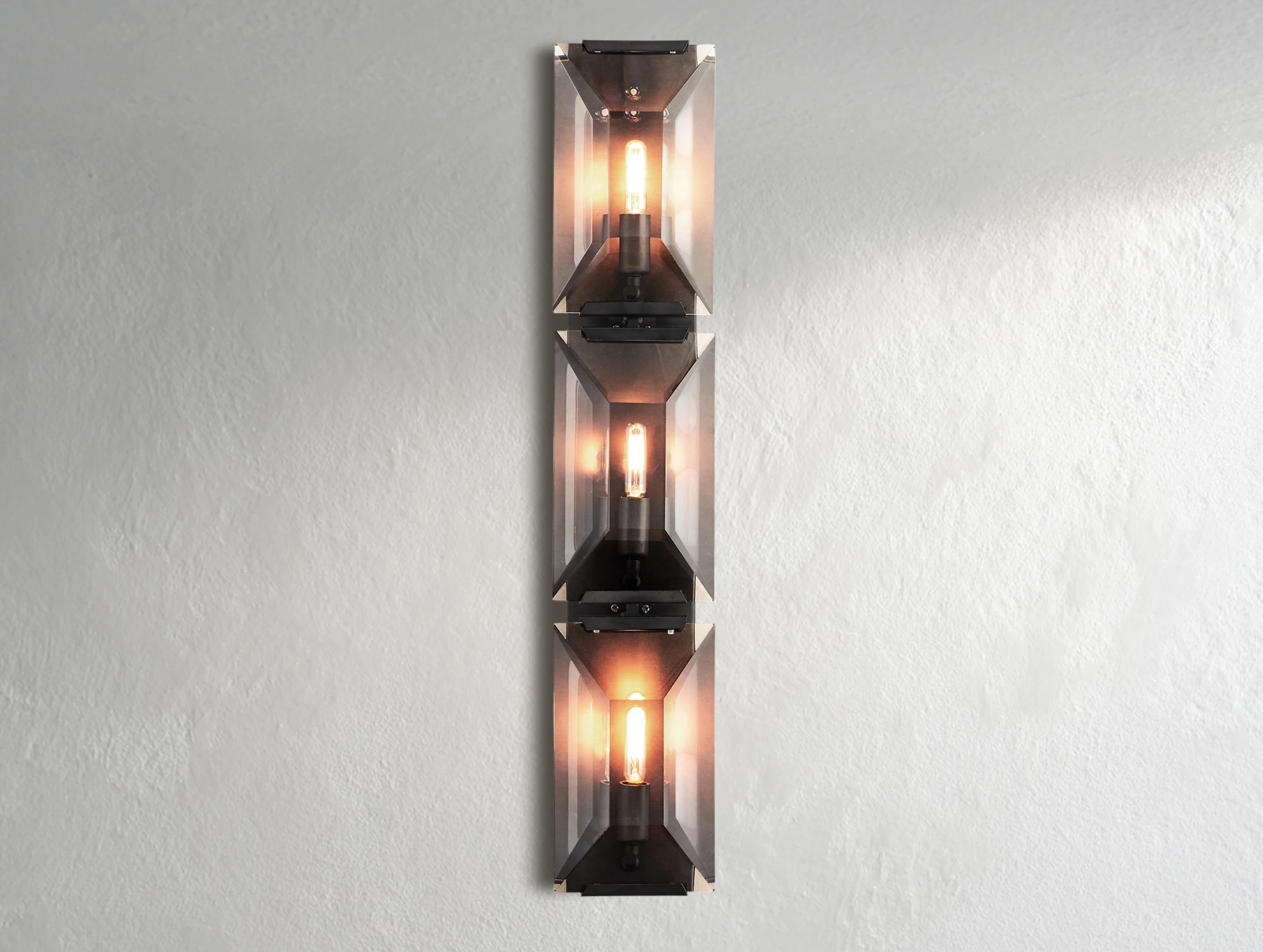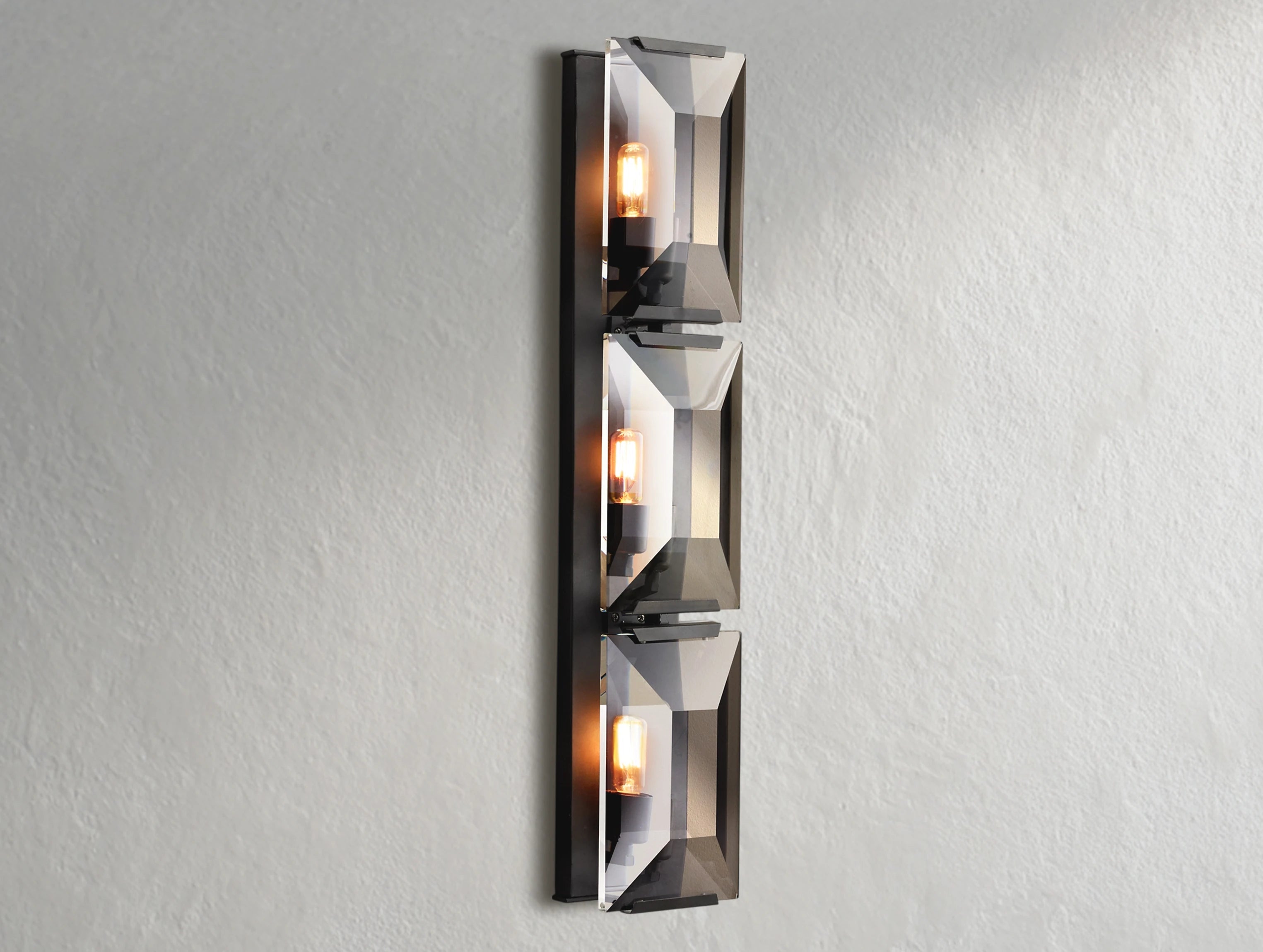 The Valonne Crystal Triple Sconce brings the sophisticated drama of 1970s German design into your home. Three hand-faceted crystal prisms scatter light with the brilliance of emerald-cut gems, creating a refined yet glamorous statement on your wall.