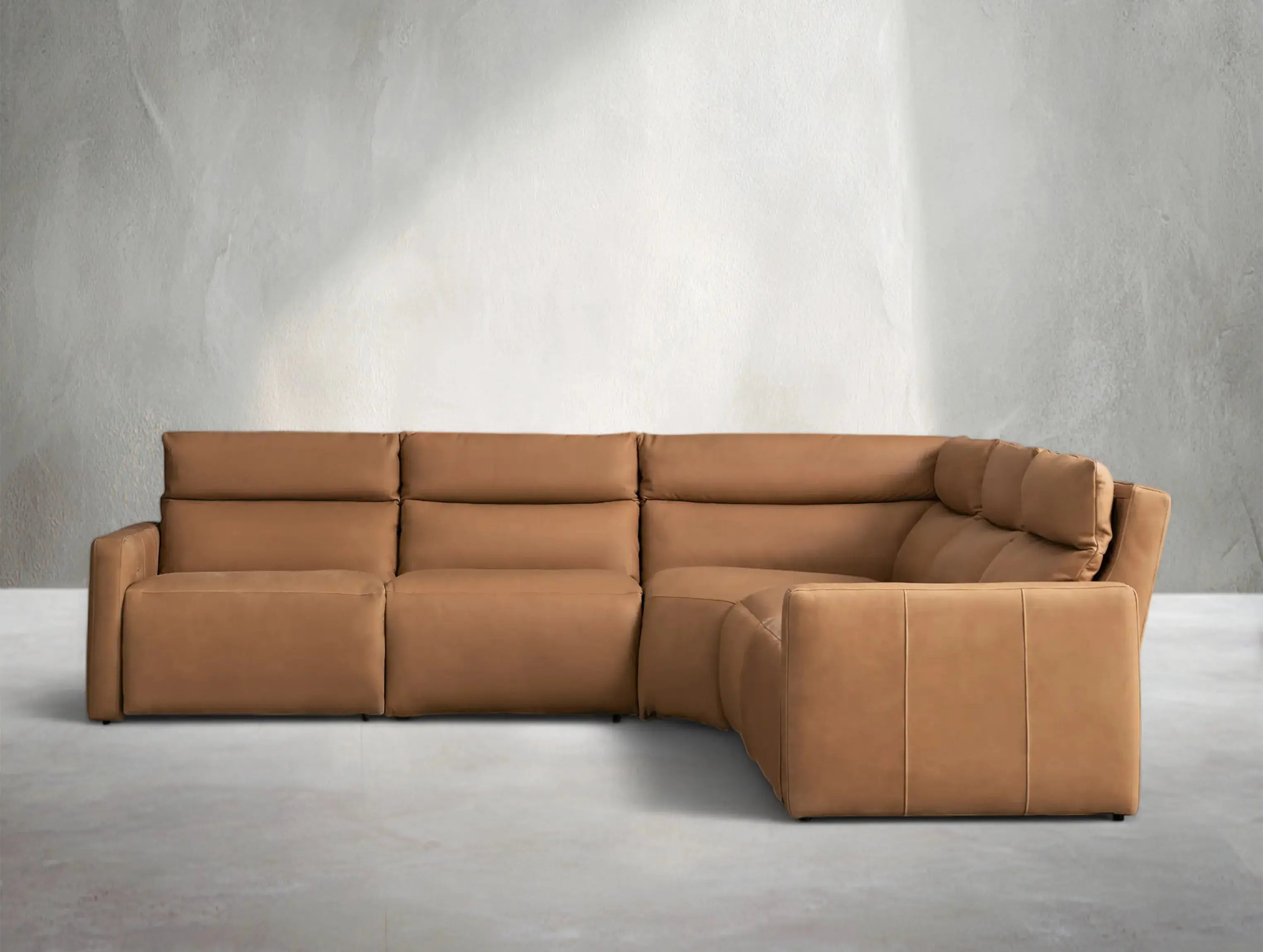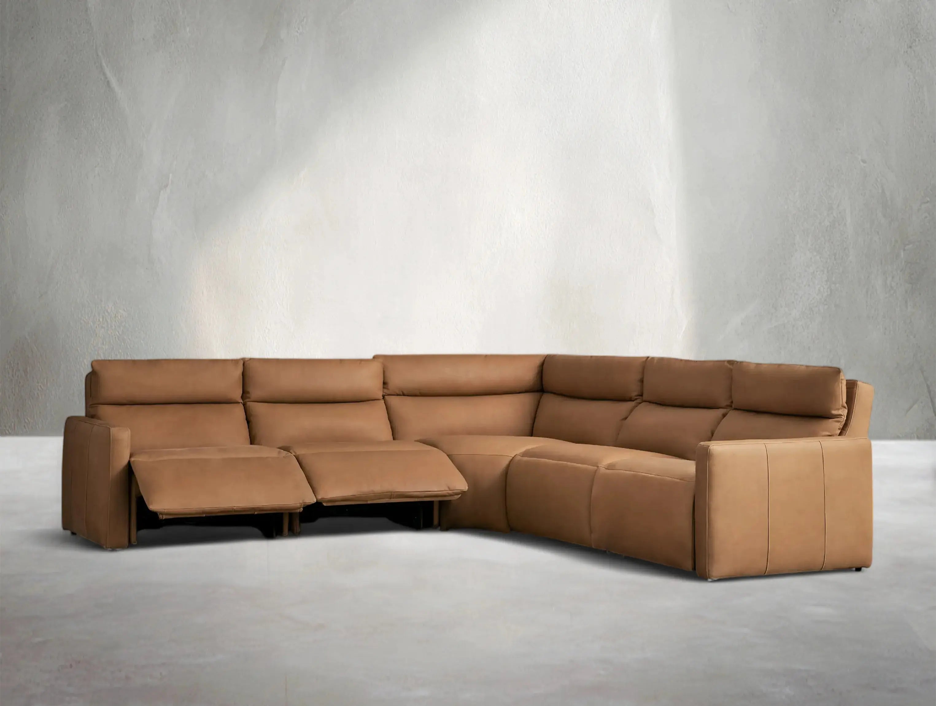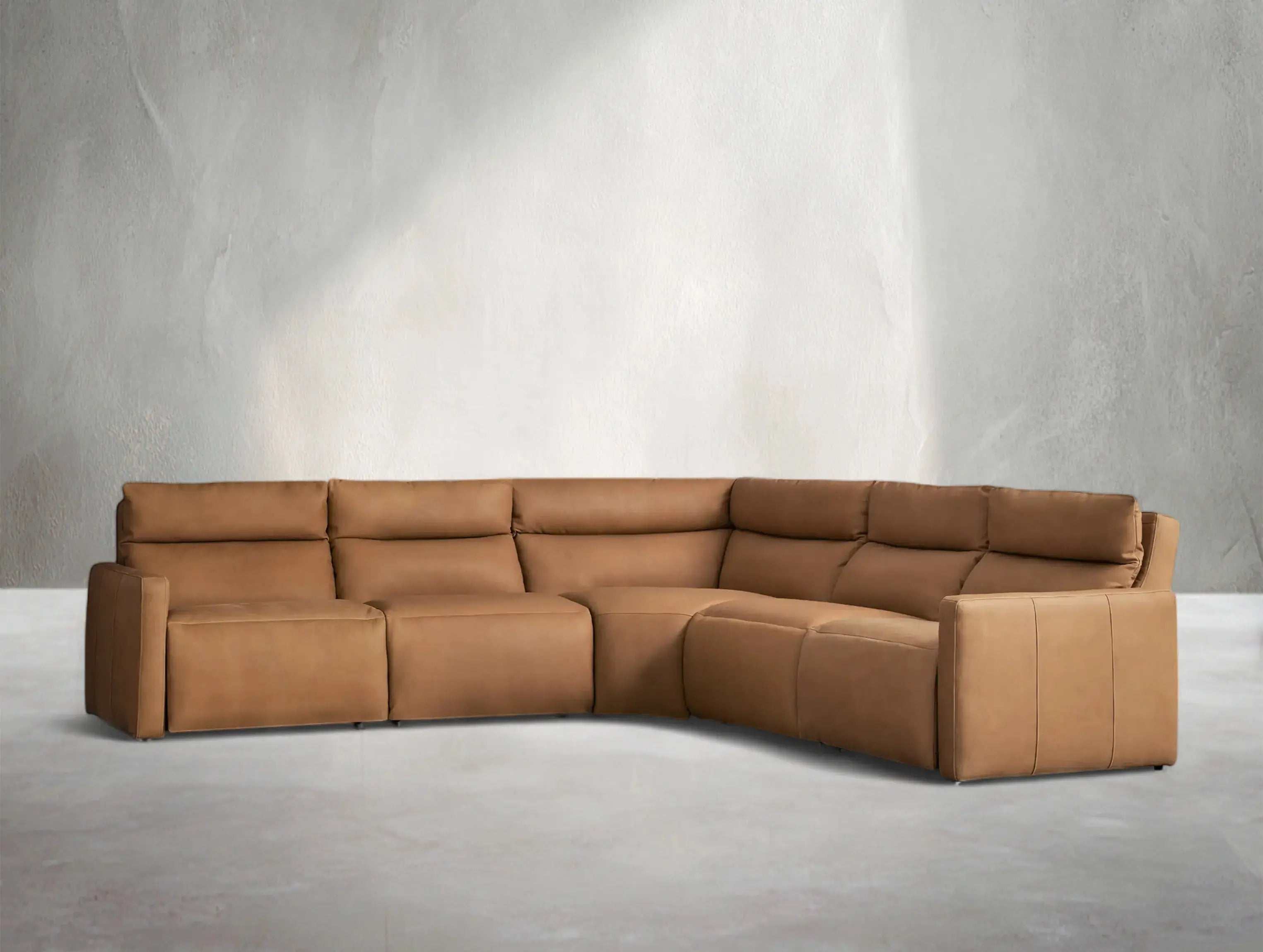 A contemporary take on comfort, this five-piece motion sectional blends crisp tailoring with deep, sink-in seating. Featuring artisan-finished leather and smooth two-button recline, it’s designed to bring effortless ease and modern refinement to your lounging experience.