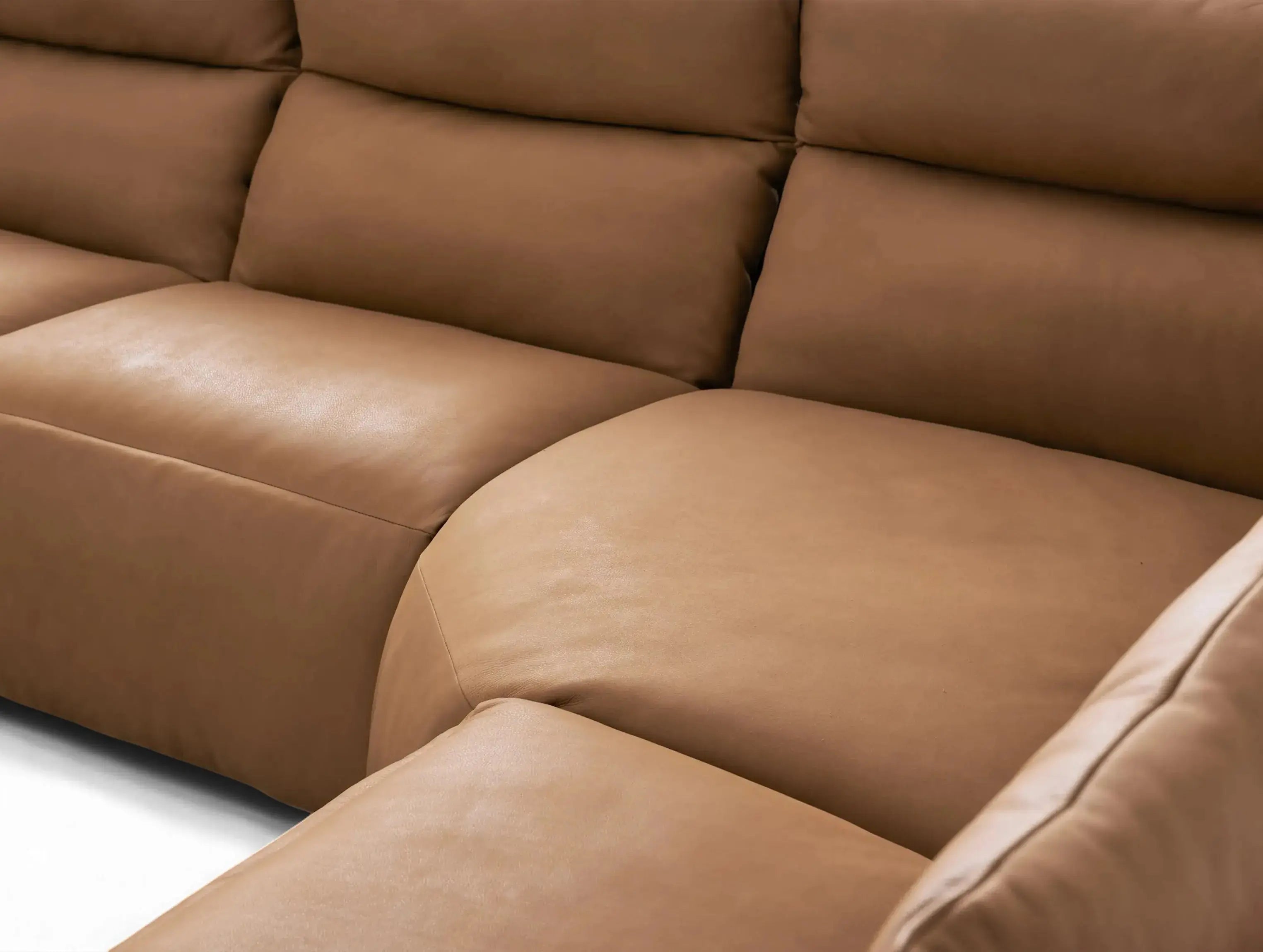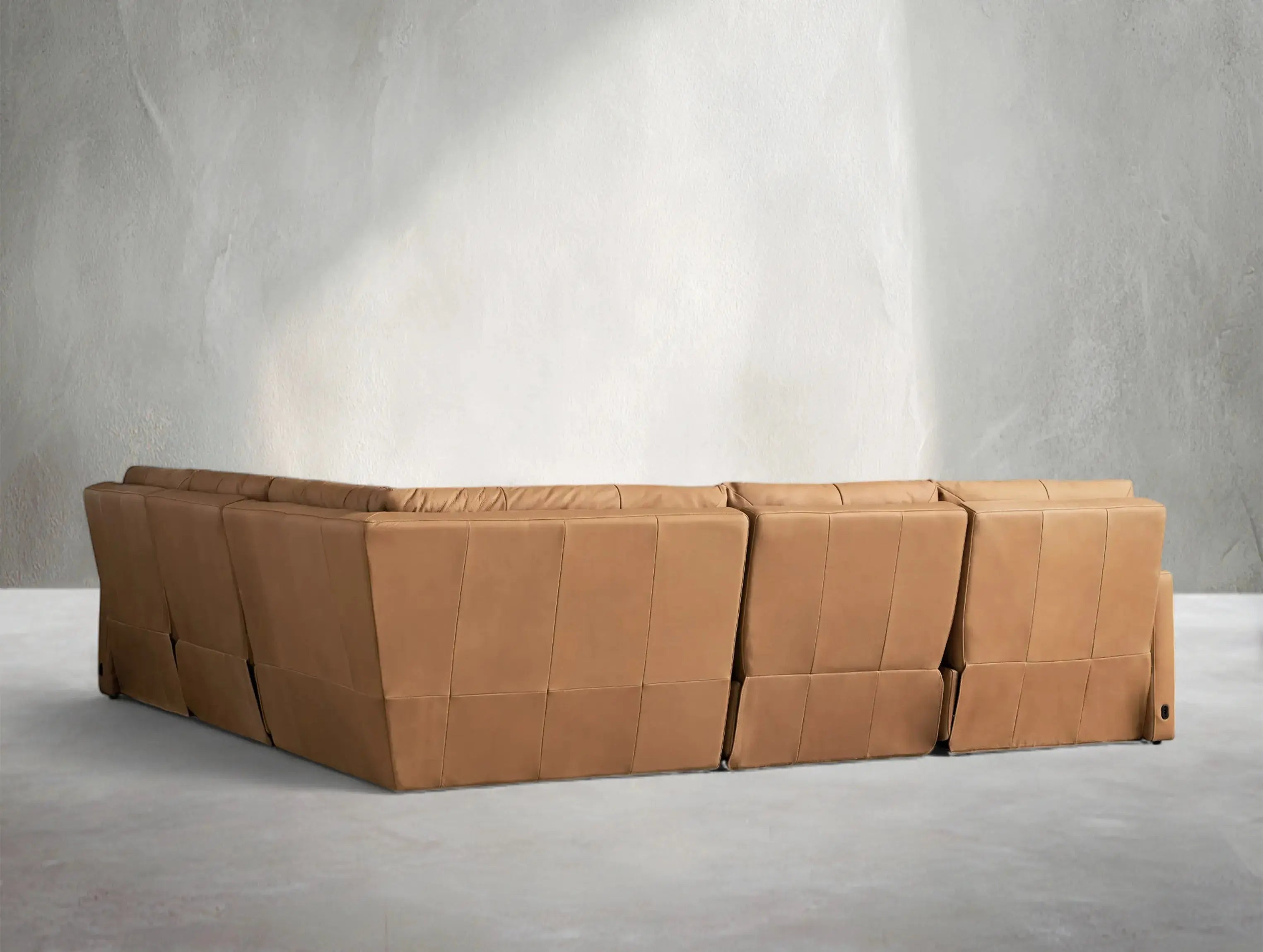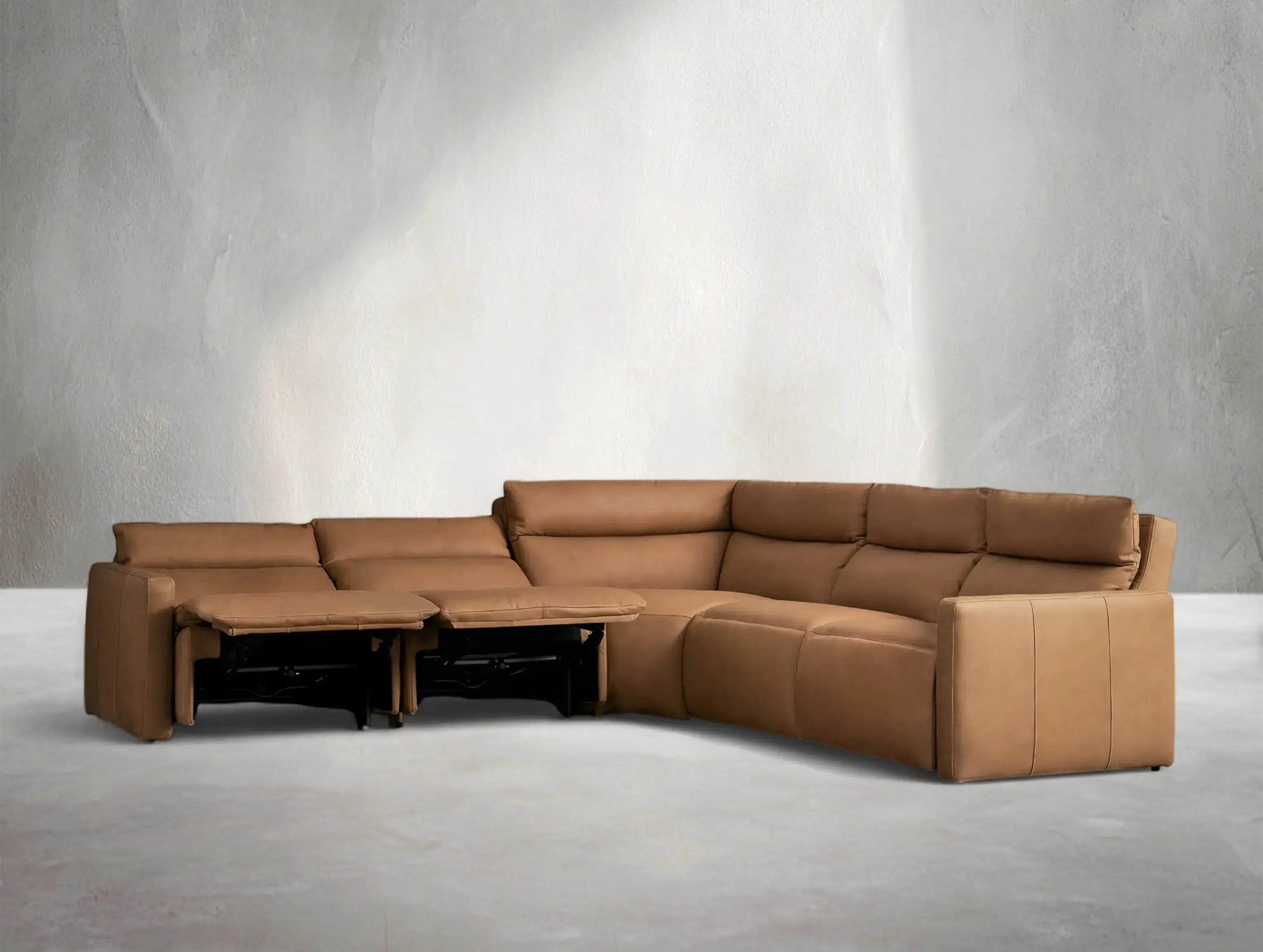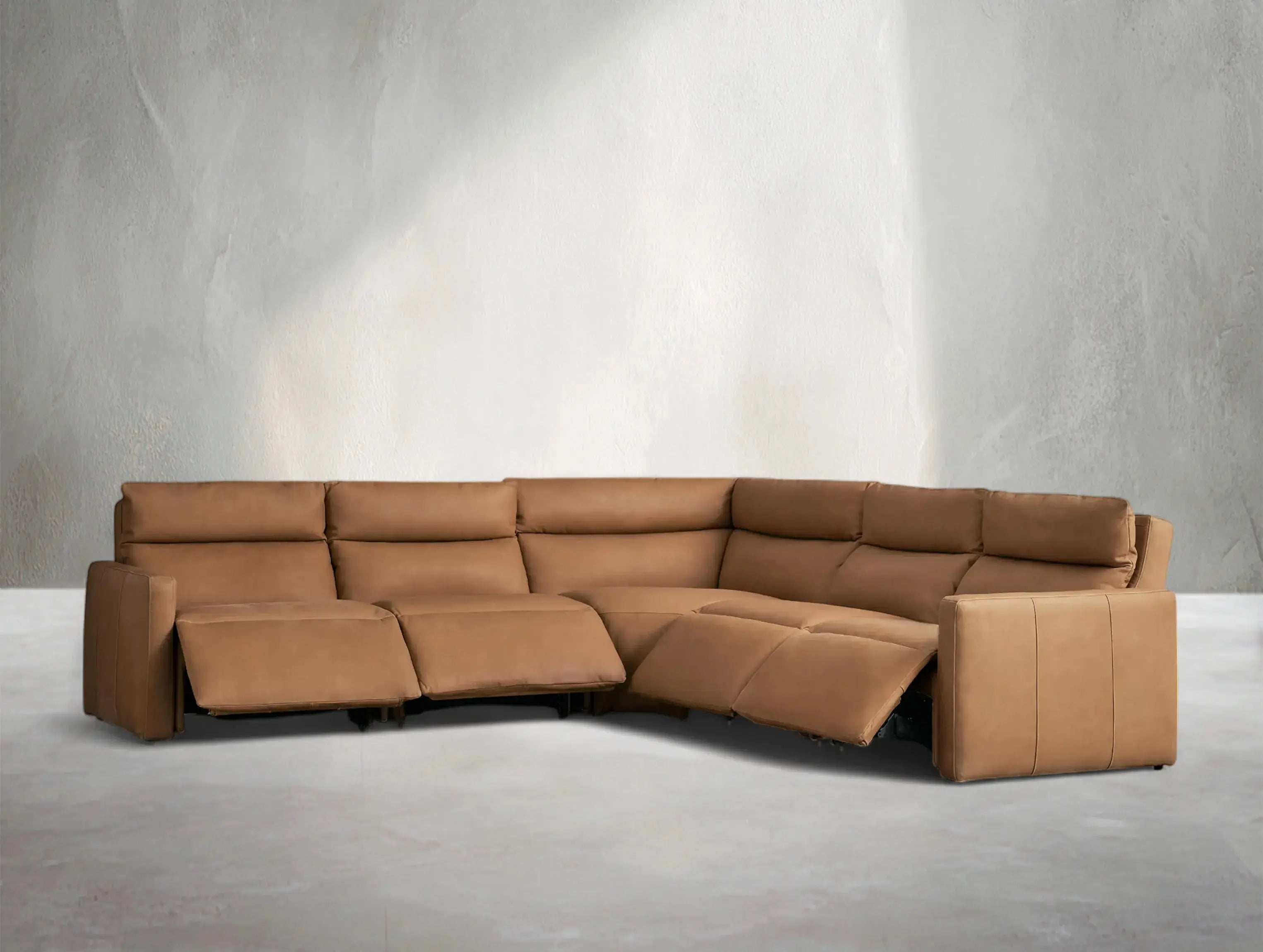 A contemporary take on comfort, this five-piece motion sectional blends crisp tailoring with deep, sink-in seating. Featuring artisan-finished leather and smooth two-button recline, it’s designed to bring effortless ease and modern refinement to your lounging experience.