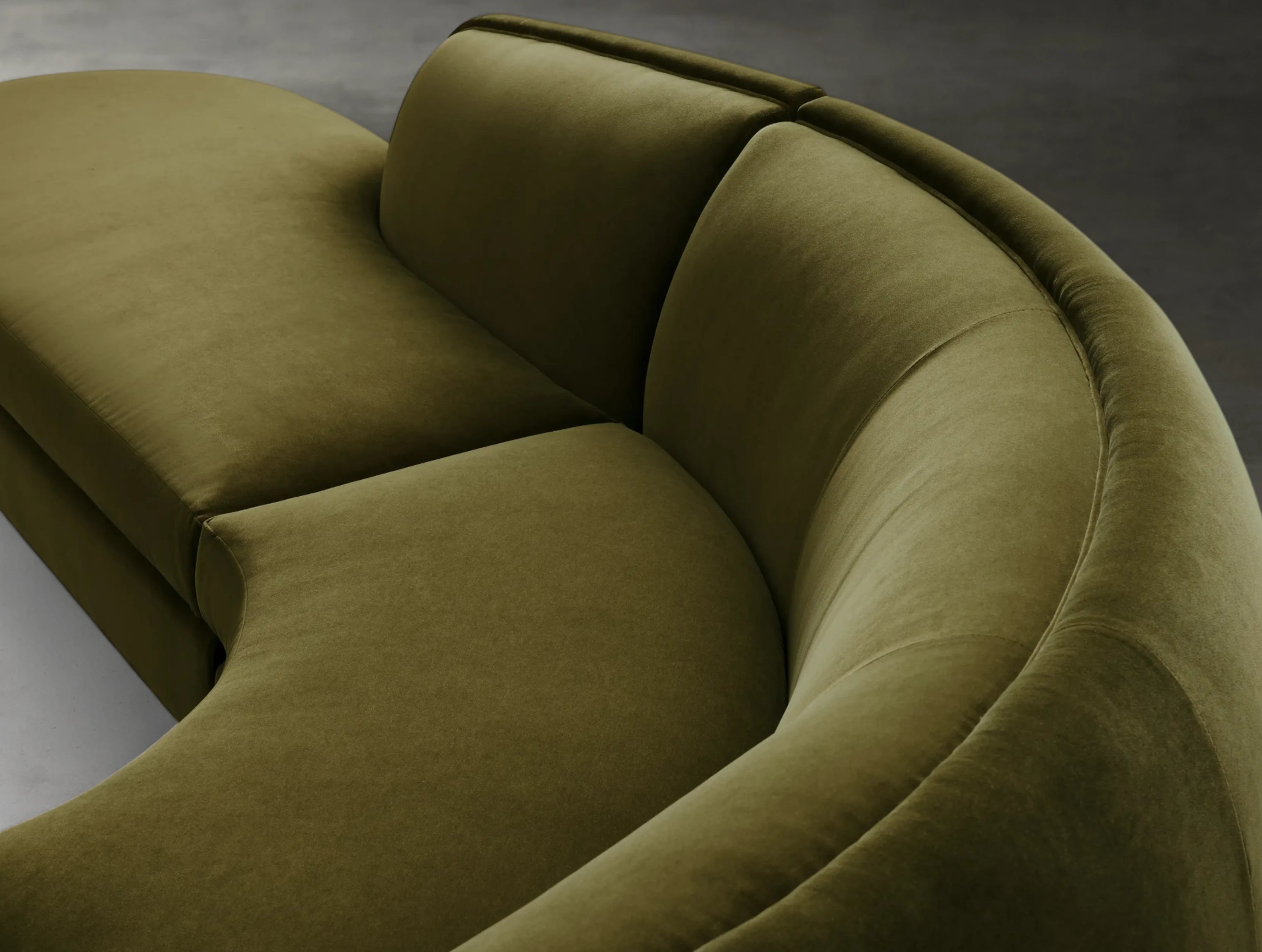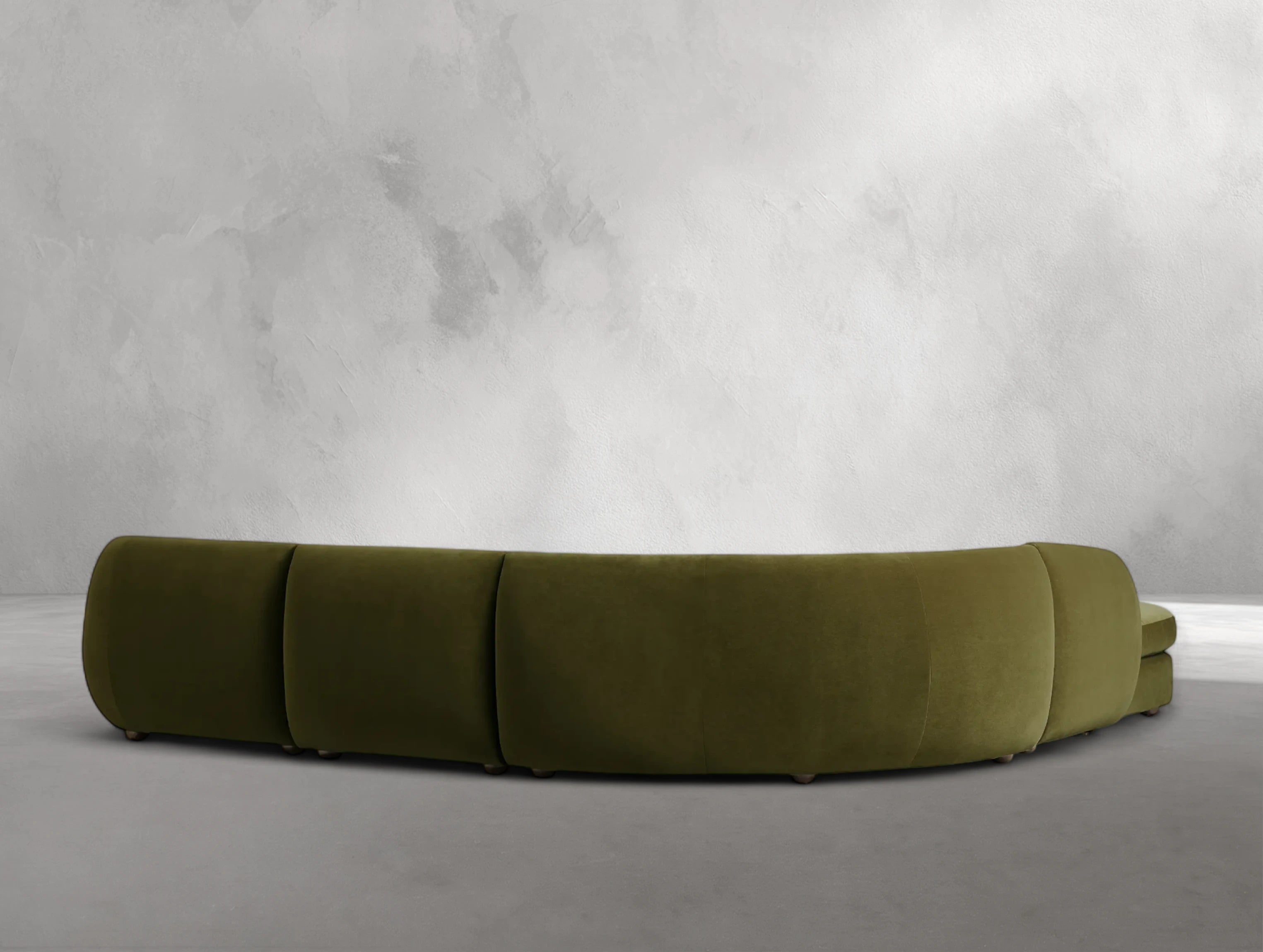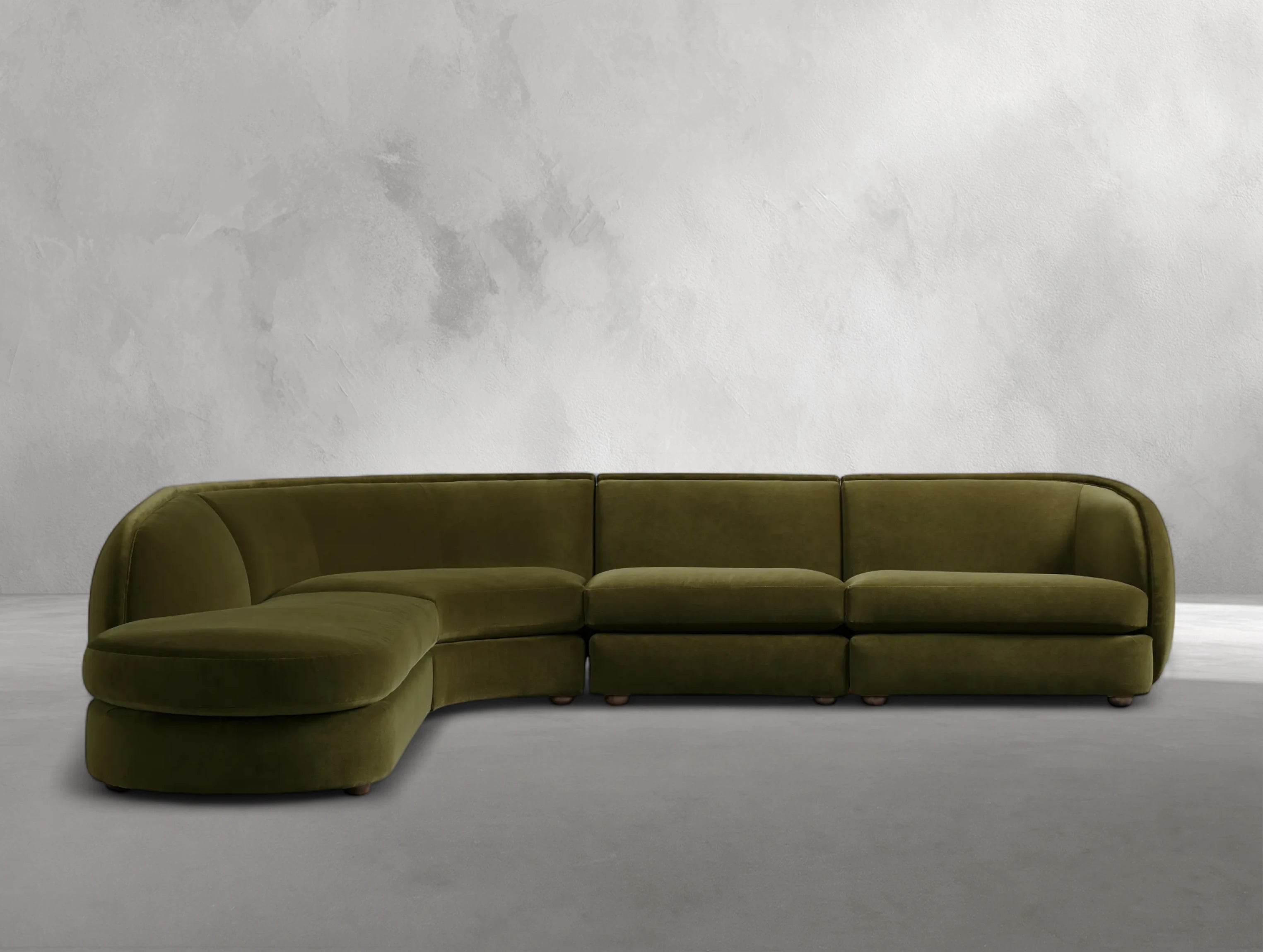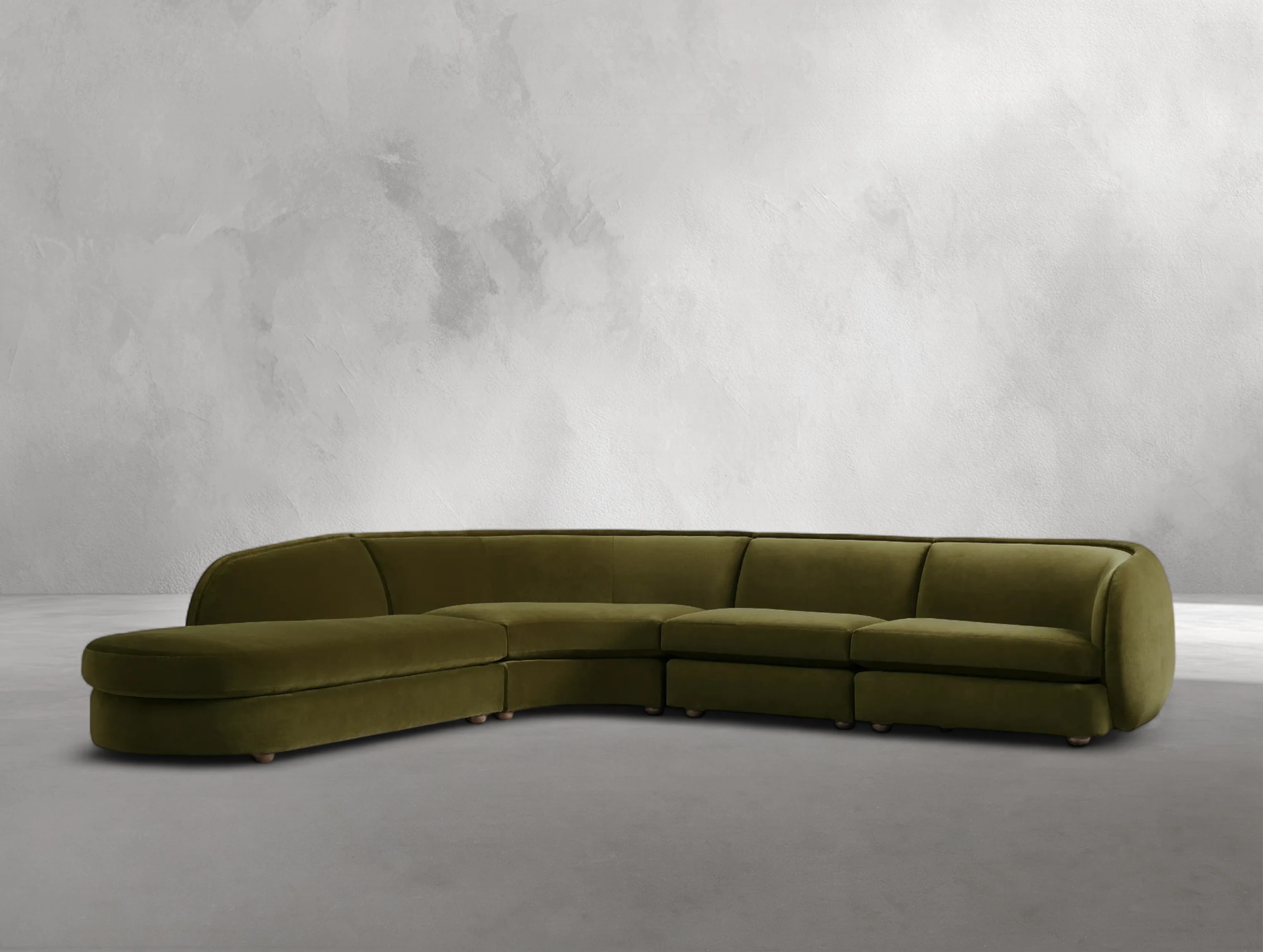 The Milay four-piece bumper sectional embodies Italian midcentury inspiration with dynamic curves and a low-slung silhouette. Its crescent-shaped form and generous proportions create a sculptural statement, while modular components allow for flexible arrangements. Built on a cross-directional hardwood laminate frame certified by the Sustainable Forestry Initiative, it is designed for durability and long-lasting support. Available in customizable fabrics, leathers, and finishes, this sectional lets you create a look that is uniquely yours.