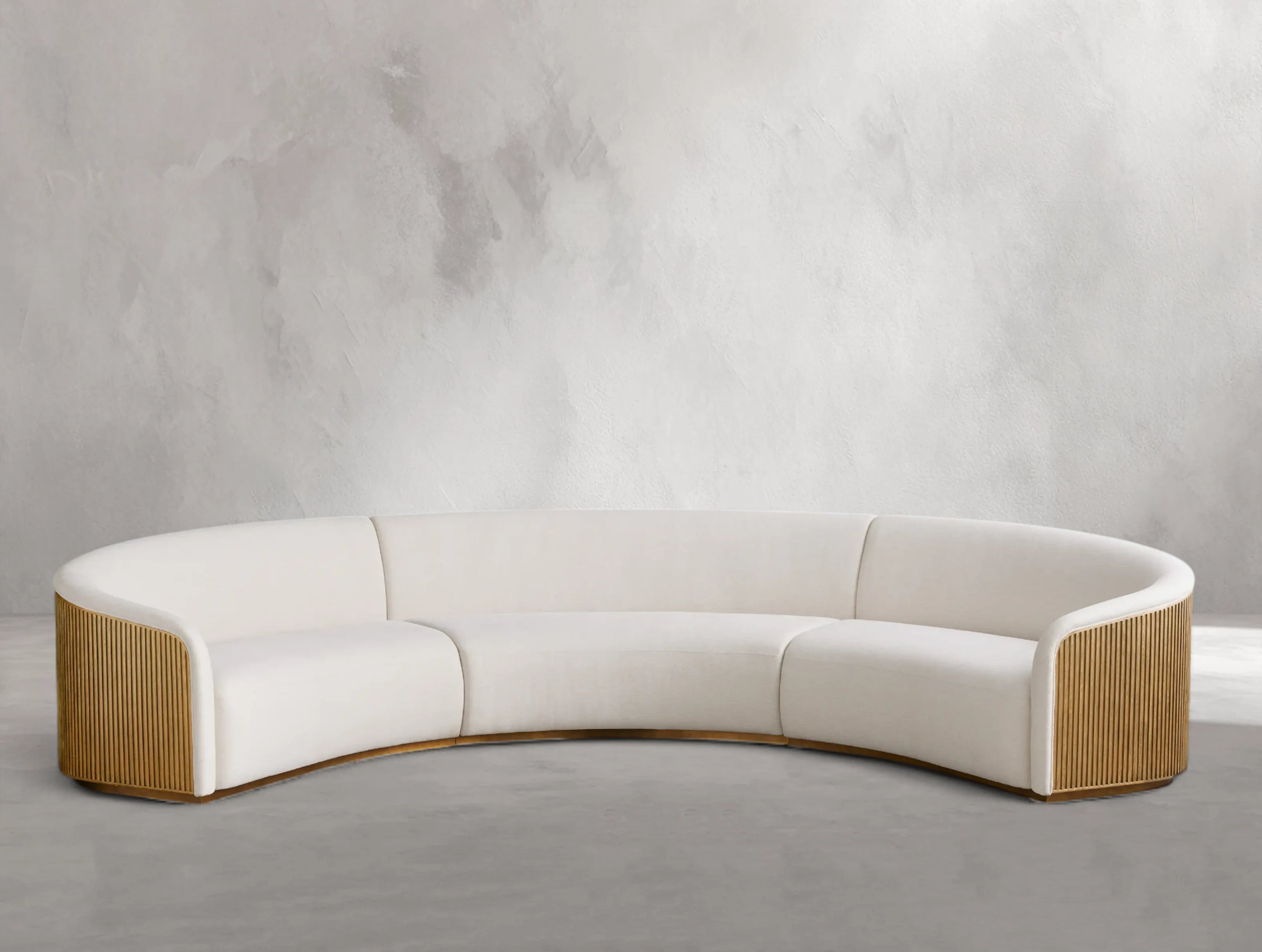 The Rolphin three-piece curved sectional offers refined craftsmanship and inviting comfort in a striking design. Built on a reinforced hardwood frame with mortise-and-tenon joinery, it features no-sag recycled steel springs and elastic webbing for lasting support. Upholstered in Merritt Performance Fabrics—soft, durable, and stain-resistant—it includes dense foam seat cushions and poly fiber-padded backrests for superior comfort. Reeded oak accents and sectional connectors complete this versatile lounge piece, making it the perfect centerpiece for conversation spaces.