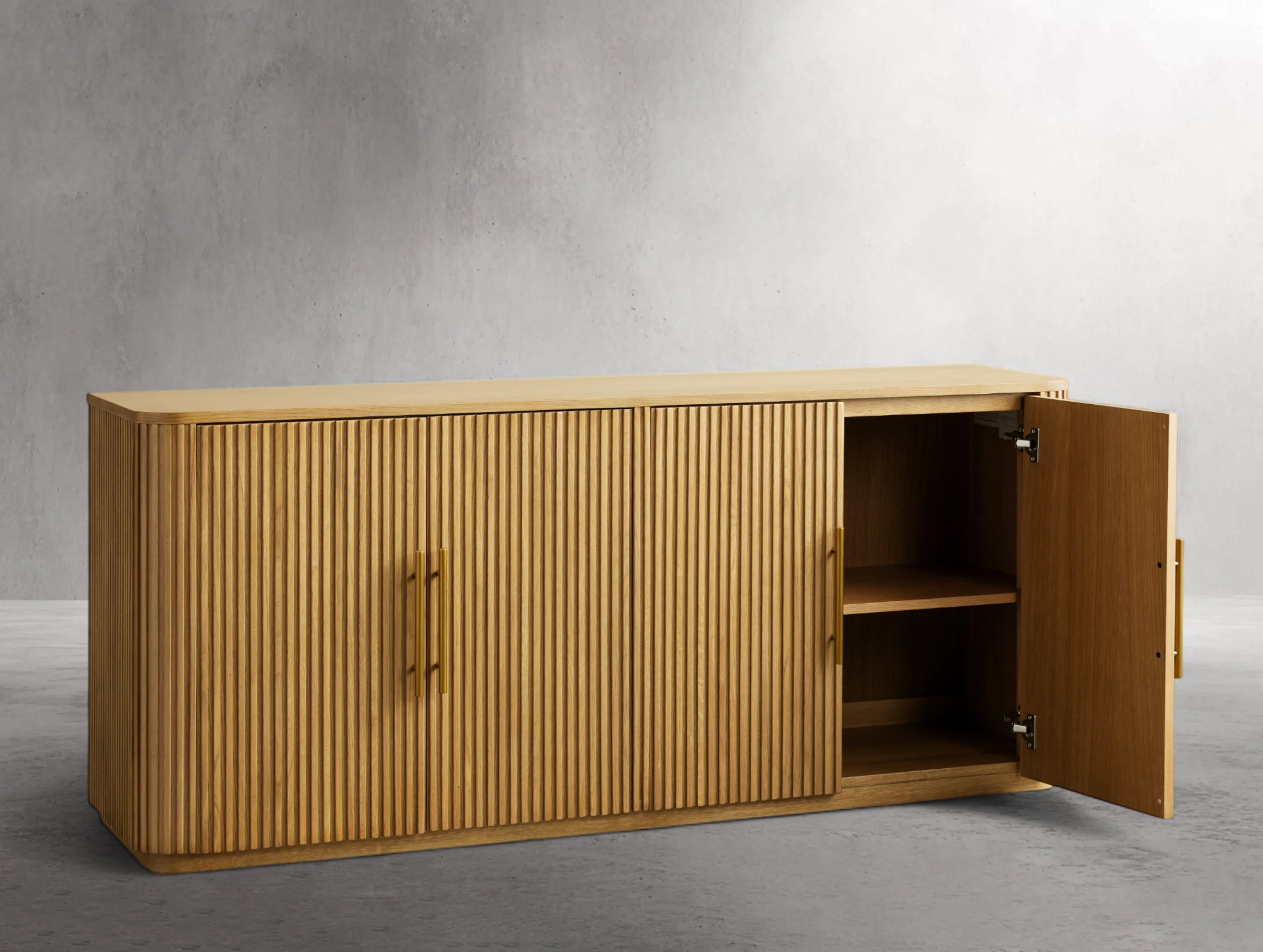 The Rolphin wood sideboard showcases a timeless reeded design that blends natural warmth with refined craftsmanship. Built from hand-finished Finnish pine or premium white oak, it features brass-finished hardware and a plinth base, adding subtle elegance to dining spaces. With adjustable shelving, cord management, and self-closing doors, this versatile piece is as functional as it is stylish—perfect for gatherings that last long into the night.
