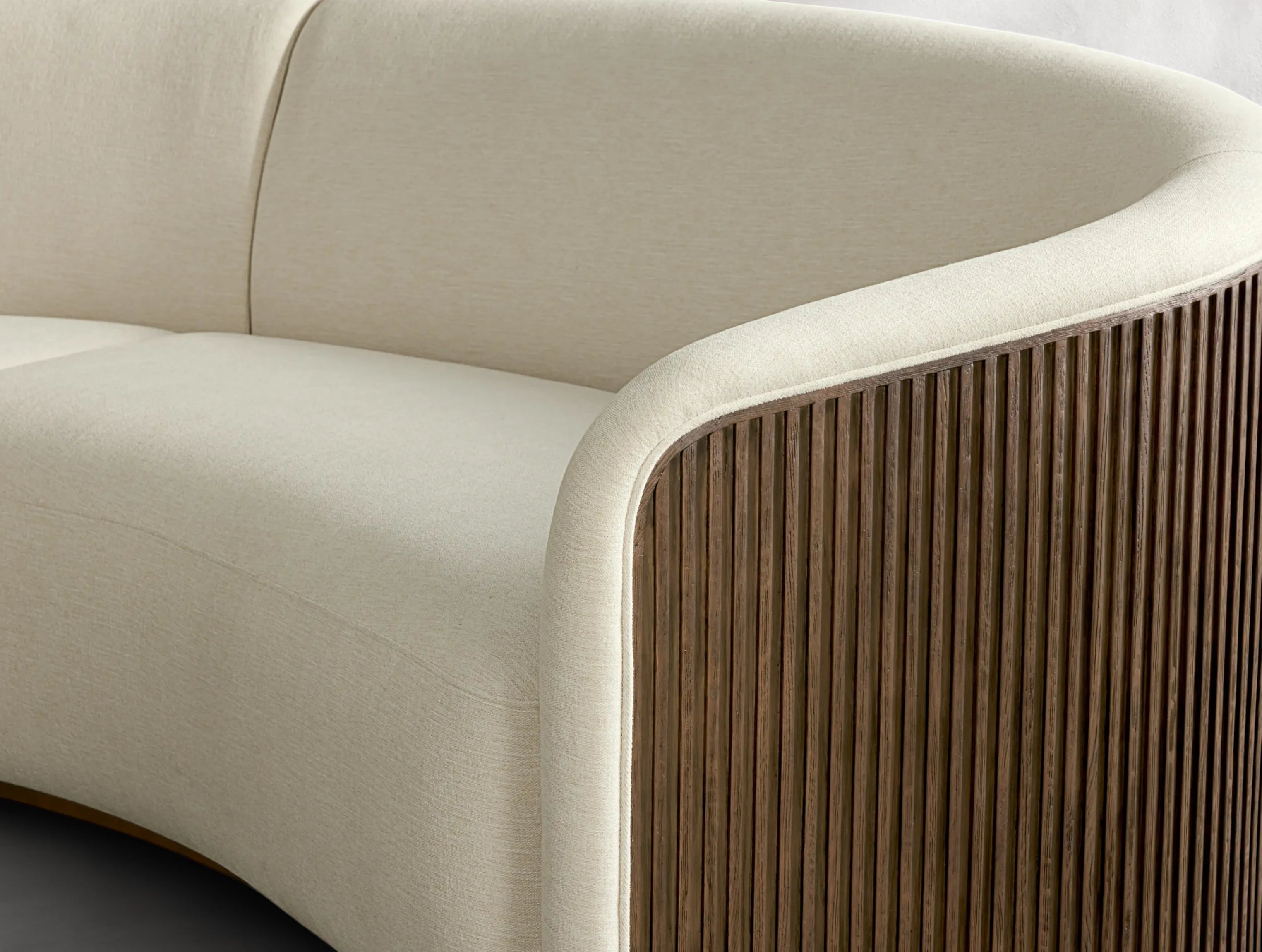 The Rolphin two-piece curved sofa blends refined craftsmanship with inviting comfort. Built on a reinforced hardwood frame with no-sag steel springs and elastic webbing, it’s designed for durability and long-lasting support. Upholstered in plush fabric and accented with reeded oak detailing, it features dense foam seat cushions and poly fiber-padded backrests for superior comfort. With sectional connectors to prevent shifting, this sofa brings timeless style and cozy functionality to your living space.