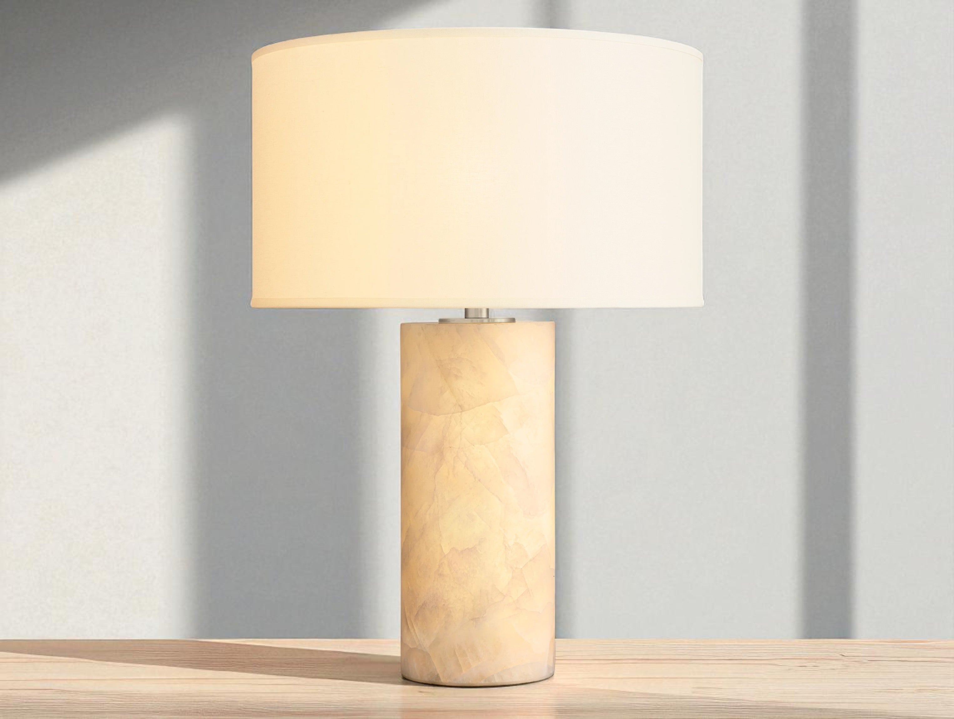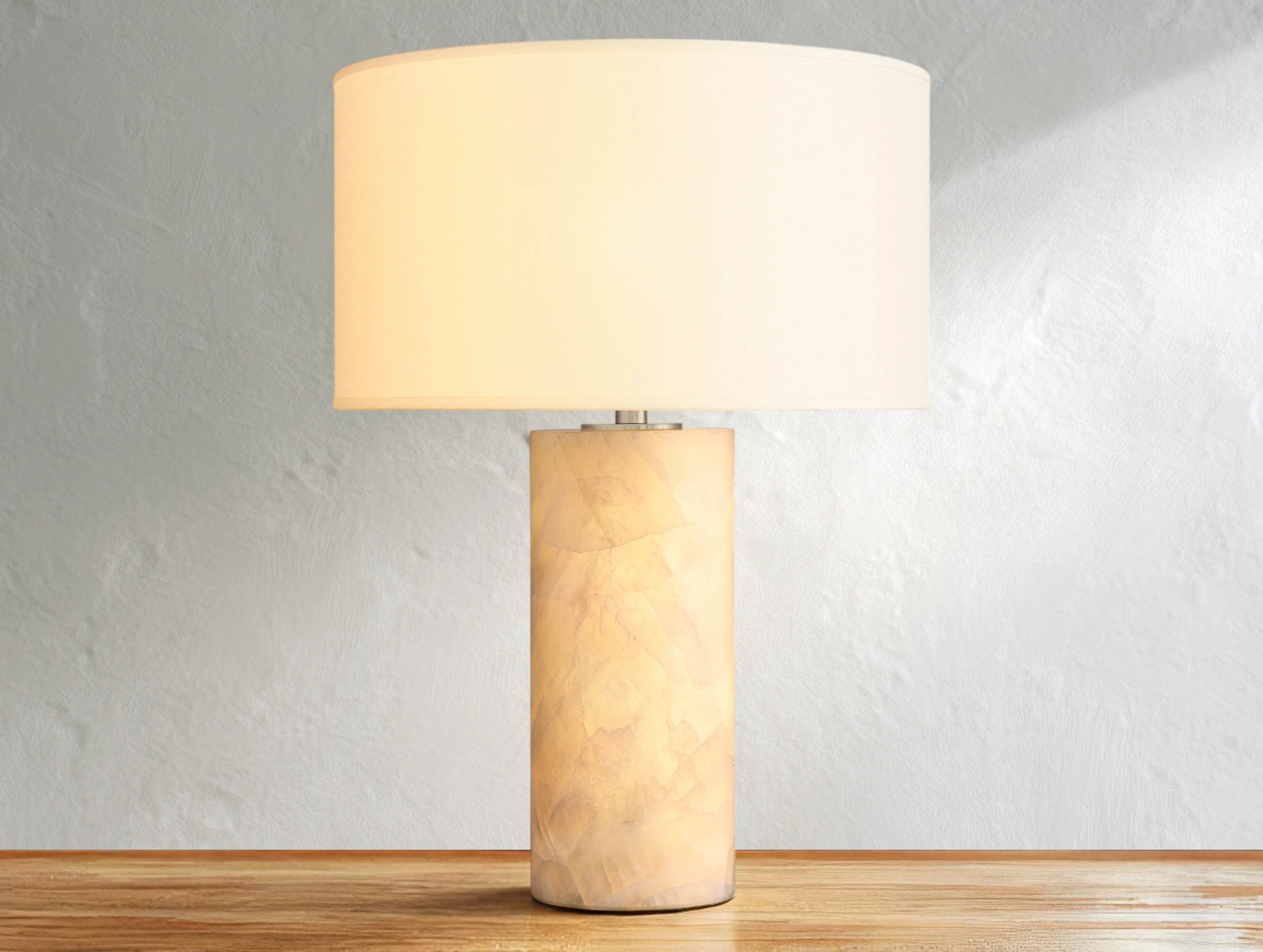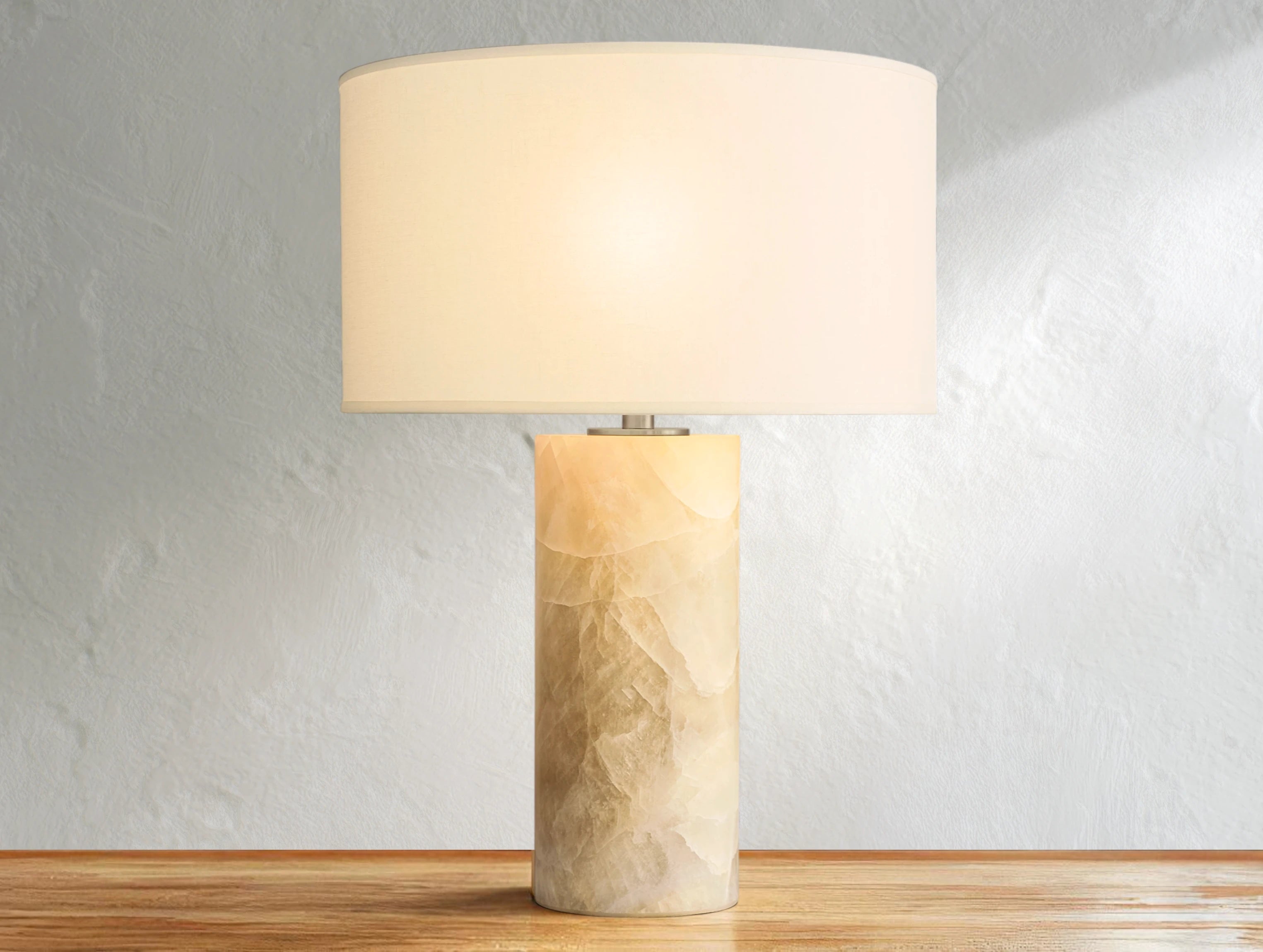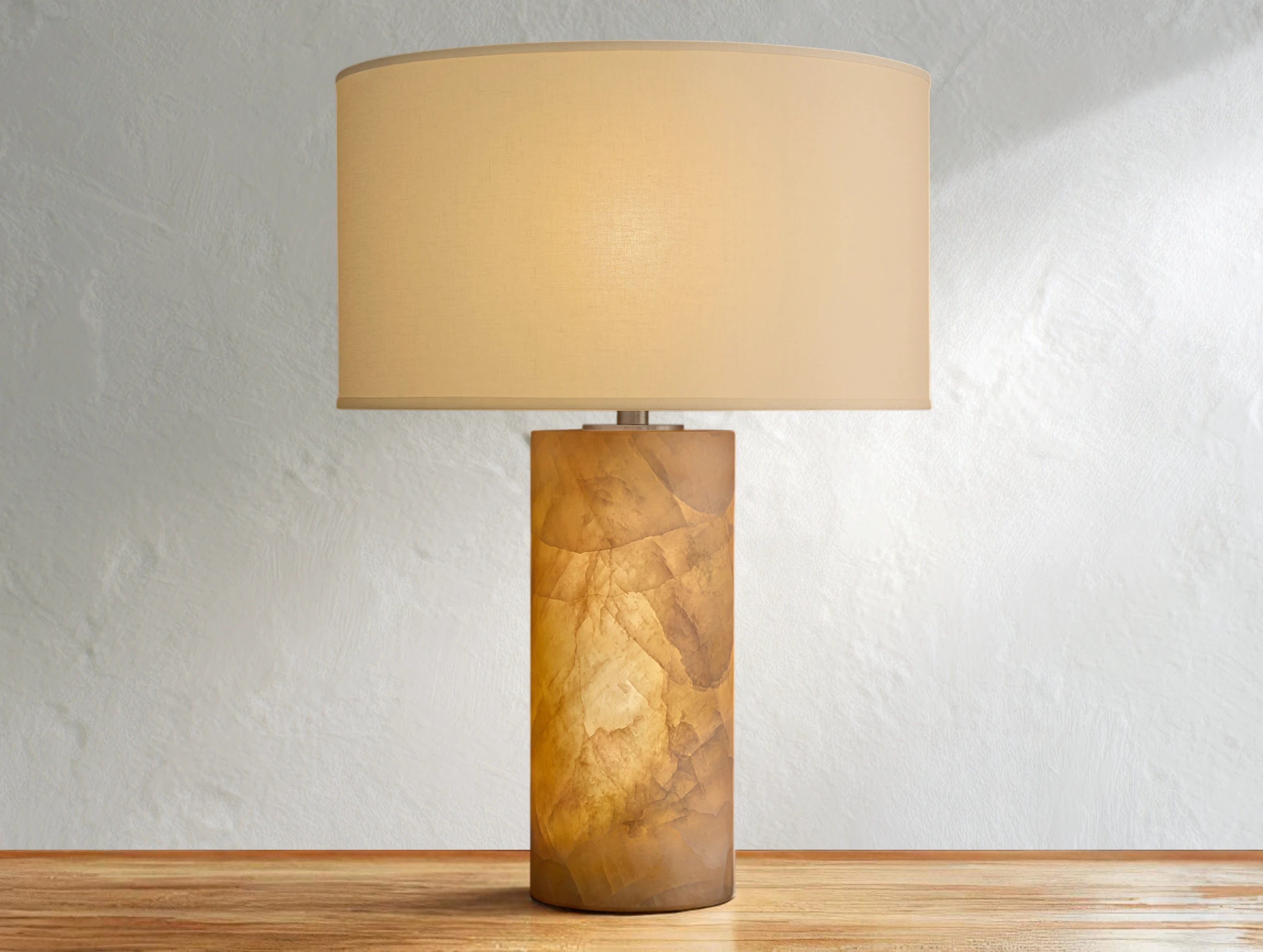 Refined and luminous, the Lisse table lamp highlights the natural beauty of calcite stone. Each base is handcrafted and polished to reveal the stone’s soft glow and unique veining, paired with a steel collar and finial for a sleek finish. Designed with three lighting modes—top only, base only, or both—it brings versatility and elegance to any room. Every lamp is one of a kind, making it both functional and a statement piece.