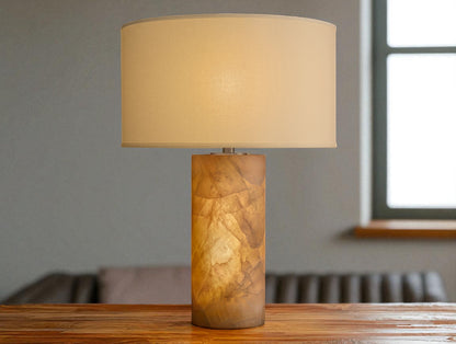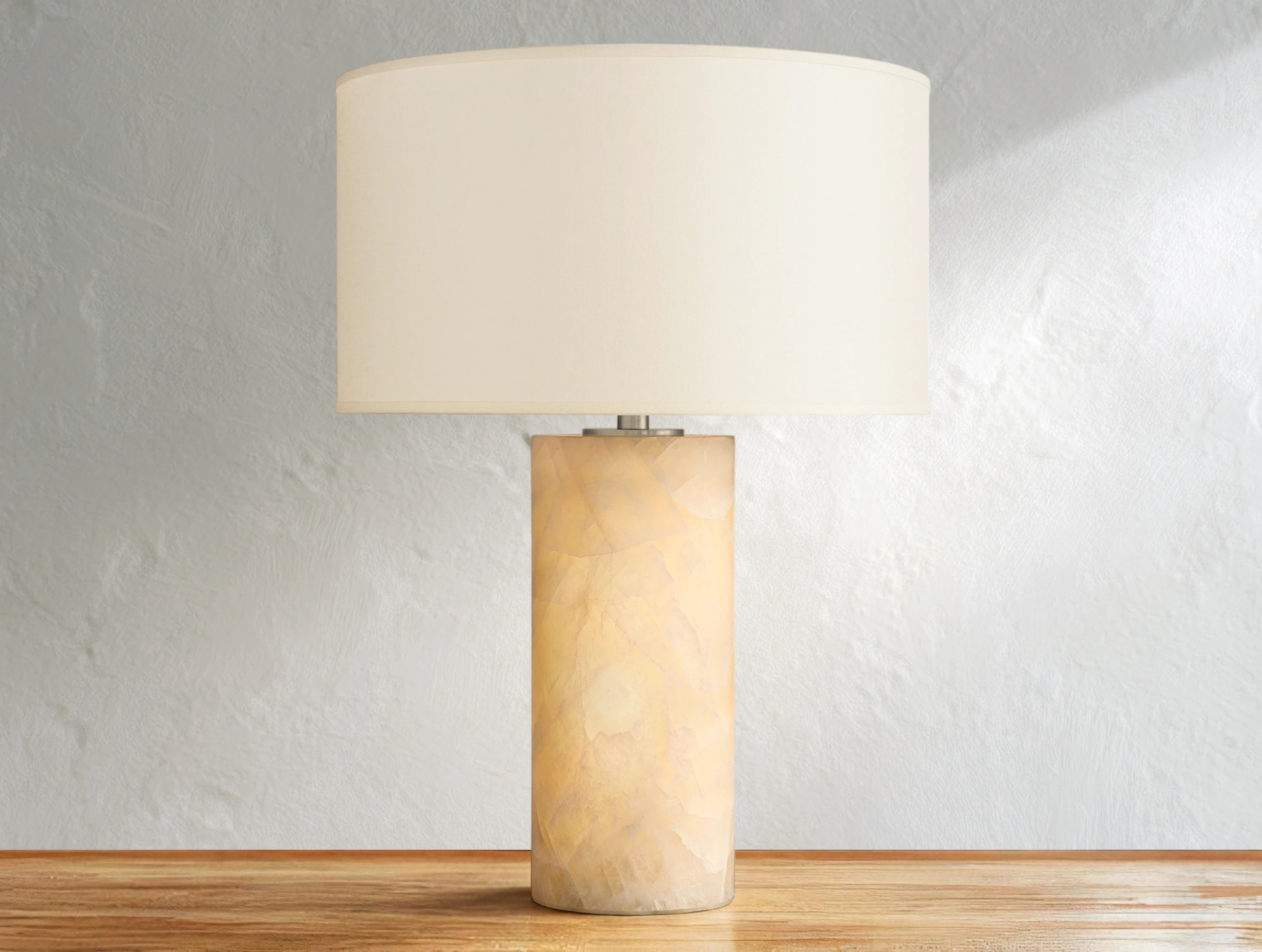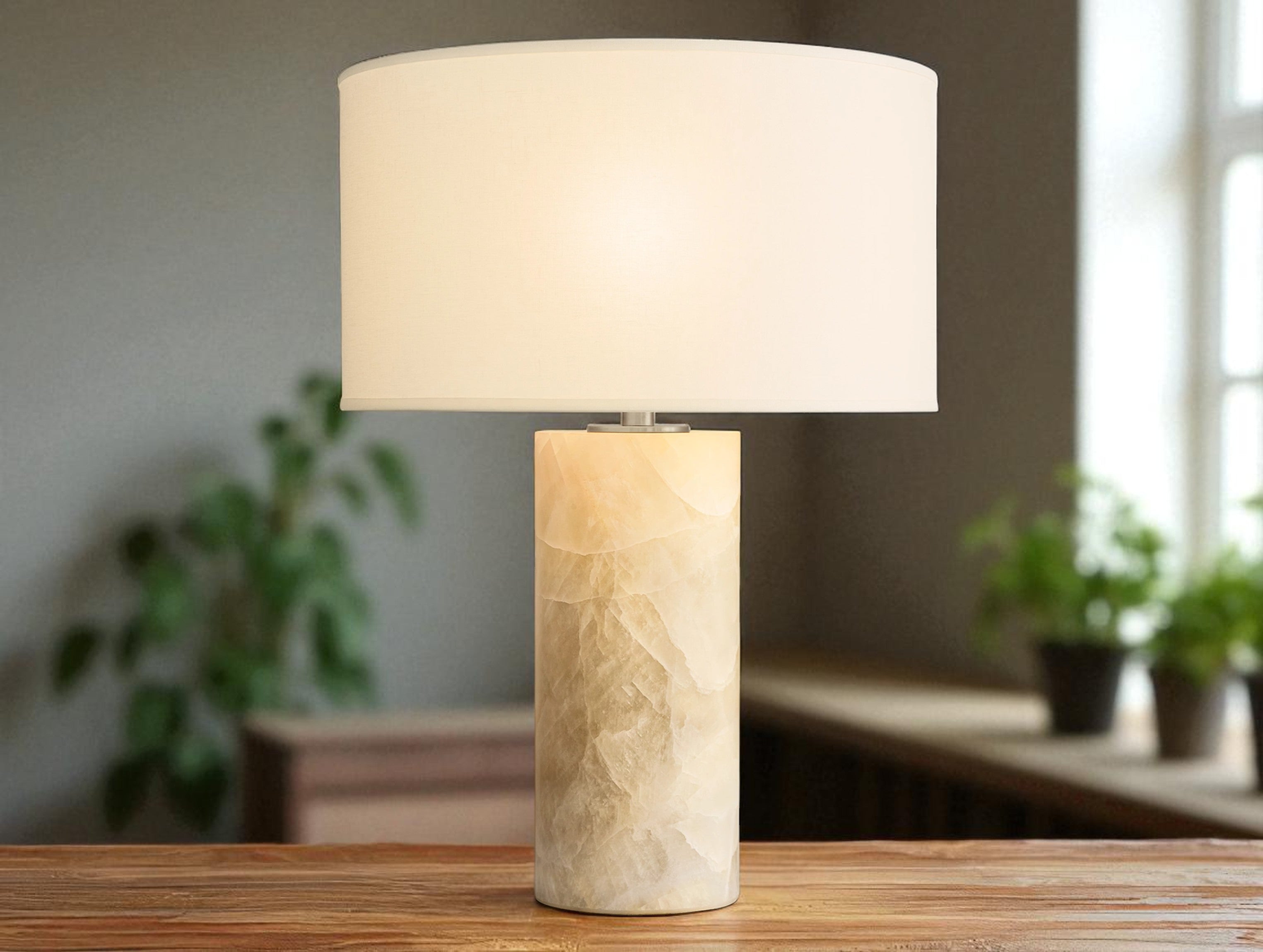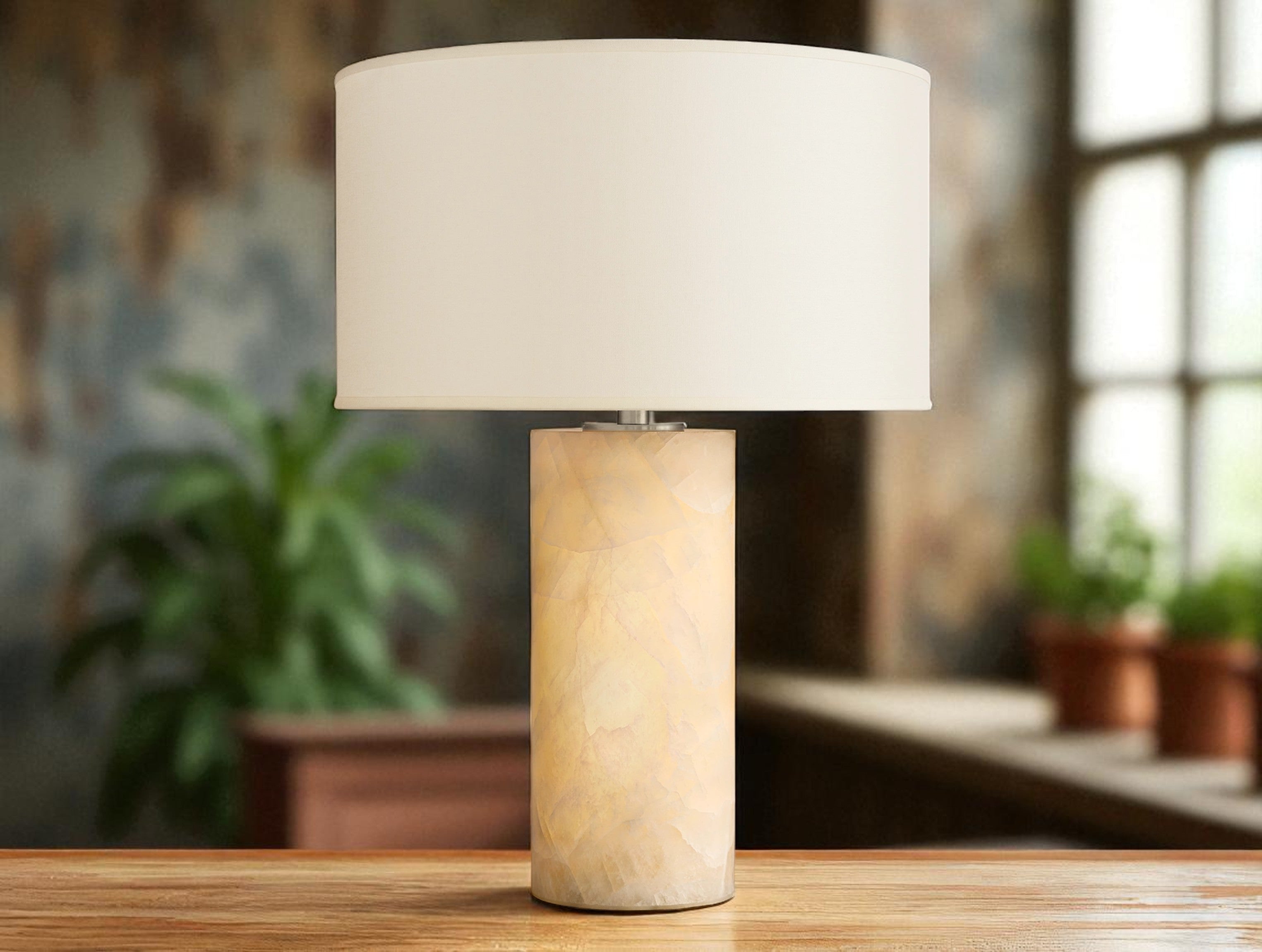 Refined and luminous, the Lisse table lamp highlights the natural beauty of calcite stone. Each base is handcrafted and polished to reveal the stone’s soft glow and unique veining, paired with a steel collar and finial for a sleek finish. Designed with three lighting modes—top only, base only, or both—it brings versatility and elegance to any room. Every lamp is one of a kind, making it both functional and a statement piece.