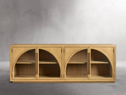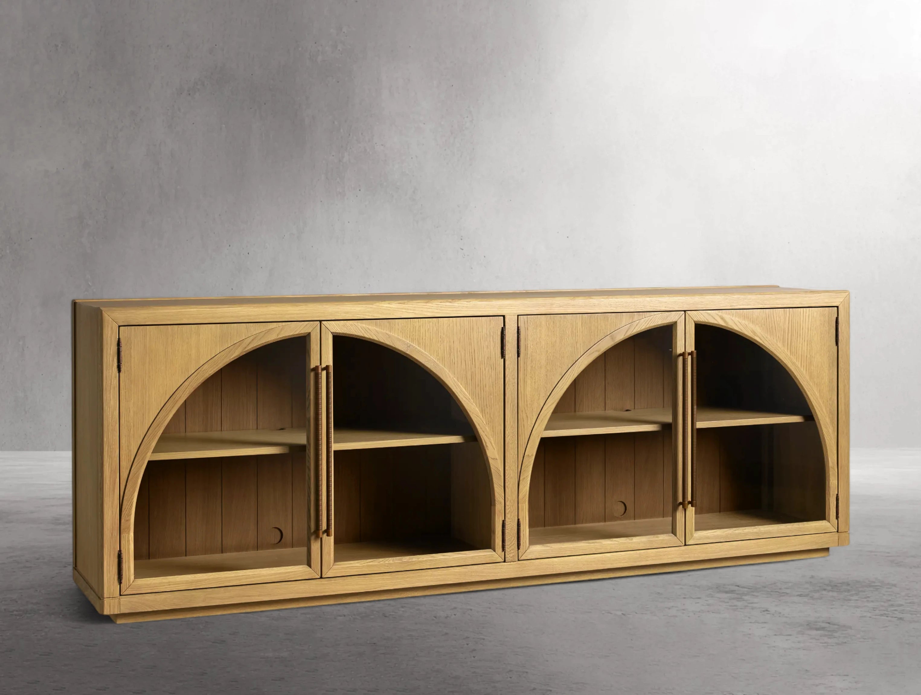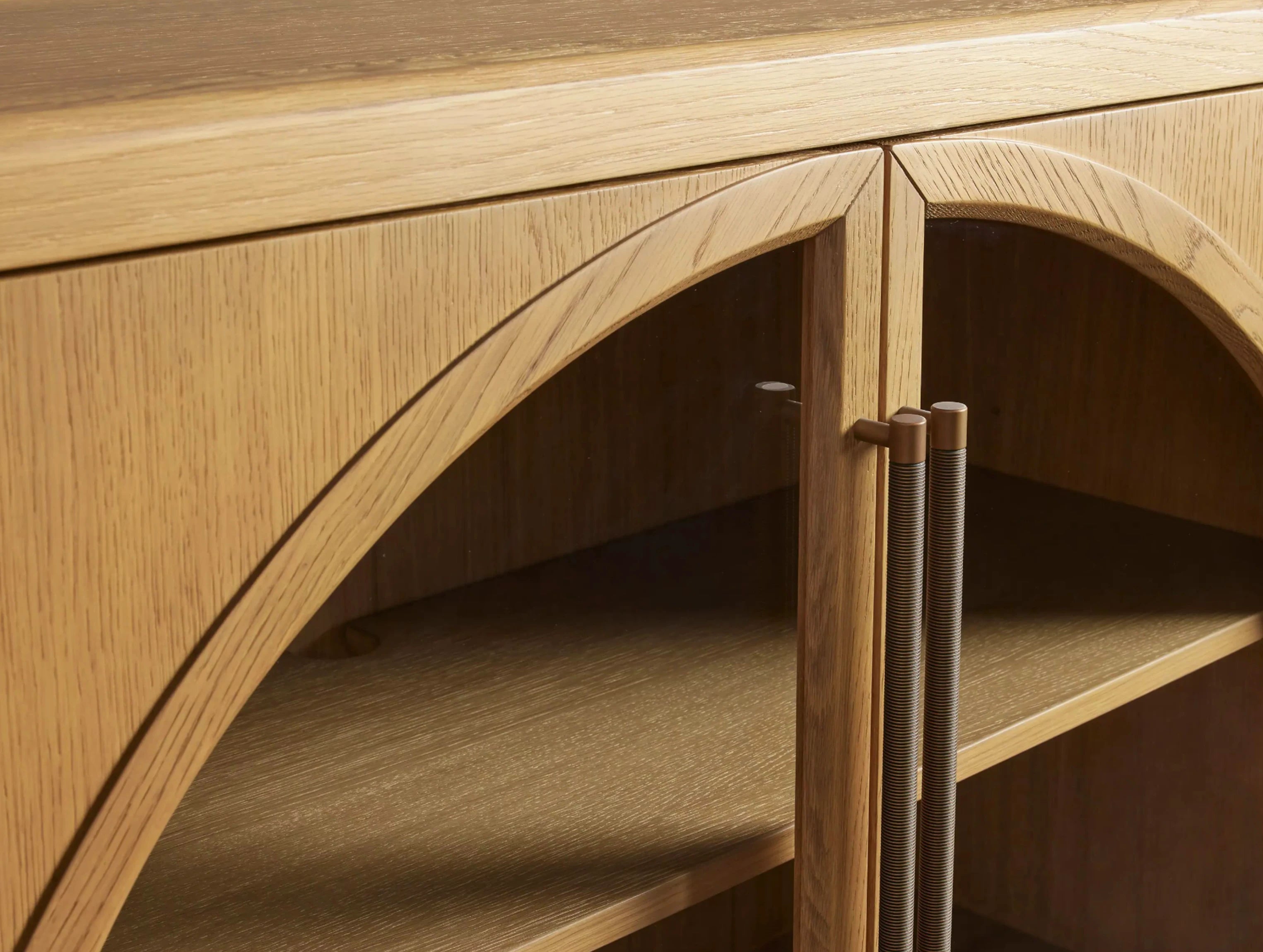 The Hottiy Sideboard blends soft curves with the rich grain of natural oak, offering generous storage with timeless appeal. Crafted in Indonesia from solid oak and oak veneers, each piece is hand-finished to showcase the beauty of the wood. Inside, shiplap back panels and contrasting finishes add depth, while a sleek plinth base gives it a grounded, modern look. Solid aluminum alloy knurled handles, brass accents, and discreet cord management ensure the sideboard is as functional as it is refined.