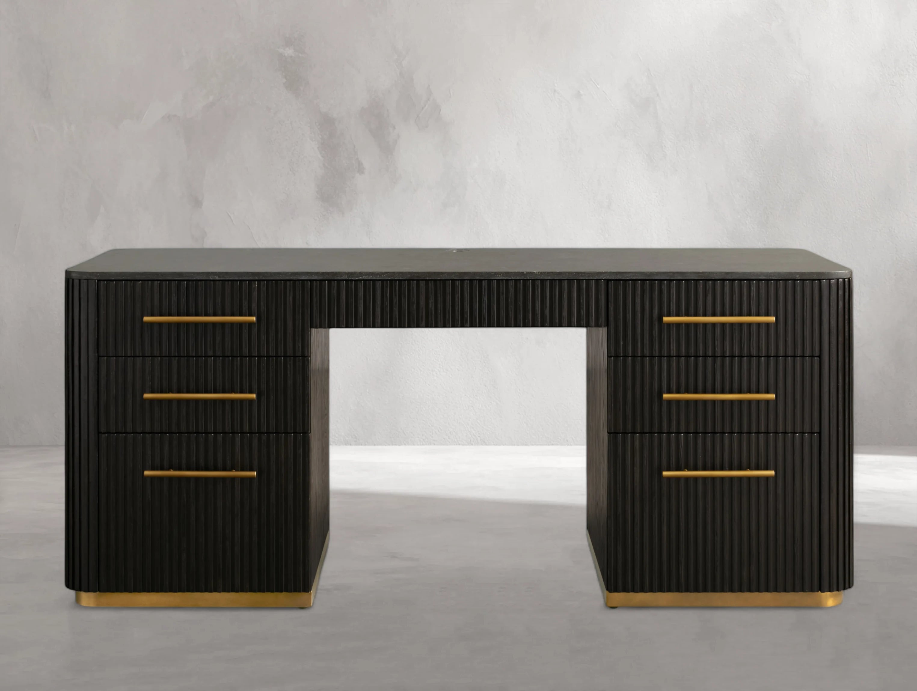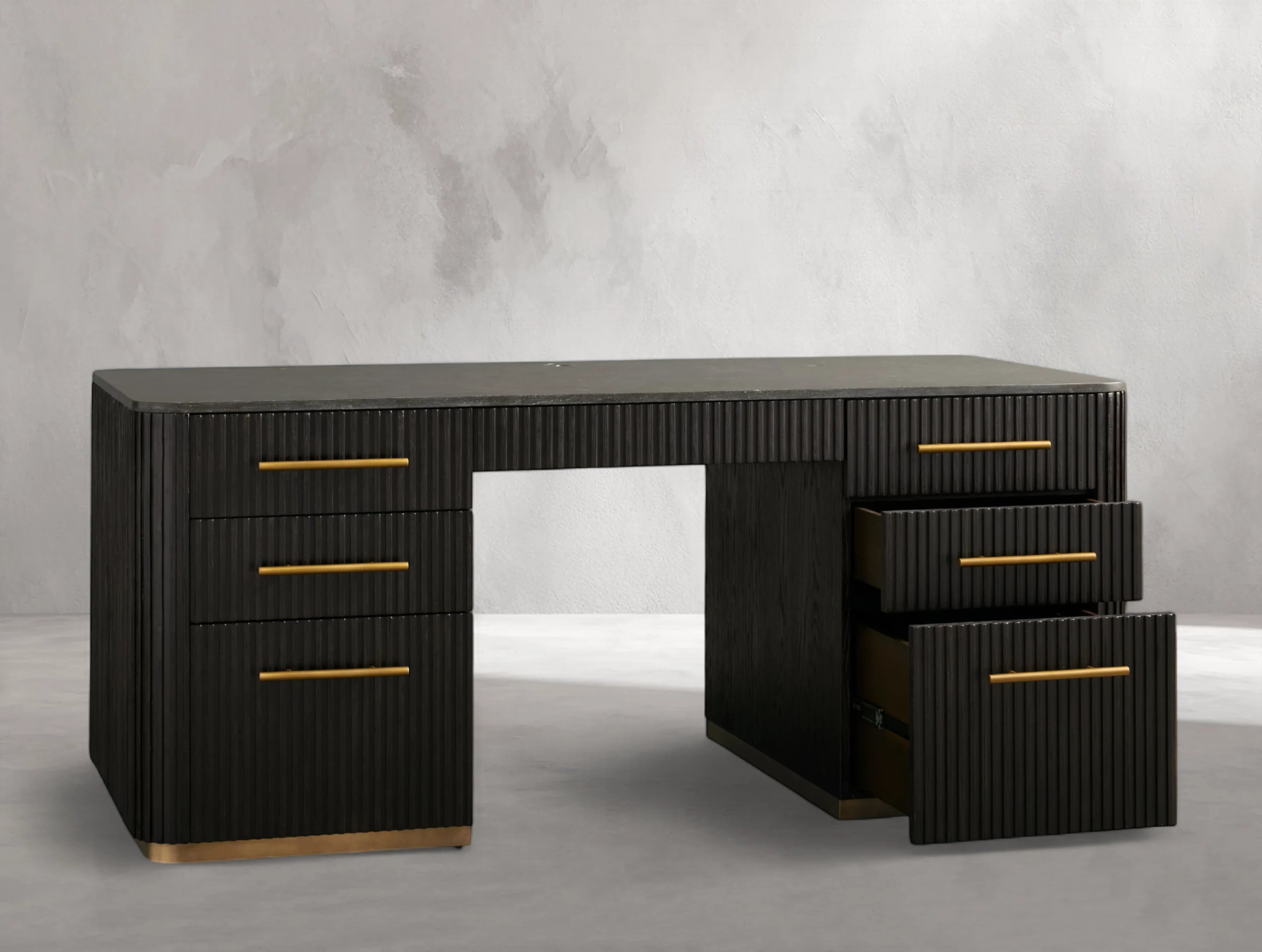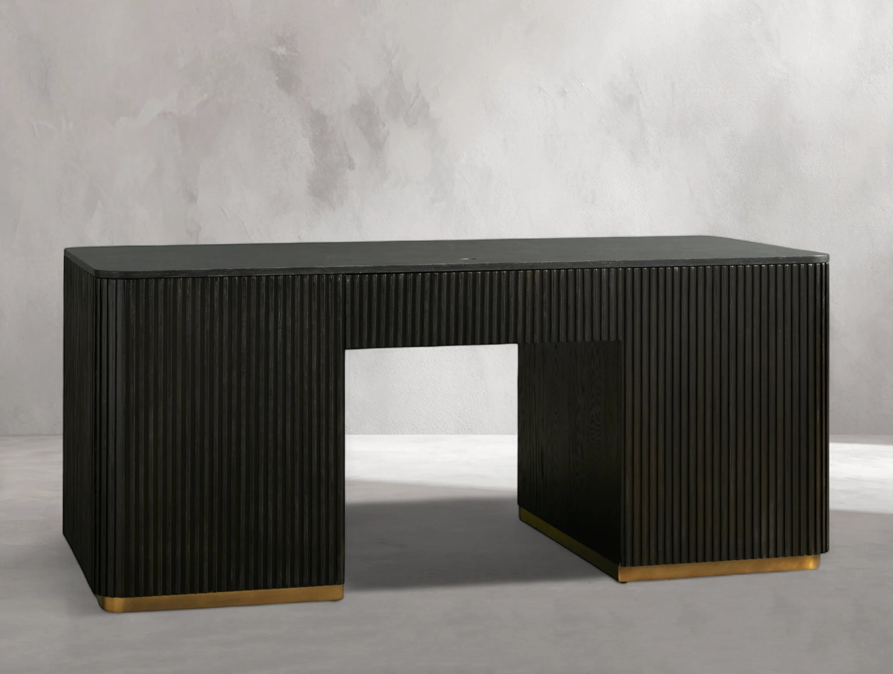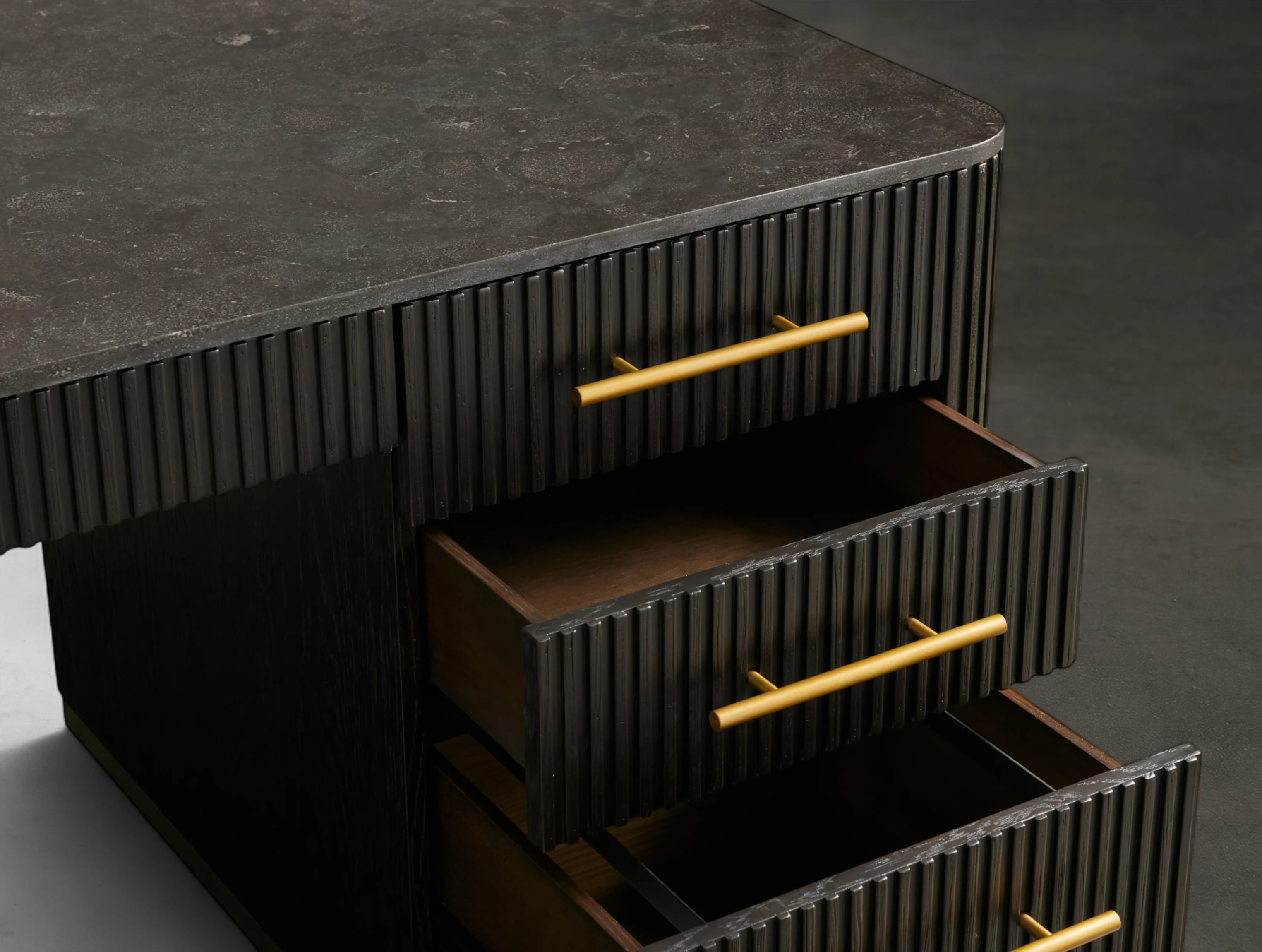 The Rolphin executive desk brings timeless elegance and refined function into your office with a striking mixed-material design. Crafted from hand-finished Finnish pine or European white oak, it is accented with reeded oak detailing, brass hardware, and topped with natural stone. Built with file storage drawers and cord management, this desk is designed for productivity while adding sophistication to your workspace.
