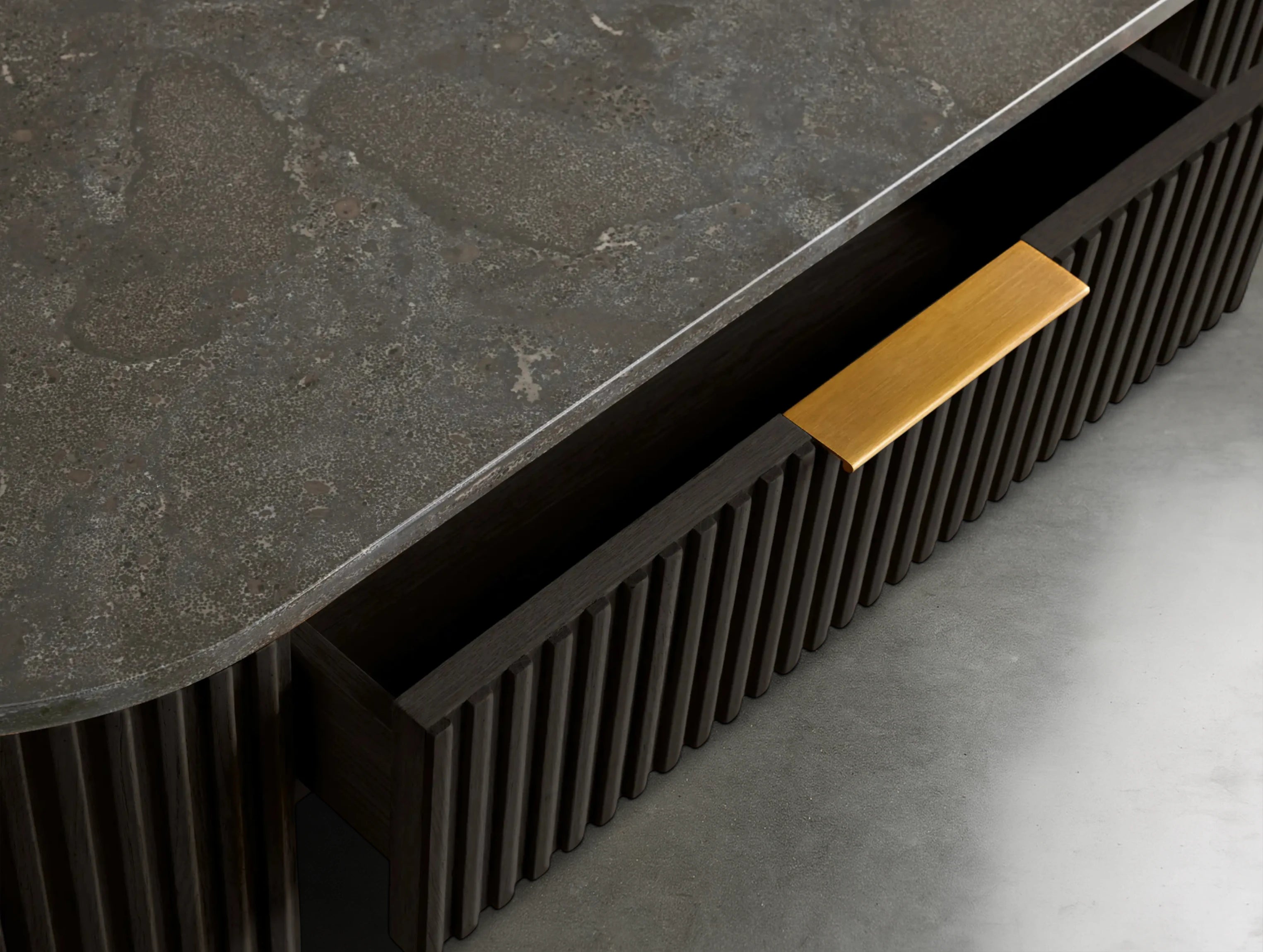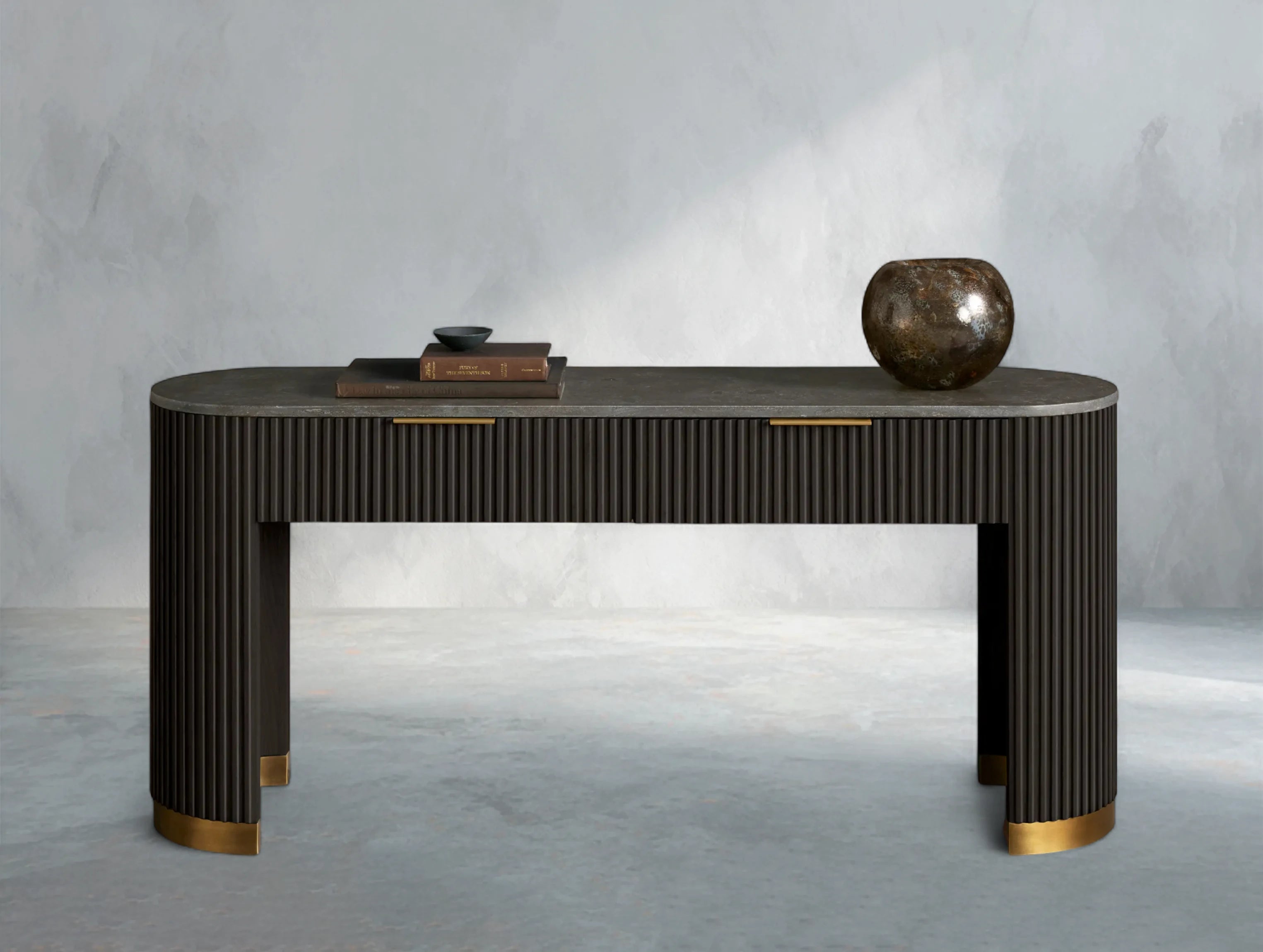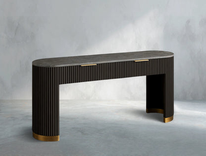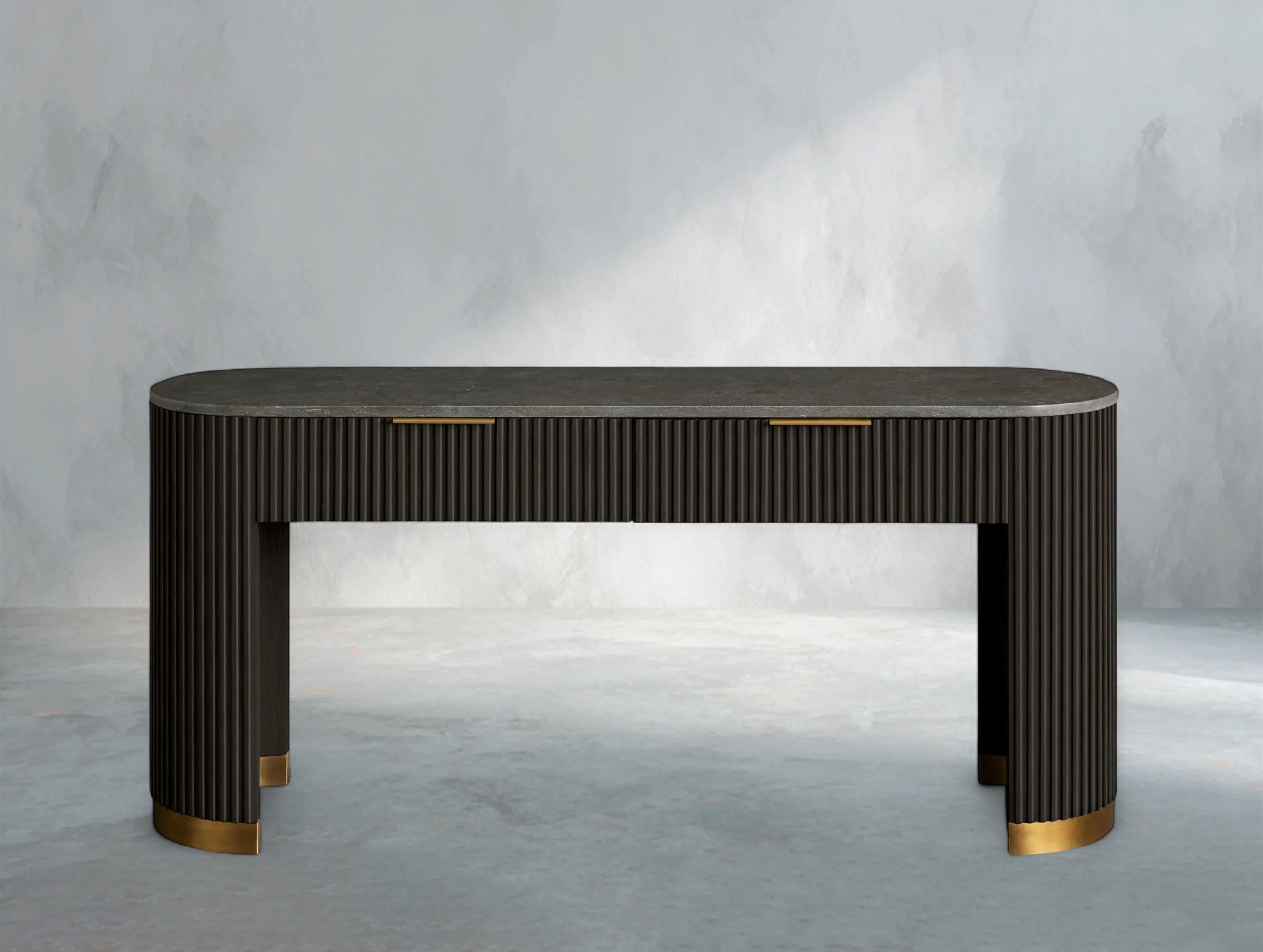 Part of the Rolphin Collection, the Rolphin Storage Console Table combines natural materials with refined craftsmanship. A luxurious stone top rests on reeded oak detailing and a brass-finished plinth base, blending strength with sculptural elegance. Perfect for hallways, living rooms, or dining spaces, it offers both function and timeless appeal.
