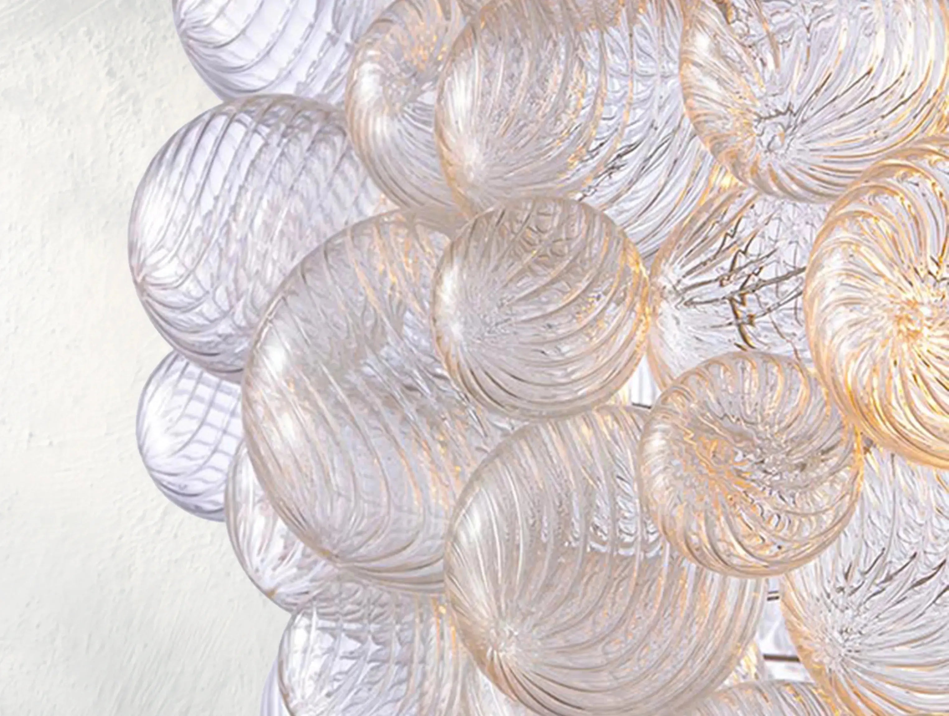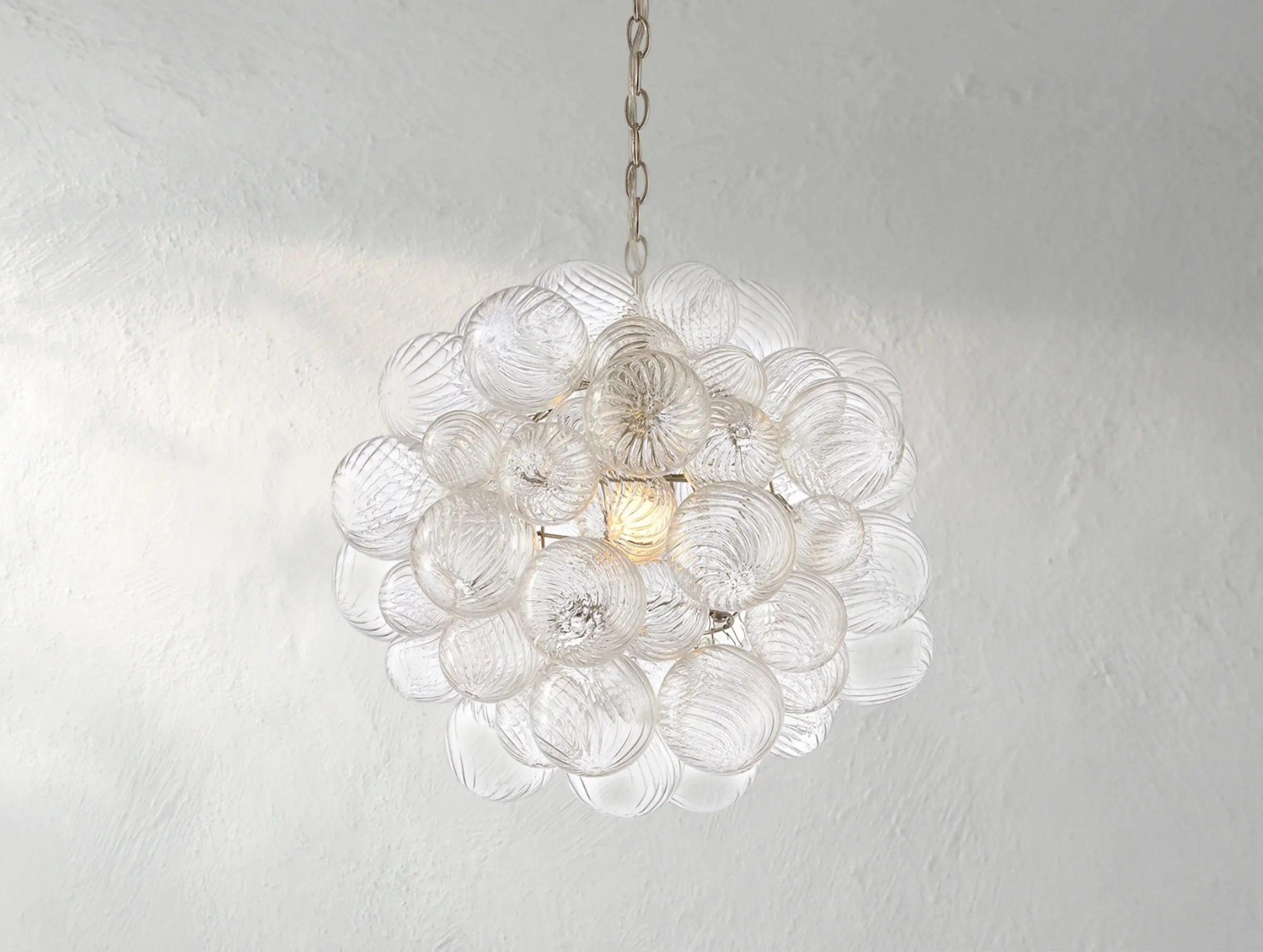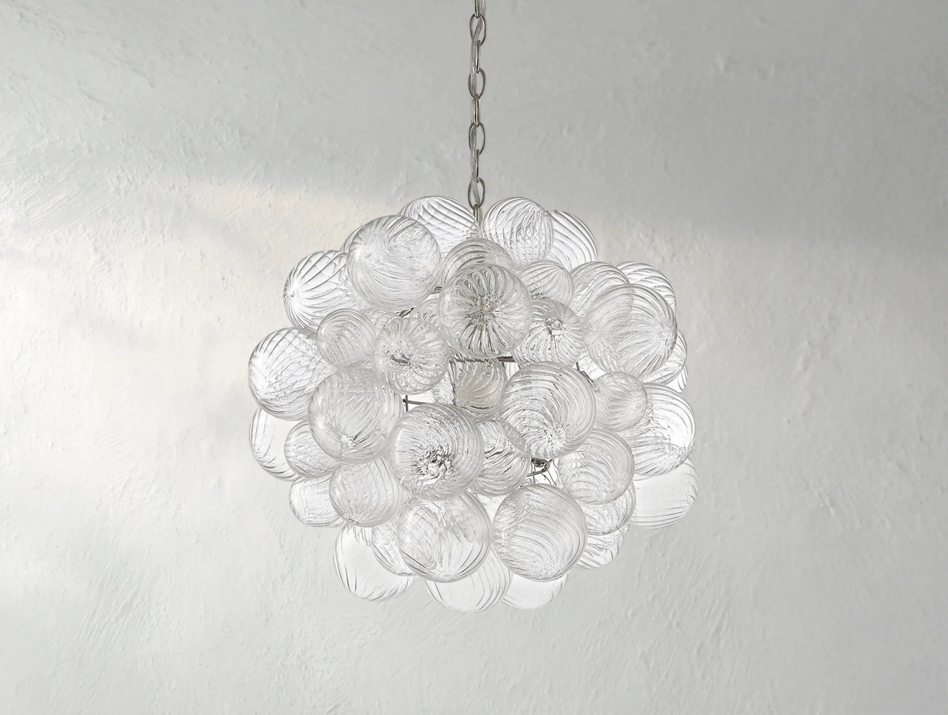 A modern reimagining of classic glass globe lighting. The Tolia Sphere Chandelier features hand-blown swirled-glass orbs, each suspended in delicate balance around a sleek metal frame. Like floating bubbles, the orbs shimmer with texture and light, casting gentle ripples across the room. Designed by Ardenel, this piece blends timeless elegance with sculptural modernity.