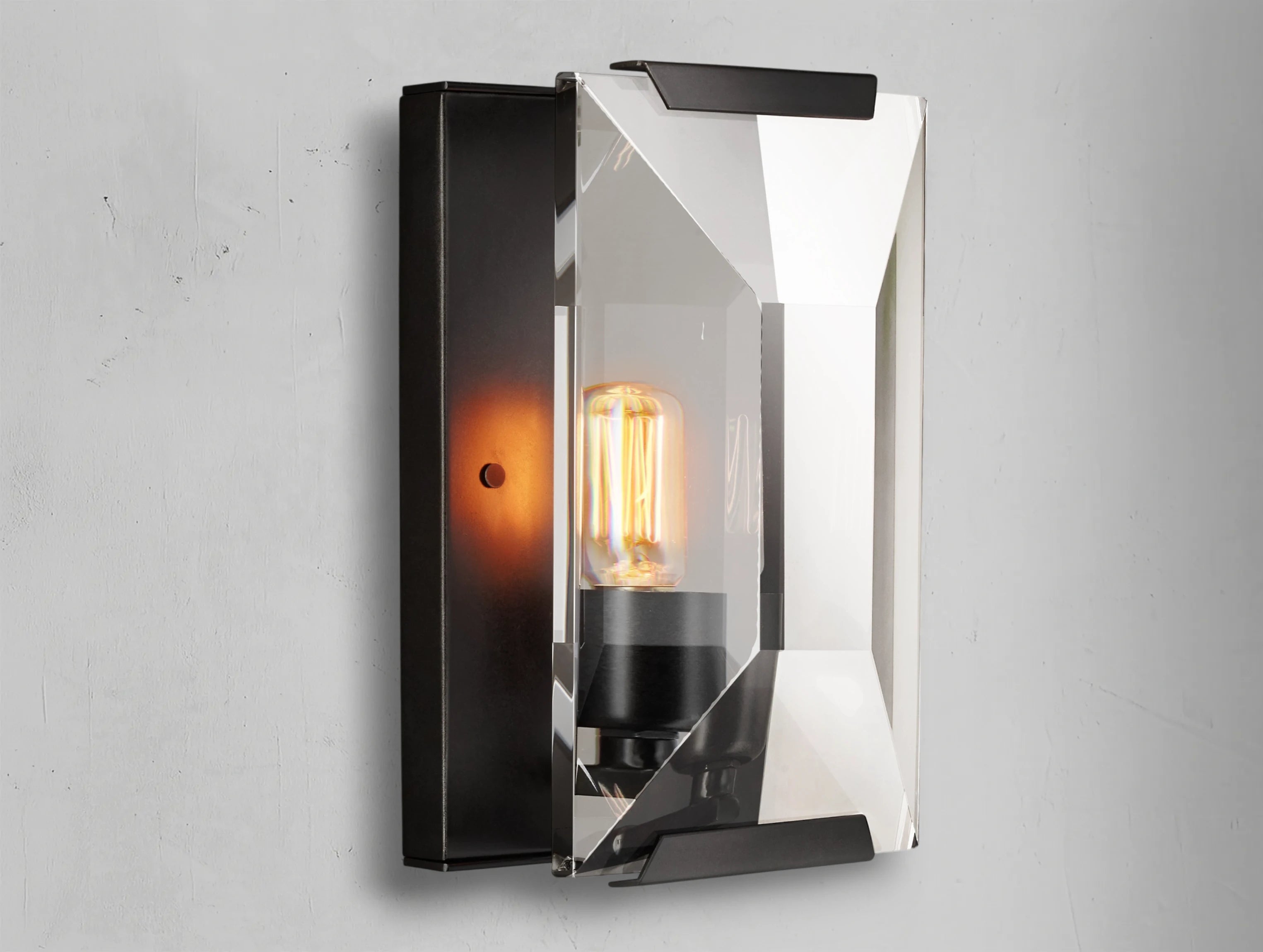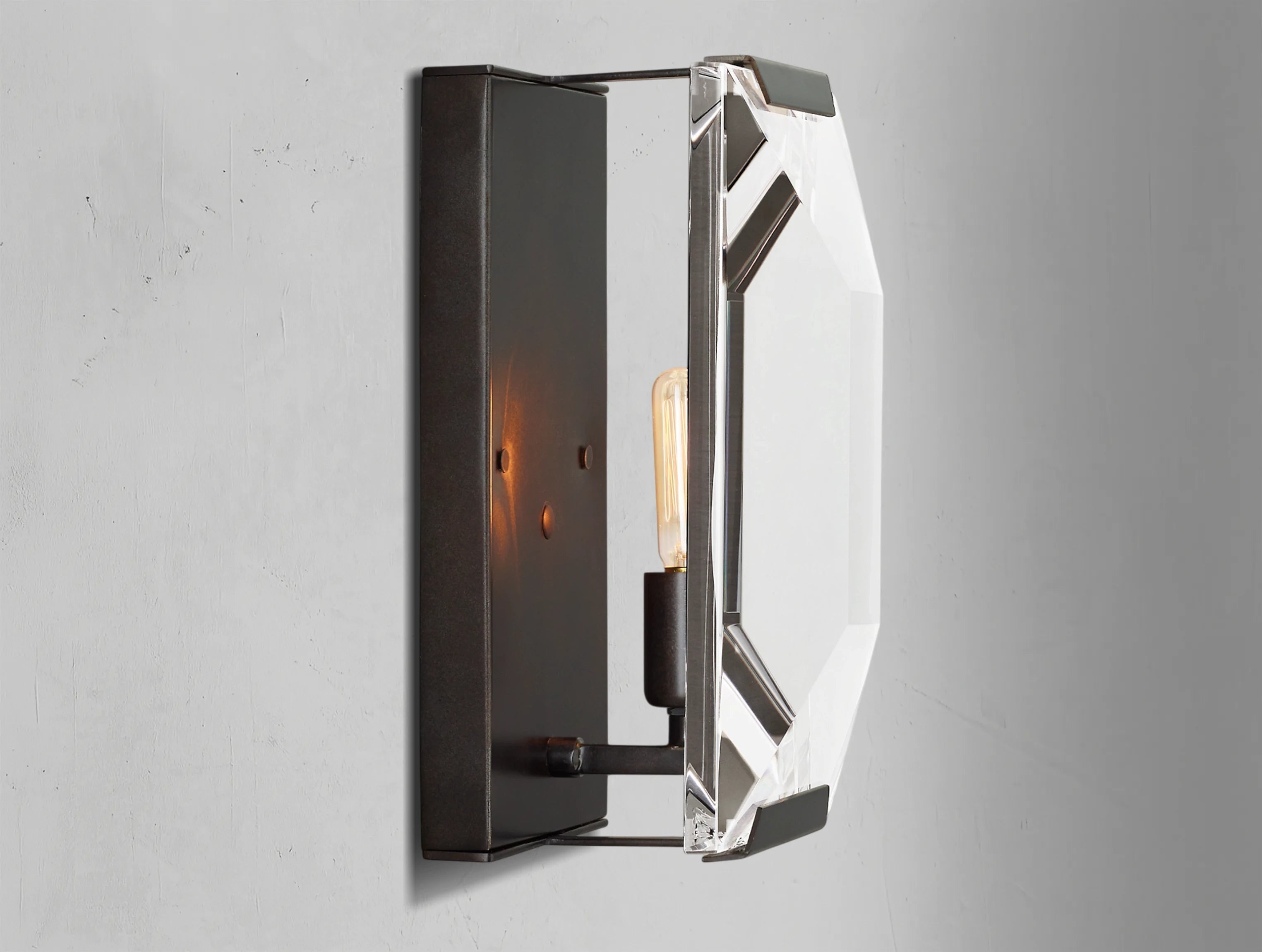 The Valonne Crystal Sconce brings a refined 1970s German influence into modern interiors. Its hand-faceted crystal prism plays with the light, scattering it in a way reminiscent of an emerald-cut gemstone, adding a subtle touch of vintage glamour.